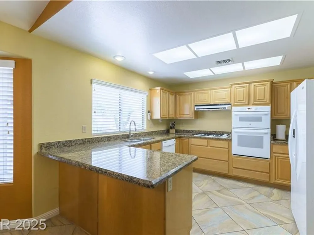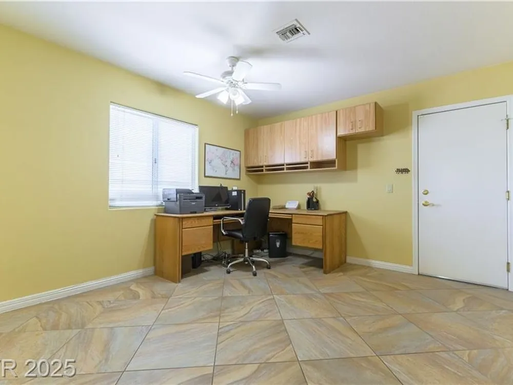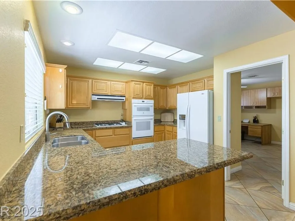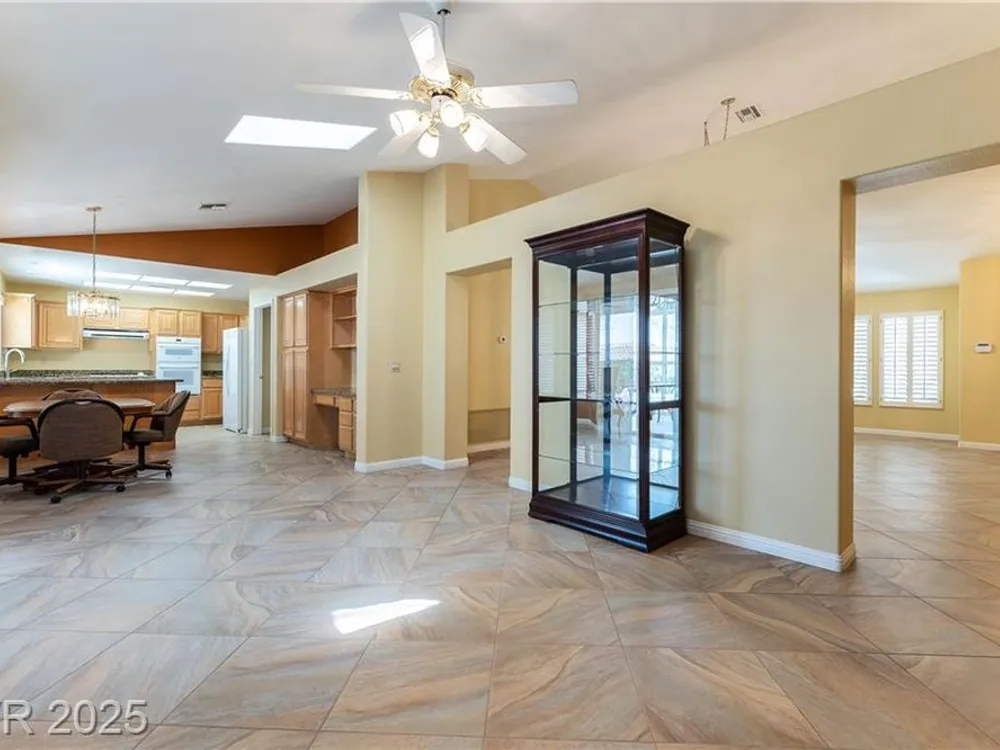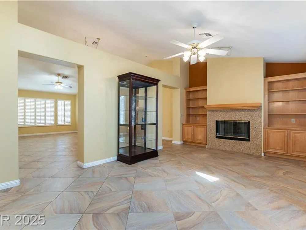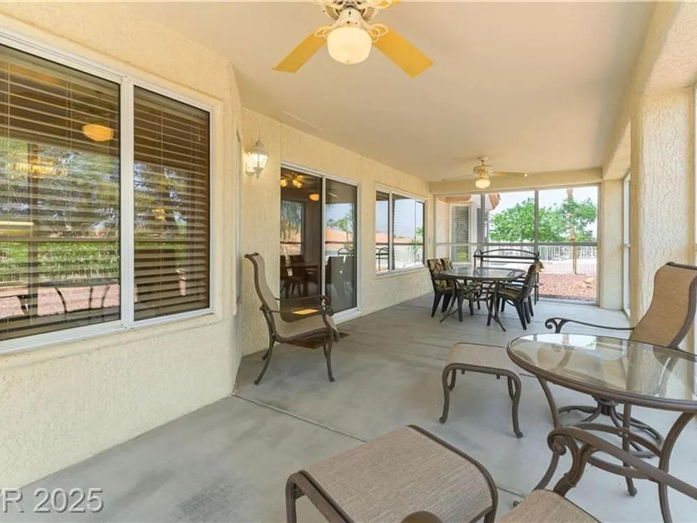 Discover the ultimate in active 55+ living in the heart of Sun City Summerlin! This expanded 1,808 sq ft Silverton home offers 2 spacious bedrooms plus a versatile 3rd room—perfect as an office or guest space. Enjoy 1 full bath and a 3/4 bath, a bright Nevada room with built-in shelves and a cozy gas fireplace, and a large screened-in porch facing east—ideal for morning coffee or relaxing evenings. The kitchen features granite countertops, a built-in oven, a microwave, and a gas cooktop. Ceiling fans throughout keep the space cool, and desert landscaping ensures easy maintenance. The extended 2-car garage with golf cart parking adds space and convenience, with a sewer dump at the driveway for RV owners. Located in a vibrant 55+ community offering golf courses, fitness centers, pools, clubs, and more. Don’t miss this beautifully upgraded home in one of Las Vegas’ most desirable communities! New paint in the living room and Nevada room, and new carpet in the primary bedroom.