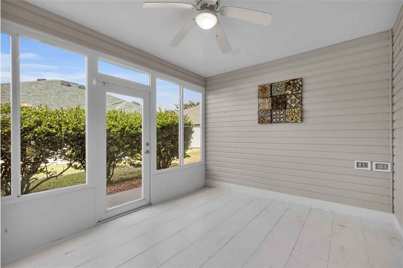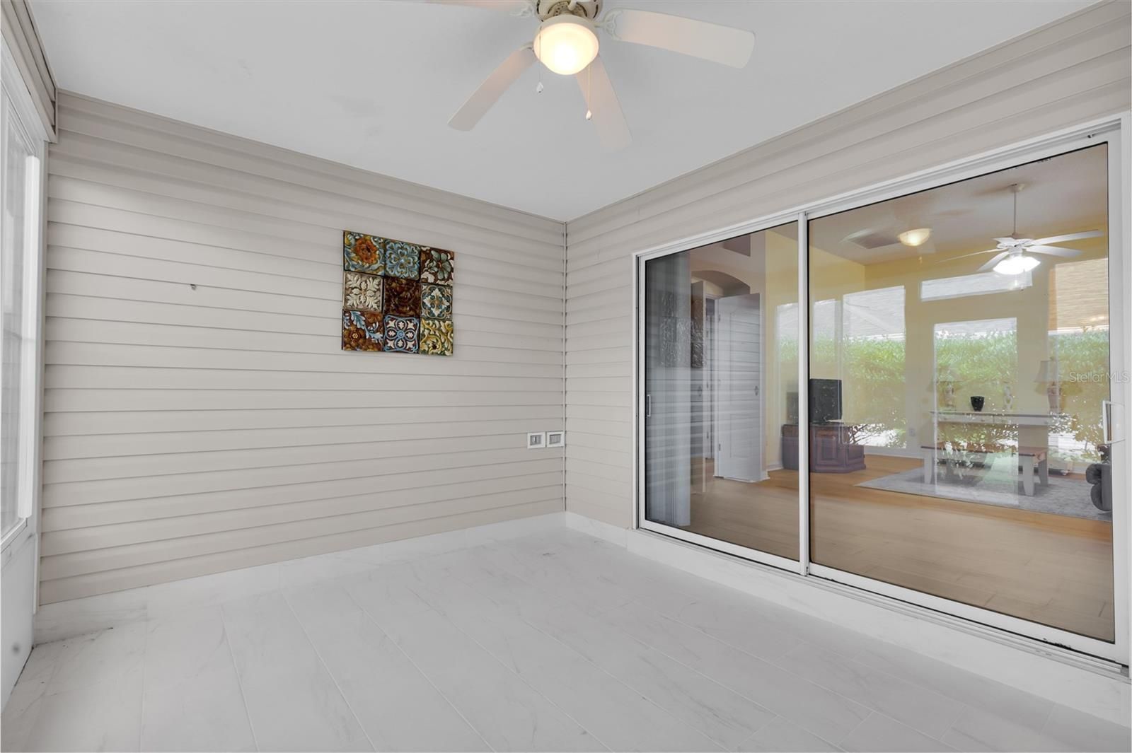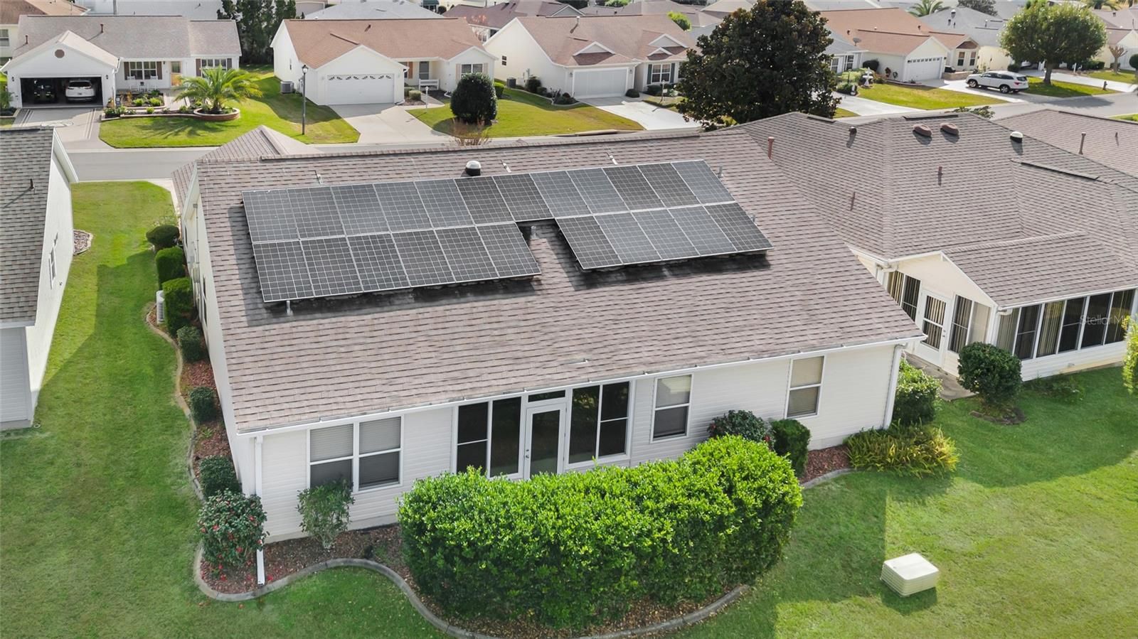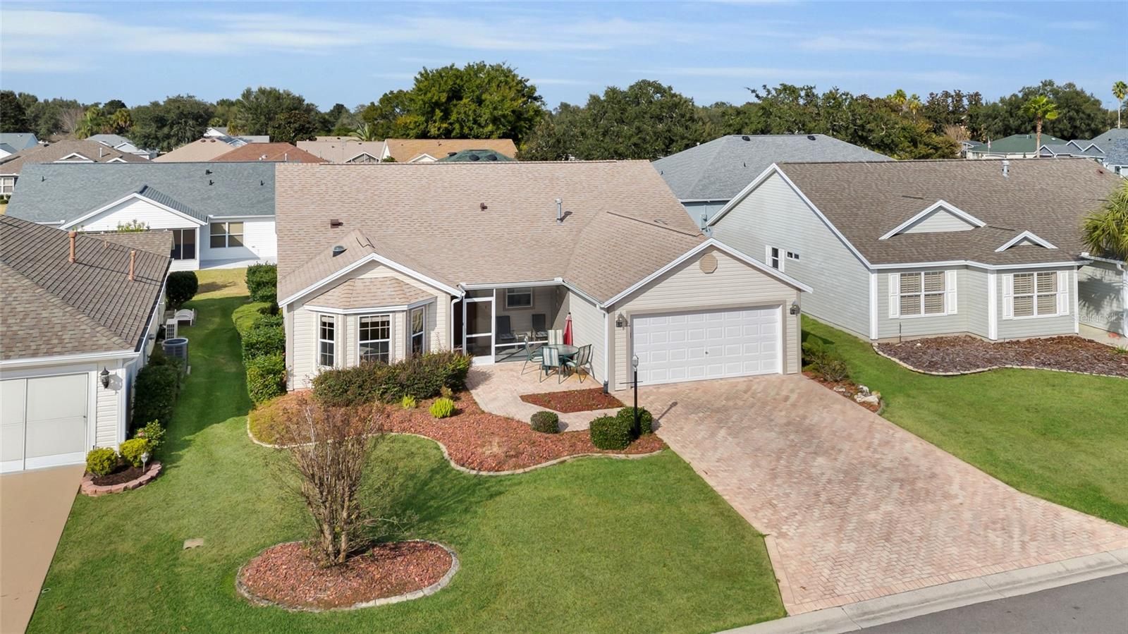 Come check out this beautiful designer Cypress Model home, centrally located within The Villages in The Village of Glenbrook - just minutes to everything. BOND PAID! Roof is 2020, HVAC is 2013. 8.16kw solar panels added in 2021, and fully paid for - adding extra convenience and peace of mind. Master has dual upgraded closet systems added to both walk in closets. There is no carpet in this home. Beautiful kitchen with upgraded stainless appliances, a large eat in space and designer backsplash added in 2024 make cooking a dream, with pull outs in all lower cabinets, granite countertops and storage galore. Large laundry room with the washer/and gas dryer included and an added cabinet for storage. Beautiful paver driveway and front porch, which is also screened in for convenience. Home is equipped with a gas water heater. Every window equipped with push/pull blinds for privacy. Enclosed tiled lanai has acrylic windows for all year use. Garage has a retractable screen door, which allows the ability for additional space for entertaining. This home also has a full canopy 4 person gas golf cart available, that can be negotiated into the purchase.