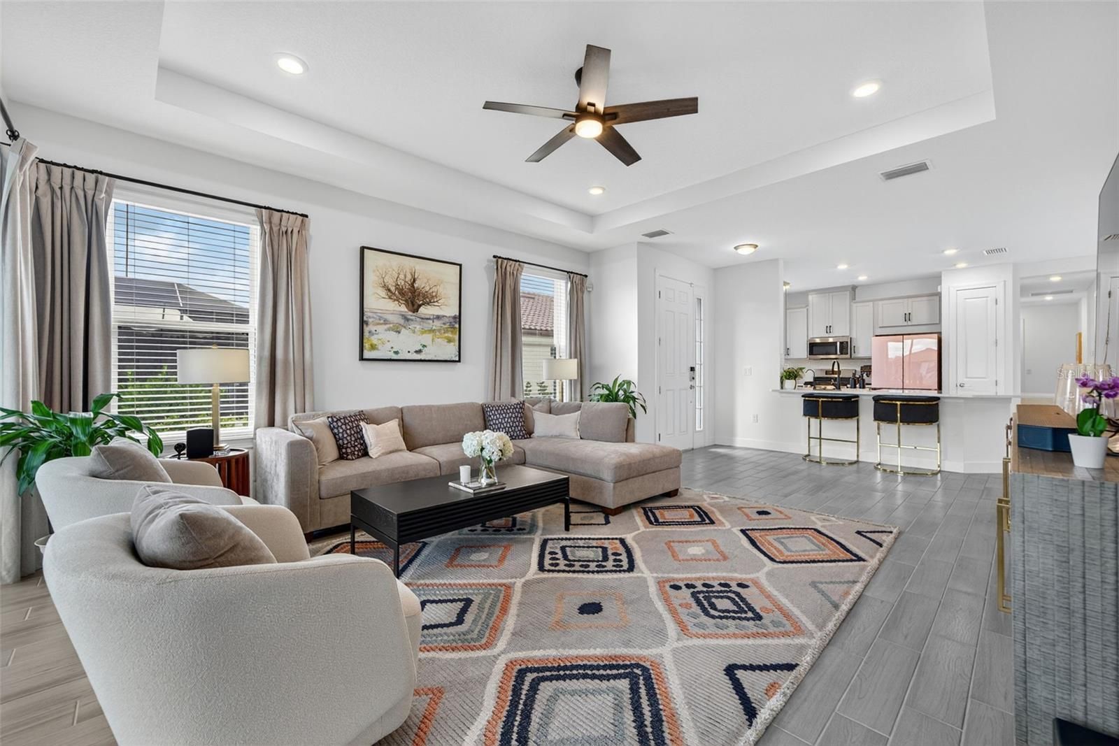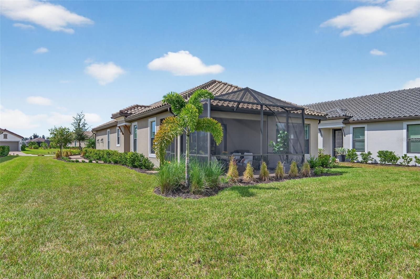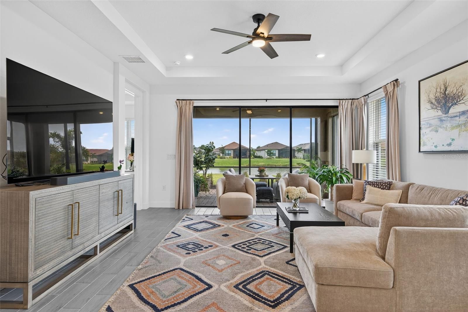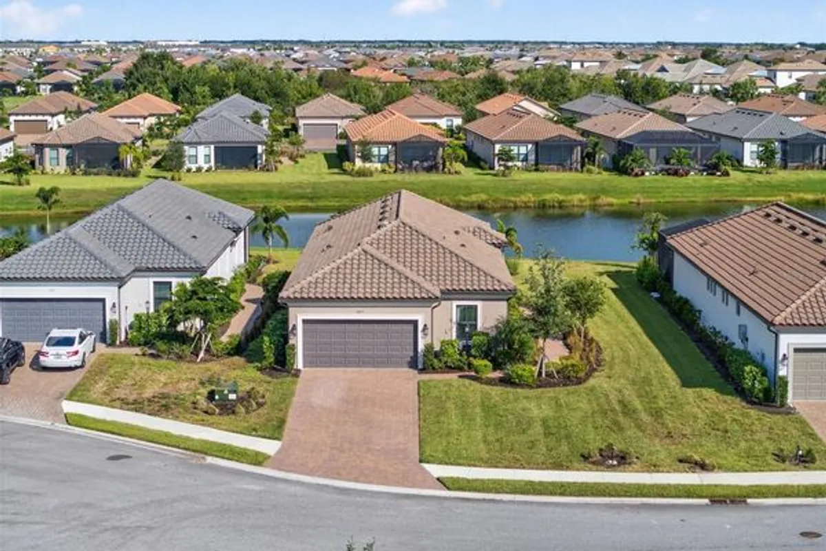 Experience modern luxury and effortless sophistication in this stunning golf-deeded home, located in the highly sought-after community of Esplanade at Azario in Lakewood Ranch. This beautifully designed 3-bedroom + flex space, 2-bathroom residence showcases Taylor Morrison’s highly desired Arezzo floor plan, blending modern comfort with refined architectural detail. The home sits on an oversized lot with an elongated driveway, offering both privacy and curb appeal just a short distance from the amenity center. Inside, natural light fills the open-concept living area with highlighting tray ceilings, 8ft doors, designer tile and plush carpet flooring, and elegant finishes throughout. The chef-inspired kitchen features custom cabinetry, quartz countertops, a farmhouse sink, and a reverse osmosis, water purification, and softening system, ensuring every detail caters to both beauty and function. Retreat to the luxurious primary suite featuring serene lake views, a spa-inspired bathroom with dual vanities, and a spacious walk-in shower. The flex room provides versatility—perfect for a home office, media room, or guest retreat. Step through glass sliders to your screened lanai, where tranquil water views and lush landscaping create the perfect setting for morning coffee or evening gatherings. Additional upgrades include natural gas, a two-car garage, and maintenance-free living for ultimate peace of mind. Beyond your doorstep, Azario’s resort-style amenities set the standard for luxury living—featuring a championship golf course, resort-style and lap pools, wellness spa, fitness center, tennis and pickleball courts, a culinary center, 3 restaurants additionally a cafe for your morning walk with coffee and a vibrant social calendar. Ideally located within Lakewood Ranch—America’s #1 best-selling multigenerational community—you’re minutes from world-class beaches, dining, shopping, and entertainment at University Town Center, Waterside Place, and downtown Sarasota.