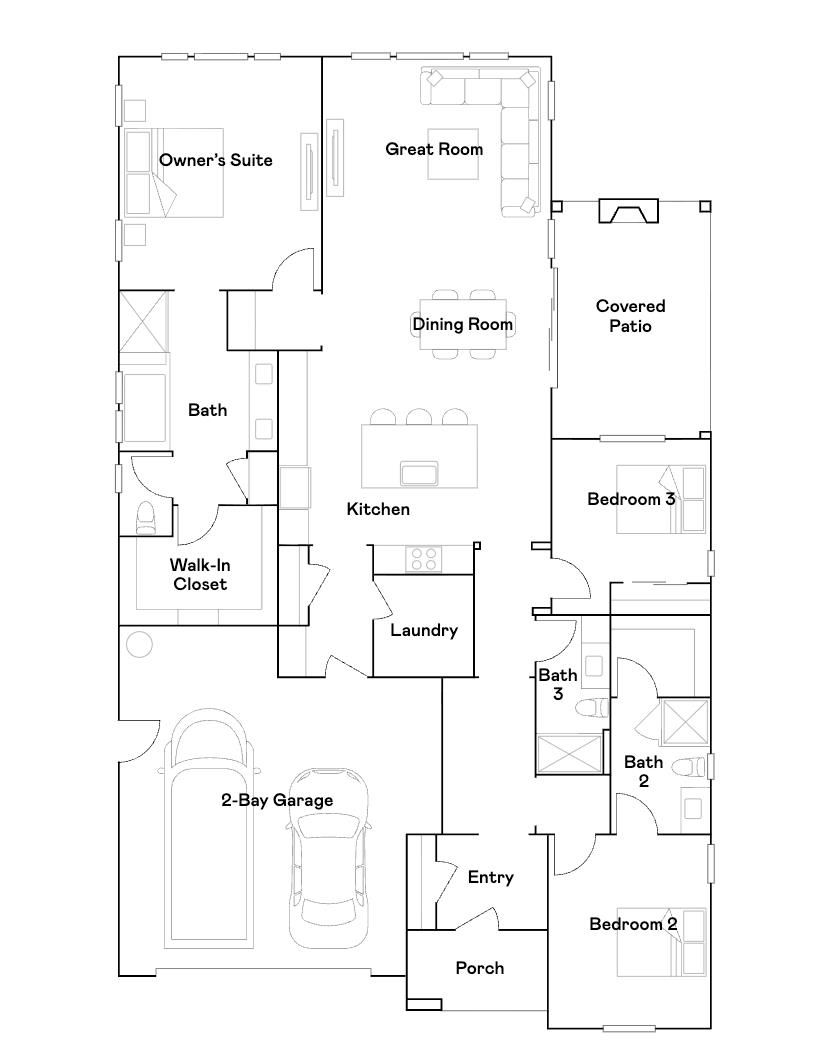 This single-story home shares an open layout between the kitchen, dining room and Great Room for easy entertaining, along with access to a covered patio for year-round outdoor lounging. There are two secondary bedrooms, one with an en-suite bathroom, ideal for overnight guests or residents needing additional privacy. A luxe owner's suite is in the rear of the home and comes complete with an en-suite bathroom and walk-in closet.