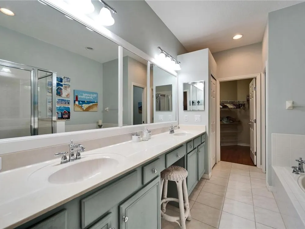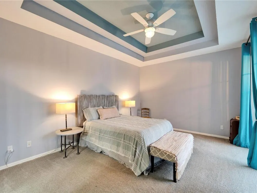 - Ceiling Fan(s), Coffered Ceiling(s), Crown Molding, Eat-in Kitchen, Kitchen/Family Room Combo, Living/Dining Room, Open Floorplan, Main Level Primary, Solid Surface Counters, Solid-Wood Cabinets, Stone Counters, Thermostat, Tray Ceiling(s), Walk-In Closet(s), Window Treatments