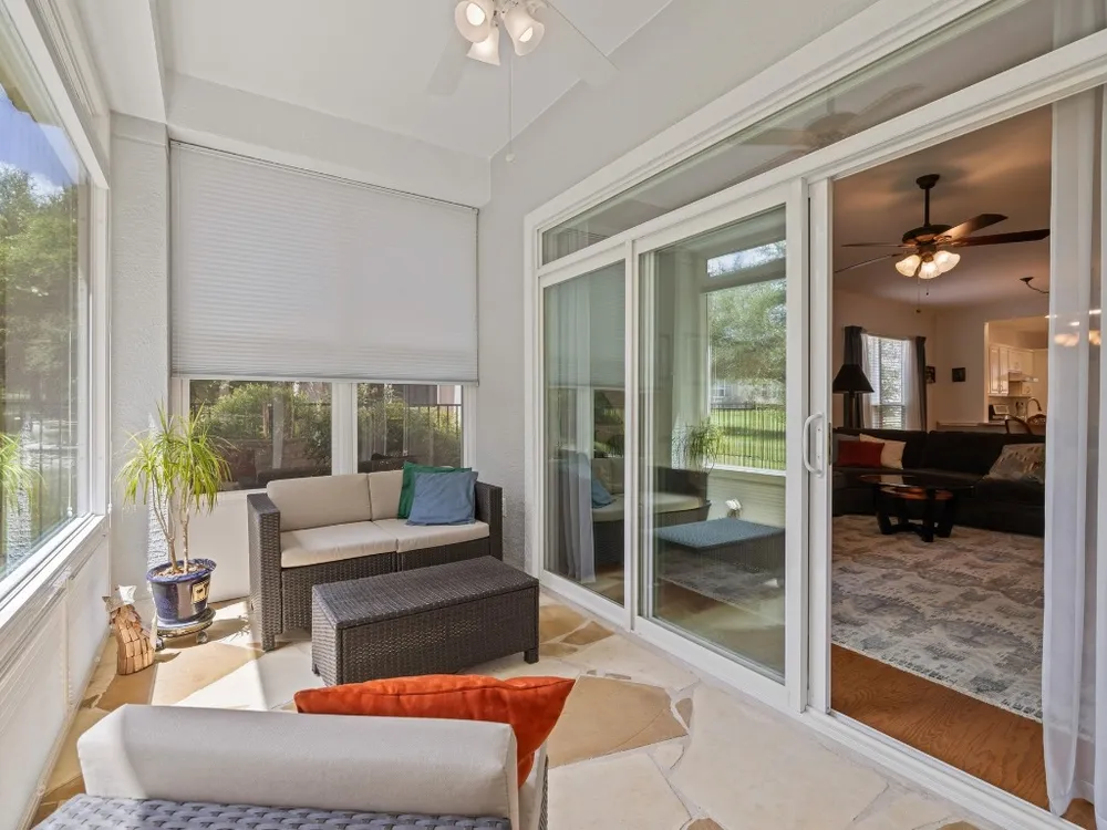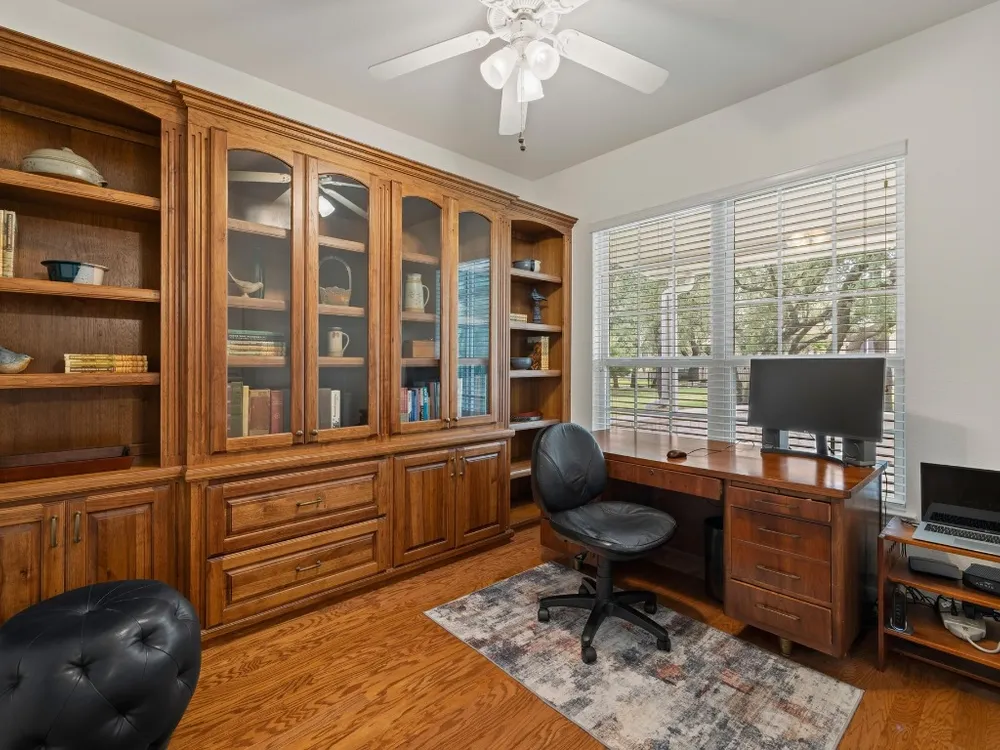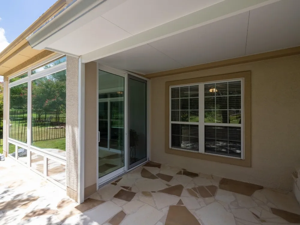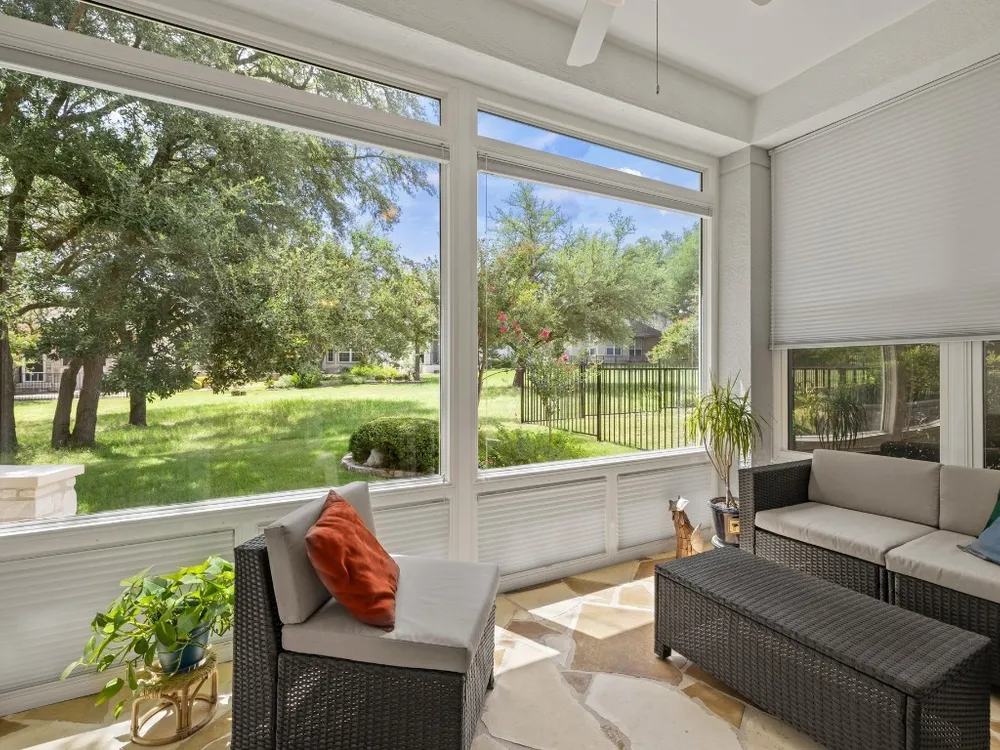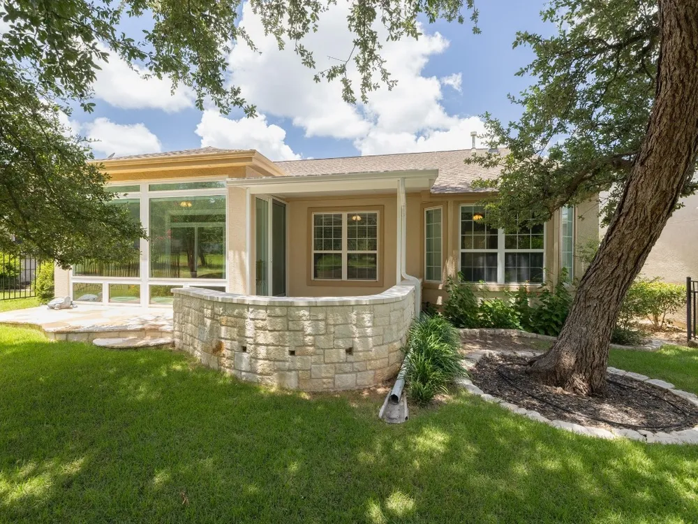 NEW ROOF INSTALLED SEPTEMBER 2025! Welcome to this well-designed Andover floor plan located in the vibrant 55+ community of Sun City Georgetown, TX. The two-bedroom, two-bathroom home includes a dedicated study with comfort and function throughout. As you enter, you will be greeted with beautiful wood floors, high ceilings, and abundant natural light throughout. This home offers open concept living with the kitchen overlooking a large dining space, spacious living room and sunroom. The kitchen features quartz countertops, full-extension pull-out shelves, pull-out shelves in all lower cabinets, a mobile island with trash/recycling bin, upgraded stainless steel appliances including a Bosch 3-tray dishwasher, LG 5-burner gas range with a 5-speed vent hood, and counter-depth refrigerator. The kitchen offers a large dinette space, perfect for sit-down meals or entertaining. The living room offers plenty of room to host family or friends. Just off the living room, the 4-season sunroom is a bright and relaxing space to enjoy views of the oak grove and natural landscape behind the home while staying cool indoors (HVAC services house and sunroom). Enter the backyard through the sunroom onto a covered stone patio. The primary bedroom is located at the back of the house. Inside you will find a spacious bedroom with a great bay window that offers additional space for furniture. Also find an impressive walk-in closet with a large storage closet within. The primary bathroom offers a dual vanity sink, a walk-in shower, and a separate garden tub. Find the attached 2-car garage with a 4-ft extension. Sun City amenities include three golf courses, multiple fitness centers, indoor/outdoor pools, tennis and pickleball courts, walking trails, and dozens of clubs and social activities. The community features on-site restaurants, a huge woodshop, photo/arts and crafts studios, a community garden, a dog park, and a full calendar of events to stay engaged and connected.