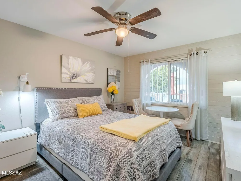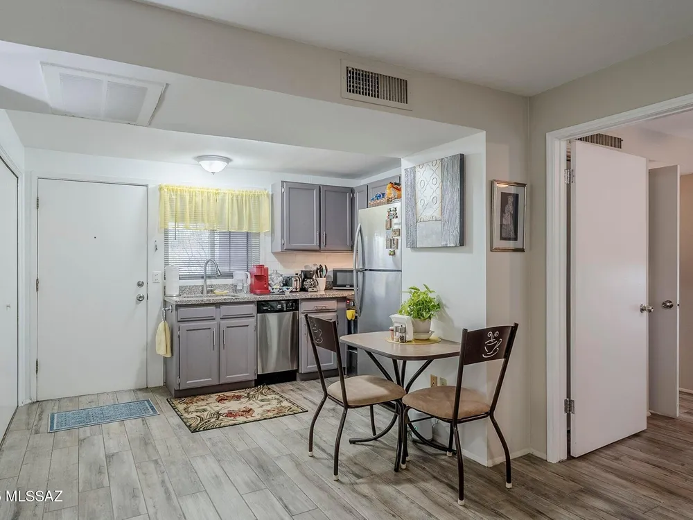 This beautifully remodeled condo offers stylish, low-maintenance living, w/ modern touches throughout. Featuring wood-look tile flooring, tasteful gray and white paint tones, granite countertops, and stainless steel appliances. This home is super cute and move-in ready!Updated w/ dual pane windows, wrought iron security doors (front and back), and a covered back patio, w/ a storage shed and your own washer and dryer. Your designated parking spot is conveniently located right in front of the unit, w/ no stairs and easy ramp access.The HOA takes care of the roof, HVAC system, water, sewer, and trash, allowing you to focus on enjoying life. Located near shopping, dining, and easy freeway access, you're never far from what you need. This is resort-style living in a 55+ community w/ GVR.