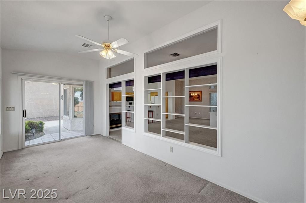 Located in the highly sought-after 55+ community of Sun City Summerlin, this 2-bedroom + den, 2-bath home offers 1,695 sq. ft. on an elevated lot. The bright, open floor plan features a spacious living room with a cozy fireplace and ceiling fans in every room. The kitchen boasts a charming nook with a lovely view of the backyard. The primary suite includes a private bath, while the den offers flexibility for an office or guest space. A 2-car garage provides built-in storage. Enjoy incredible community amenities, including golf courses, pools, fitness centers, social clubs, and more. Experience the best of active living in this vibrant neighborhood with nearby shopping, dining, and entertainment!
