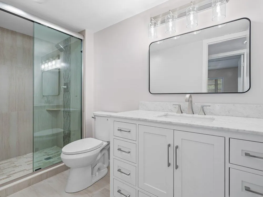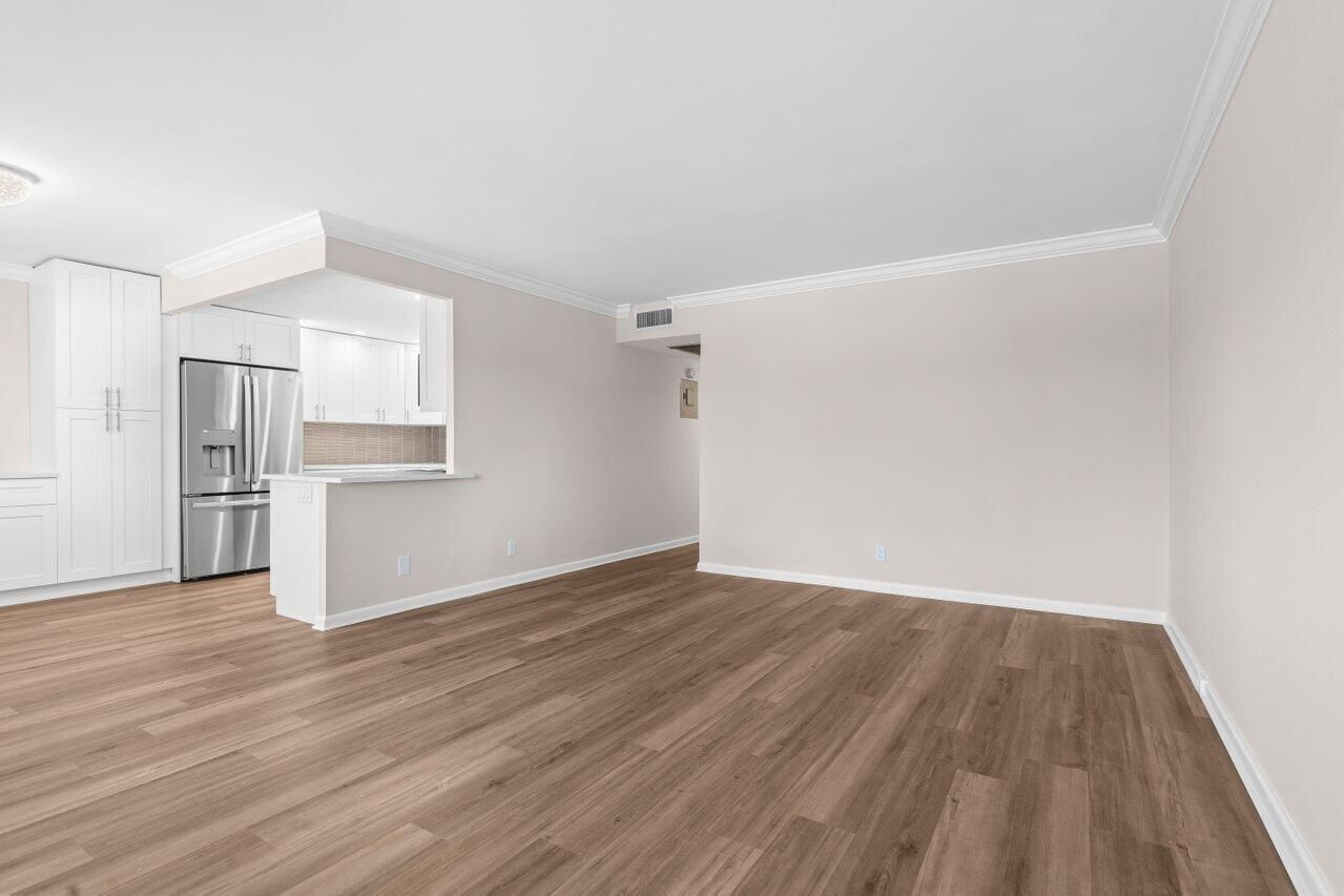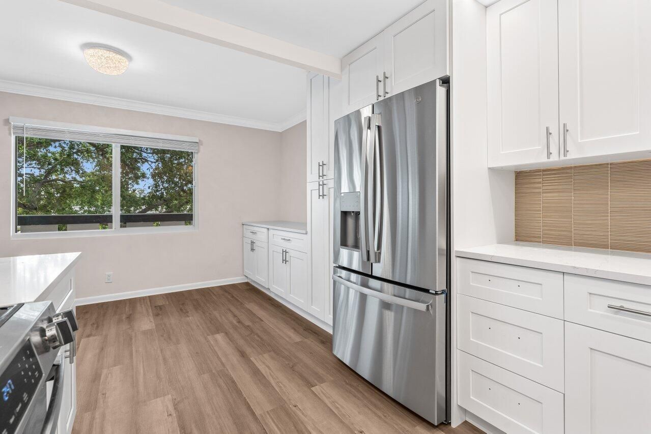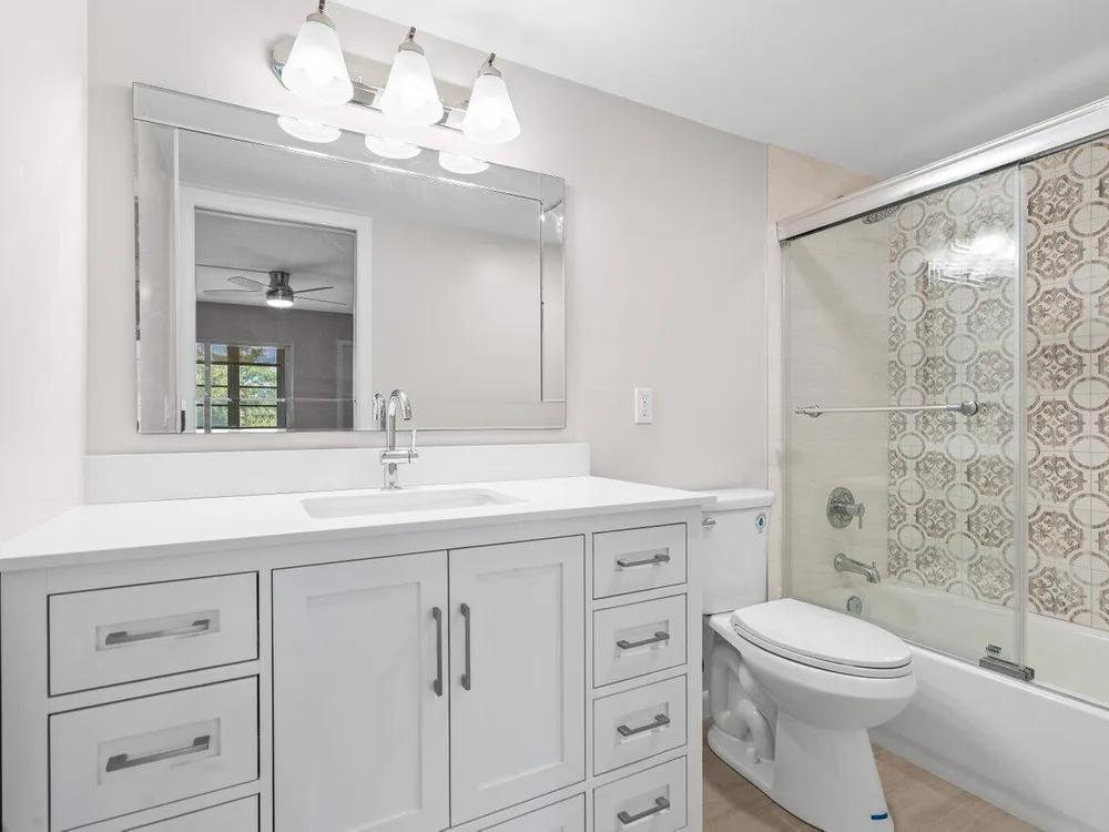 Beautiful updates in this pristine two bedroom and full two bath unit. Located in the BEST luxury building of Century Village East. New Roof. No assessments. All inspections completed. Reserves met. New impact windows and doors throughout. Open kitchen concept with white shaker cabinets, brand-new, stainless-steel GE appliances, quartz countertops, and glass tile backsplash. Top of the line wood-look laminate flooring. Freshly painted with elegant and neutral high-end paint. No Popcorn on ceilings. Primary room has large walk-in closet with custom built-ins and fully updated ensuite bathroom with glass shower doors. Guest bathroom is also fully updated. Spacious second bedroom with both rooms leading out to your private enclosed Patio