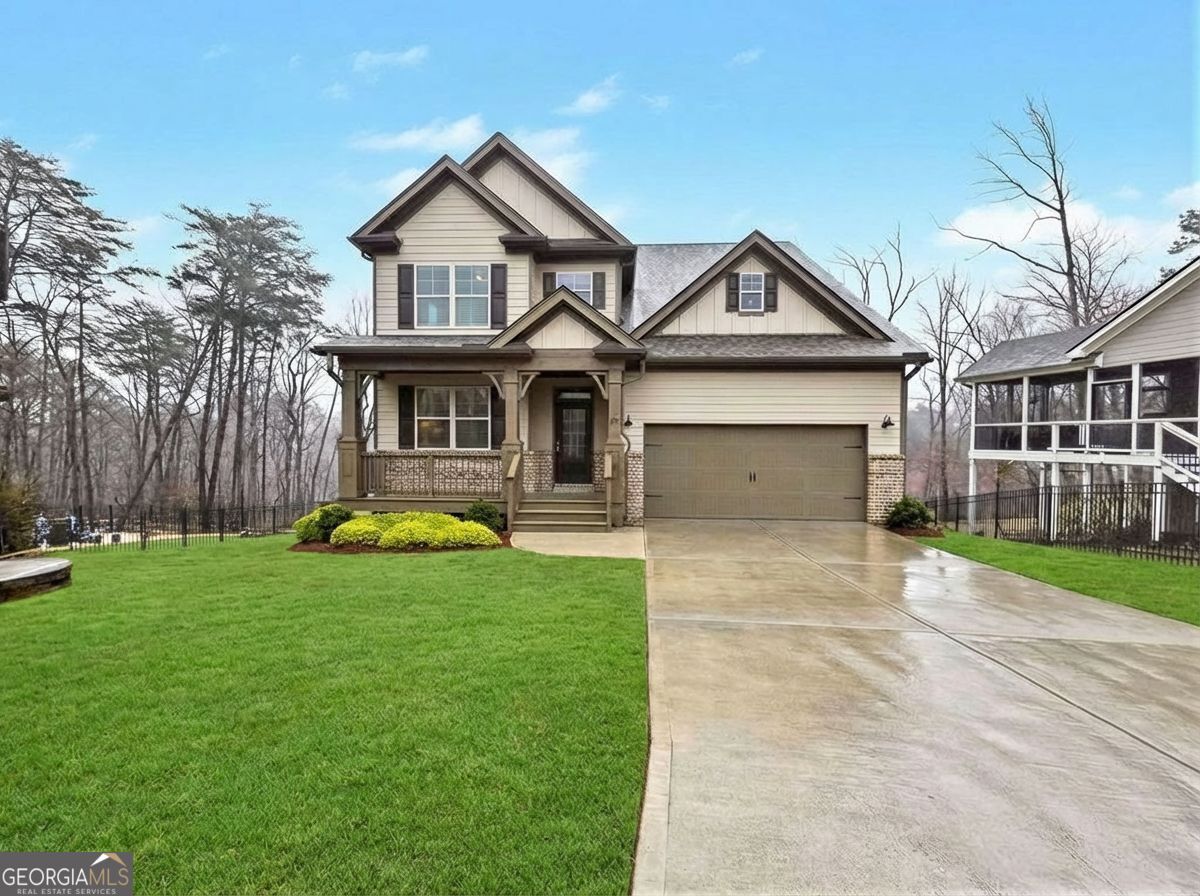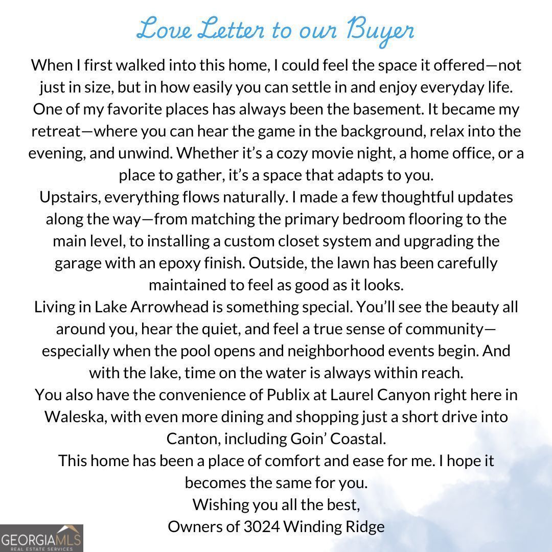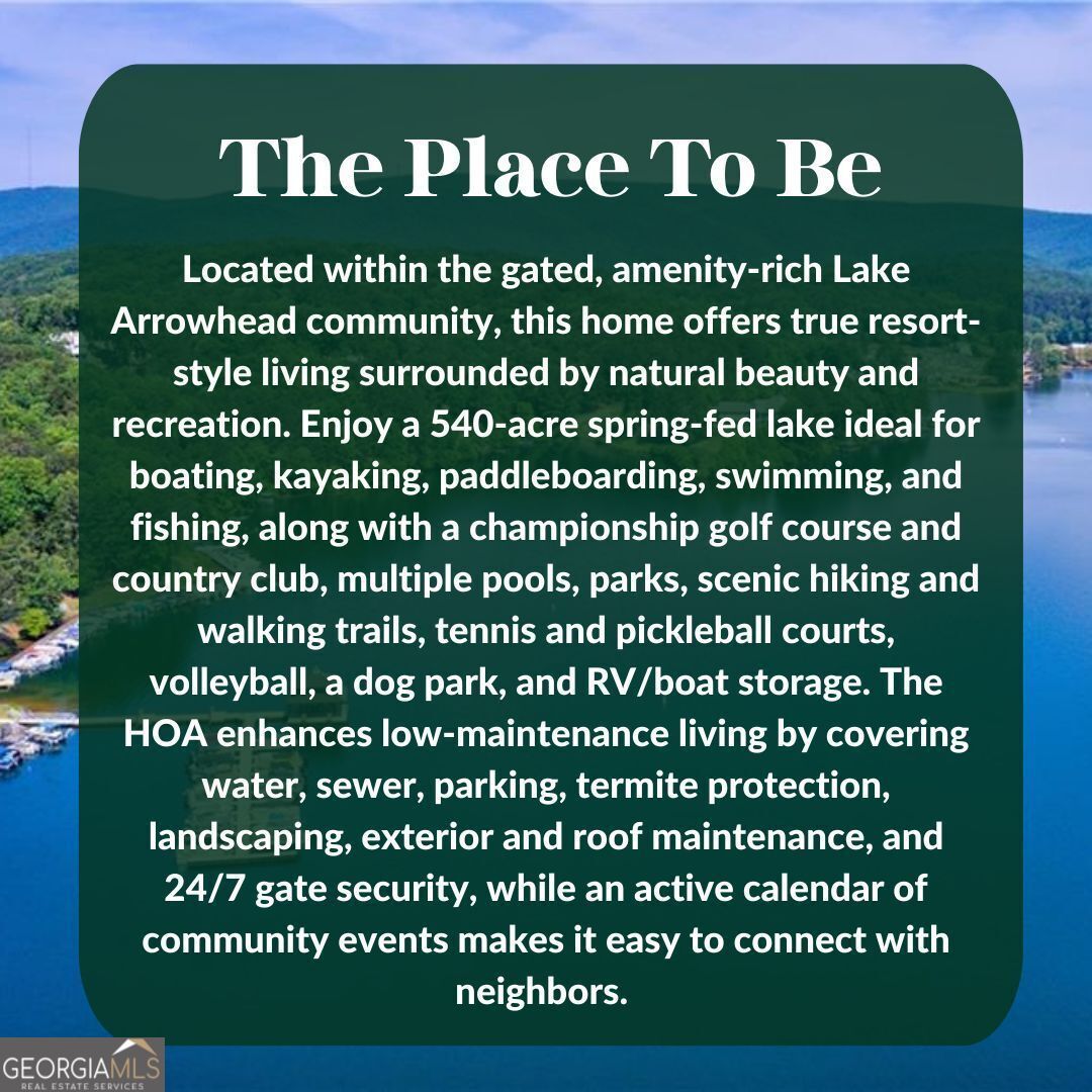 || RECENTLY APPRAISED || CUL-DE-SAC PRIVACY WITH MOUNTAIN + WOODED VIEWS || PRIMARY SUITE ON MAIN || FINISHED TERRACE LEVEL WITH 10' CEILINGS || PROFESSIONALLY UPGRADED THROUGHOUT || LEVEL DRIVEWAY + KITCHEN-LEVEL GARAGE || LAKE ARROWHEAD LIFESTYLE || Tucked away at the end of a quiet cul-de-sac in Lake Arrowhead, this home offers something that's getting harder to find-privacy, space, and a true connection to the outdoors. From the moment you arrive, you'll notice the setting. MOUNTAIN VIEWS IN THE FRONT AND PRIVATE WOODED VIEWS IN THE BACK create a peaceful backdrop that changes with the seasons. Inside, the layout is both functional and flexible, featuring a PRIMARY SUITE ON THE MAIN LEVEL and multiple living spaces designed to grow with you. The main level flows easily with LVP flooring, a spacious kitchen with ISLAND, WALK-IN PANTRY, AND STONE COUNTERS, and natural light that fills the home throughout the day. Upstairs, additional bedrooms provide separation and comfort, while the FINISHED TERRACE LEVEL WITH 10' CEILINGS opens up even more possibilities. Downstairs is where this home really separates itself-A LARGE RECREATION ROOM, FULL BEDROOM + BATH, MULTIPLE WORKSHOPS, AND EXTENSIVE STORAGE. Whether you need space for hobbies, a home gym, or simply want room to spread out, it's already here-and professionally finished and permitted. Everyday details have been thoughtfully upgraded: EPOXY GARAGE FLOORS, EV CHARGER (220V), CUSTOM PRIMARY CLOSET SYSTEM, AND A PROFESSIONALLY MAINTAINED LAWN. Plus, the LEVEL DRIVEWAY AND KITCHEN-LEVEL GARAGE make daily living easy. And beyond the home, the lifestyle takes over-boating on a clean mountain lake, golf, pools, tennis, pickleball, hiking trails, and a marina-all right inside your gated community. If you've been waiting for a home that offers SPACE, PRIVACY, AND ACCESS TO ONE OF NORTH GEORGIA'S MOST UNIQUE LIFESTYLES, this one stands out in all the right ways.