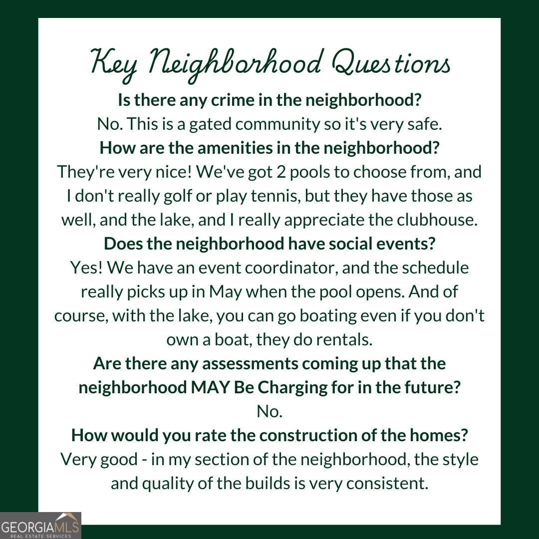 The following amenities are available to Lake Arrowhead - Cherokee County, GA residents: