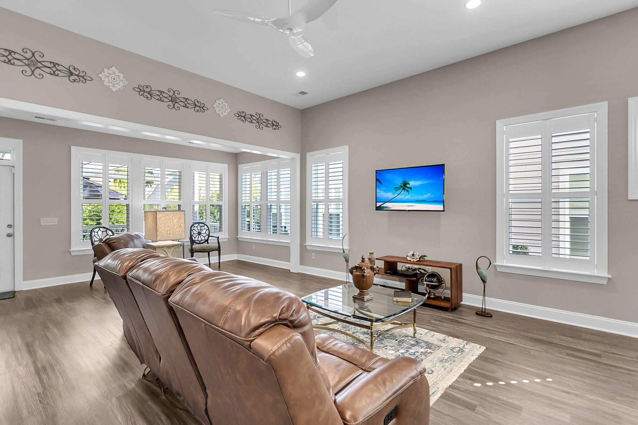 - Smooth Ceilings, Tray Ceiling(s), High Ceilings, Kitchen Island, Walk-In Closet(s), Eat-in Kitchen, Entrance Foyer, Living/Dining Room, Sunroom