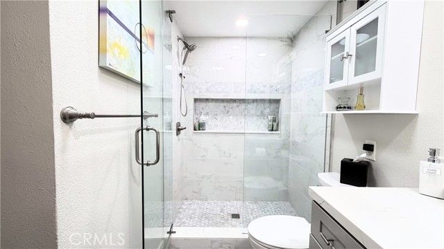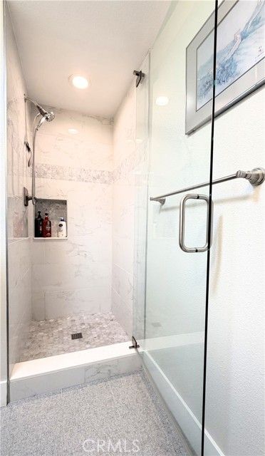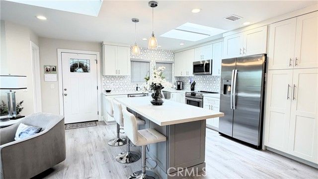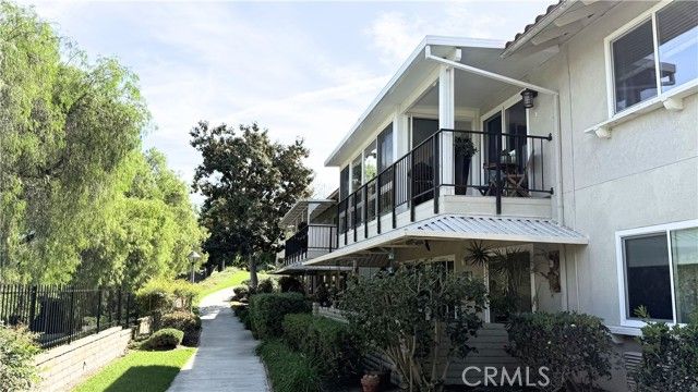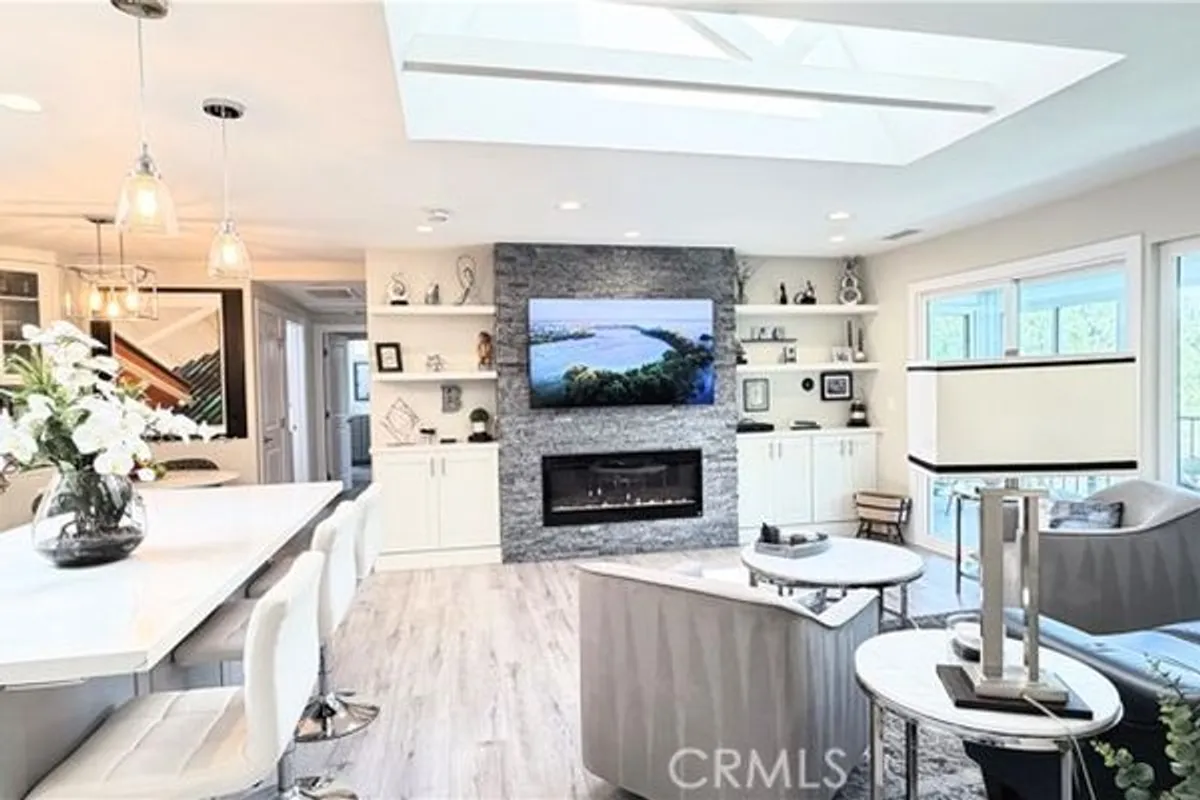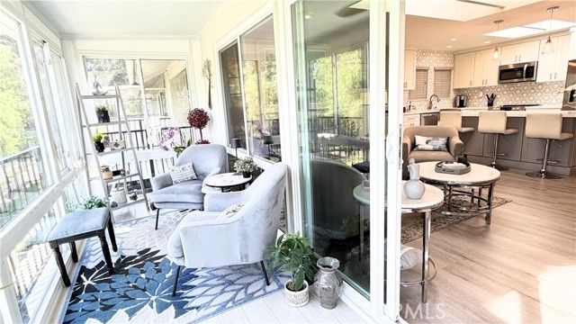 SOPHISTICATED MODERNIZED PRIVATE END-UNIT WITH A VIEW, offering the rare advantage of NO STAIRS AND NO ONE ABOVE, is situated in Laguna Woods, South Orange County’s most coveted 55+ community. NO EXPENSE WAS SPARED in this elegant transformation of the popular “Casa Del Mar” floor plan. This premier residence features seamless accessibility, private in-home laundry, and the convenience of covered carport. Nestled in the highly sought-after Phase 3 behind Gate 7, this condo provides a quiet sanctuary within walking distance to local shopping, dining, tennis, and golf, and is fully equipped with central air conditioning and heating. The interior is bathed in natural light, courtesy of dual skylights and solar tubes that create a bright, airy ambiance throughout. This modern residence showcases designer waterproof flooring and high-end porcelain tile in both bathrooms. The gourmet kitchen with professional-grade quartz counters complemented by a walk-in shelved pantry for ultimate storage , plus premium stainless steel appliances, and custom modern cabinetry. The living room serves as a striking focal point, featuring a custom built-in entertainment center with an integrated electric fireplace, architectural shelving, and professional pre-wiring for a seamless media experience. The primary suite is a true retreat, offering an expansive walk-in closet and a spa-inspired bathroom with a large executive shower. Beyond the abundant recessed lighting and refined finishes, the home extends to a private, enclosed patio with elegant porcelain tiling overlooking the tennis club. This is a rare opportunity to own a high-end, turnkey remodel in the community’s most premier and convenient location. Laguna Woods Village is a guard-gated, 55+ private golf resort-style community offering an unparalleled lifestyle, where you can enjoy championship golf courses, tennis, resort-style pools, state-of-the-art fitness centers, and an exceptional array of social clubs (200+) and cultural amenities. It is ideally located just minutes from the iconic shores of Laguna Beach.