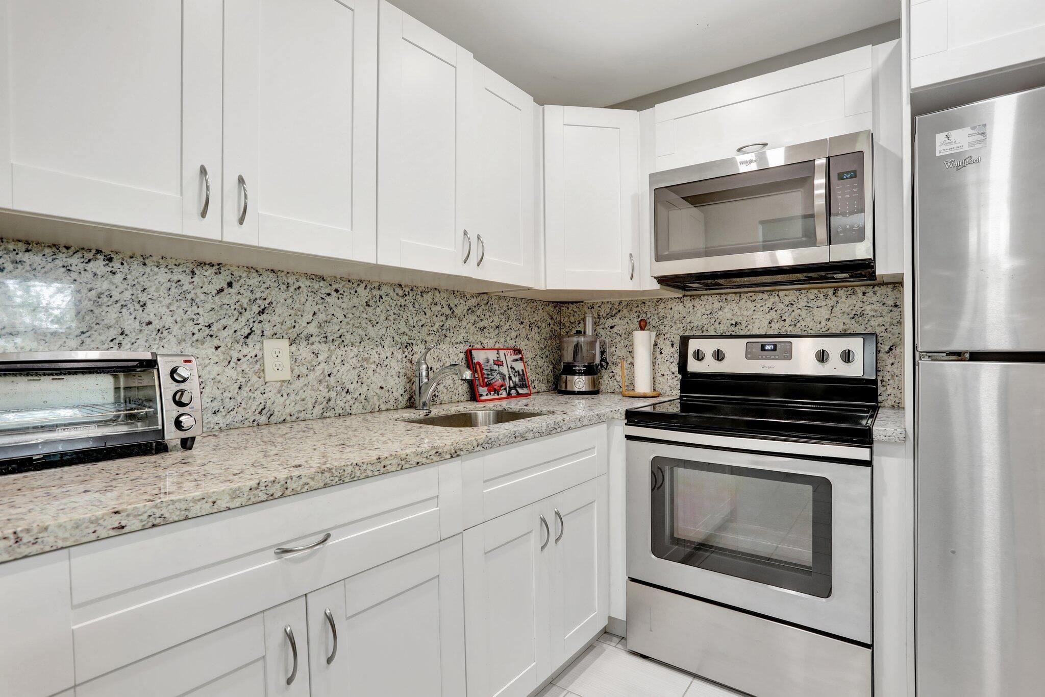 A tastefully updated 1-bedroom, 1.5-bath condo nestled in the highly sought-after Berkshire B building of Century Village East, Deerfield Beach. This light and bright unit, white shaker cabinets, granite countertops and backsplash, and stainless steel appliances. Ceramic tile flooring runs throughout the space. Enclosed patio complete with hurricane shutters. New A/C in 2022. Vibrant 55+ gated community offering resort-style living with free shuttle transportation, a state-of-the-art clubhouse, fitness center, classes, clubs, live entertainment, and even free movies. Take a dip in the pool or join friends for community events - all within walking distance of your front door! Deerfield Beach is a charming coastal city known for its pristine beaches, award-winning restaurants, shopping.