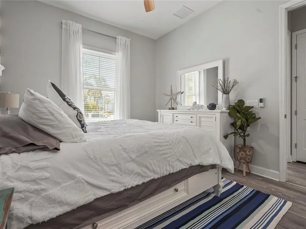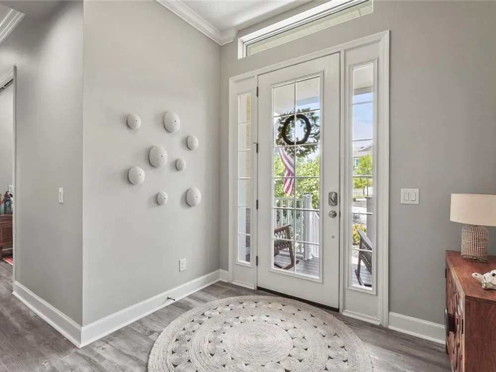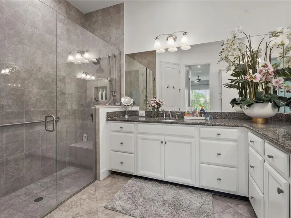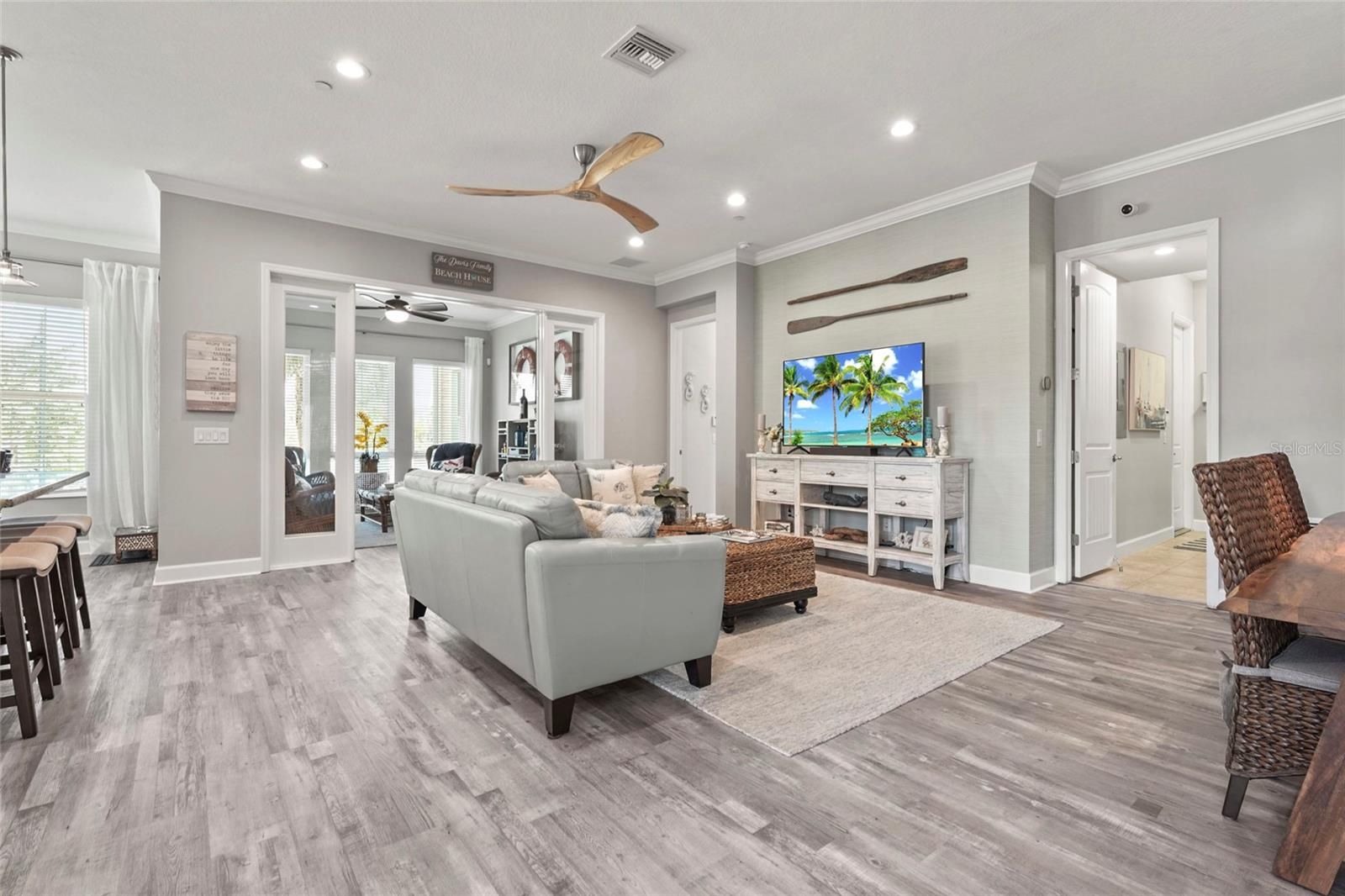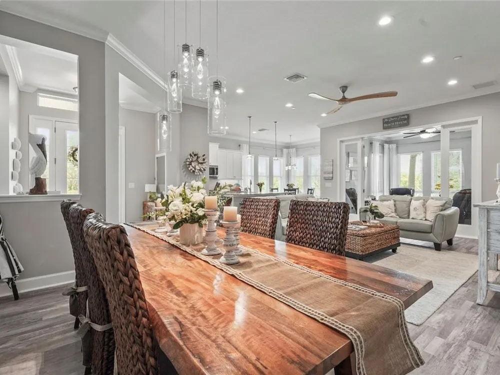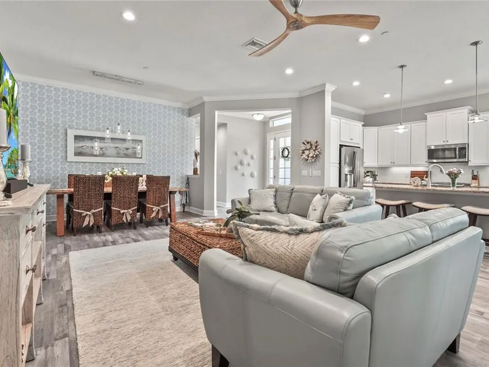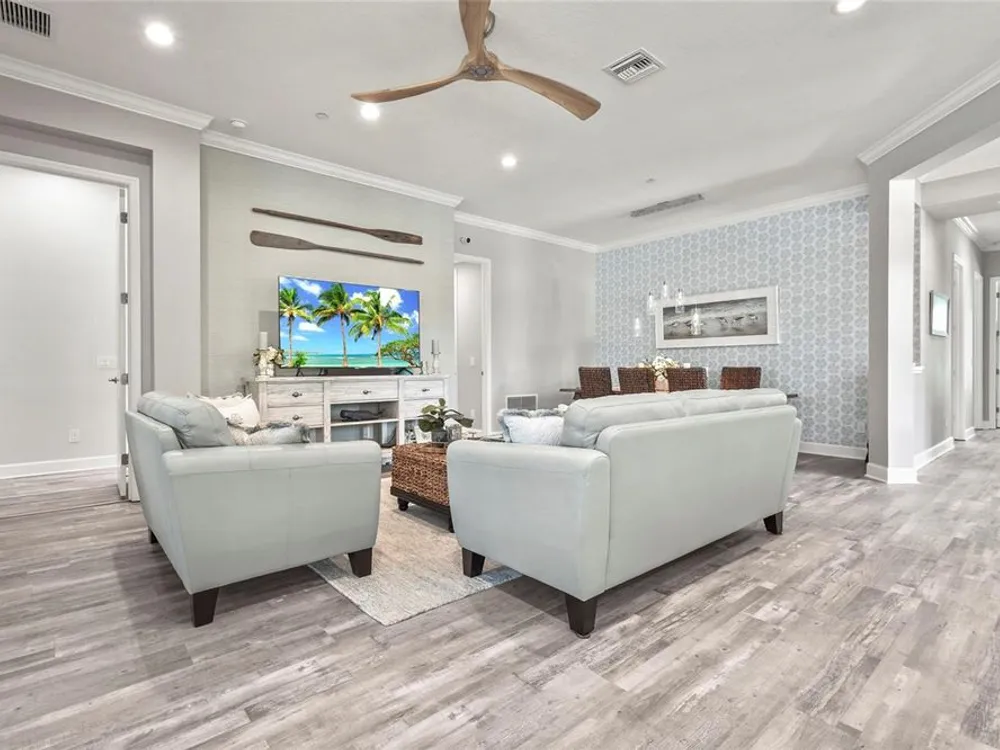 - Ceiling Fan(s), Crown Molding, High Ceilings, Living/Dining Room, Open Floorplan, Main Level Primary, Solid Surface Counters, Stone Counters, Thermostat, Walk-In Closet(s)