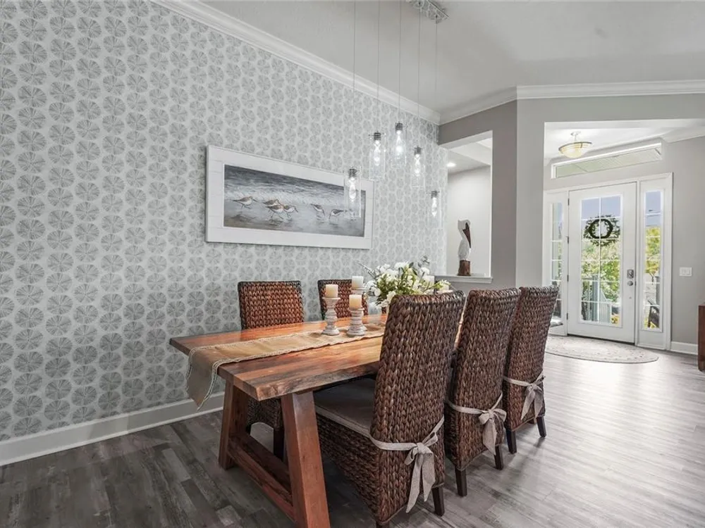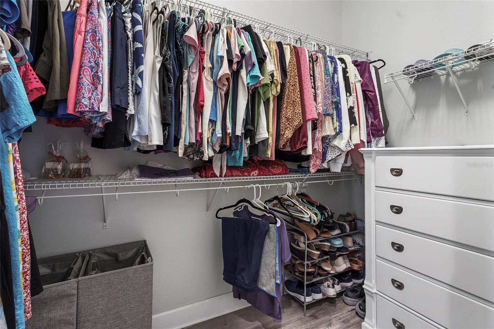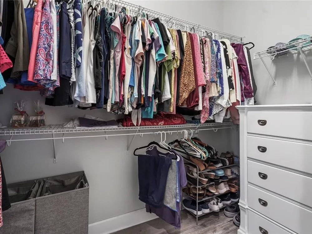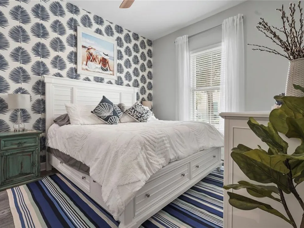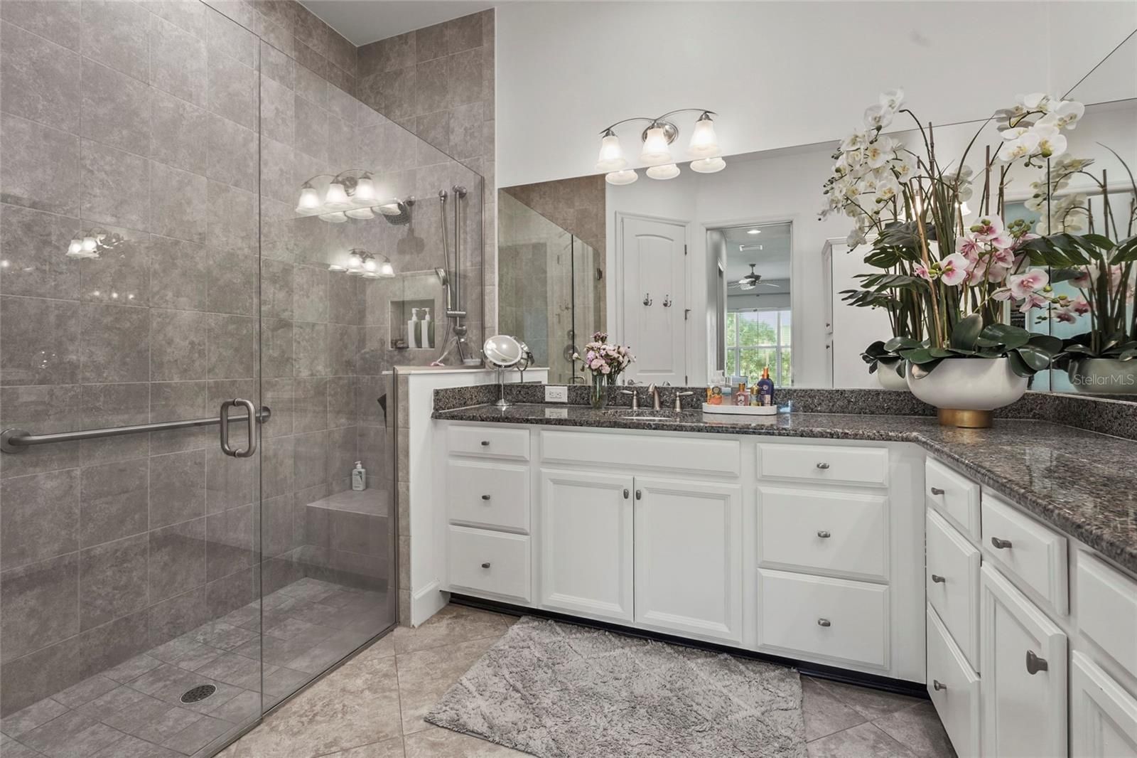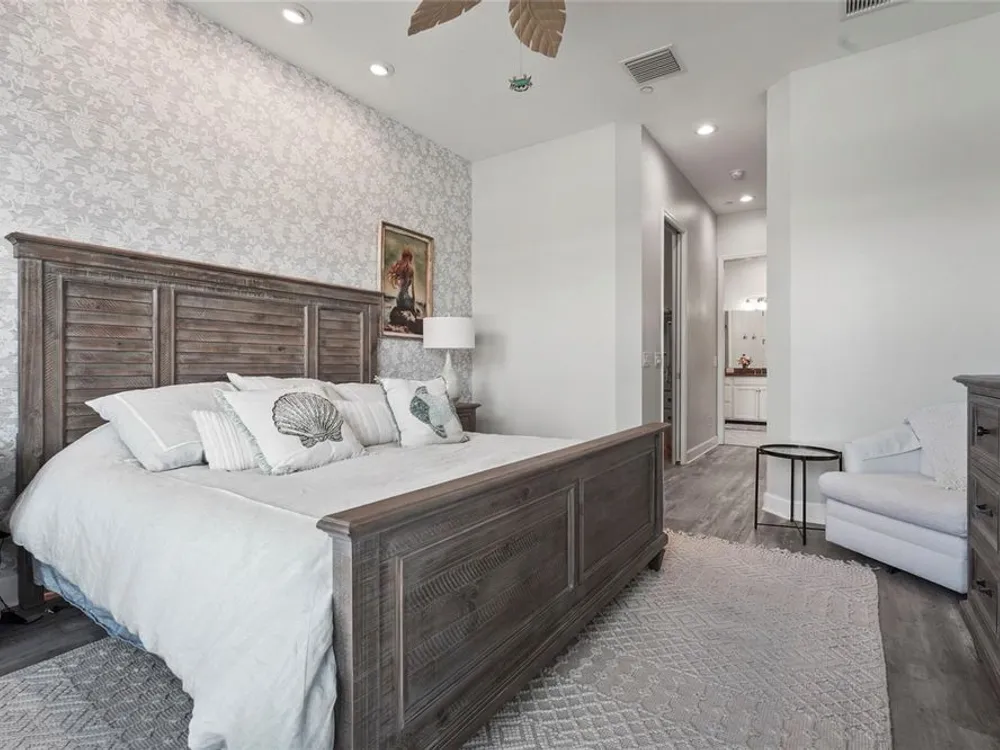 - Ceiling Fan(s), Crown Molding, High Ceilings, Living/Dining Room, Open Floorplan, Main Level Primary, Solid Surface Counters, Stone Counters, Thermostat, Walk-In Closet(s)