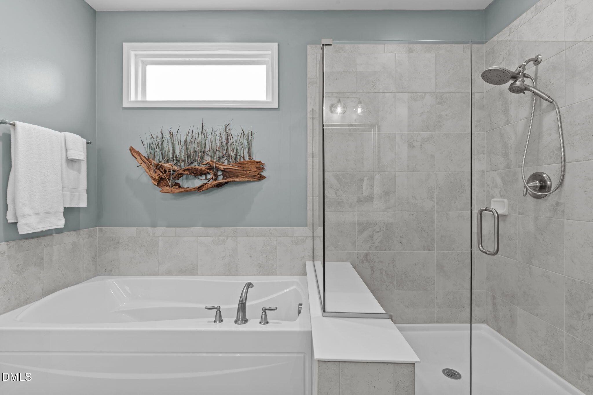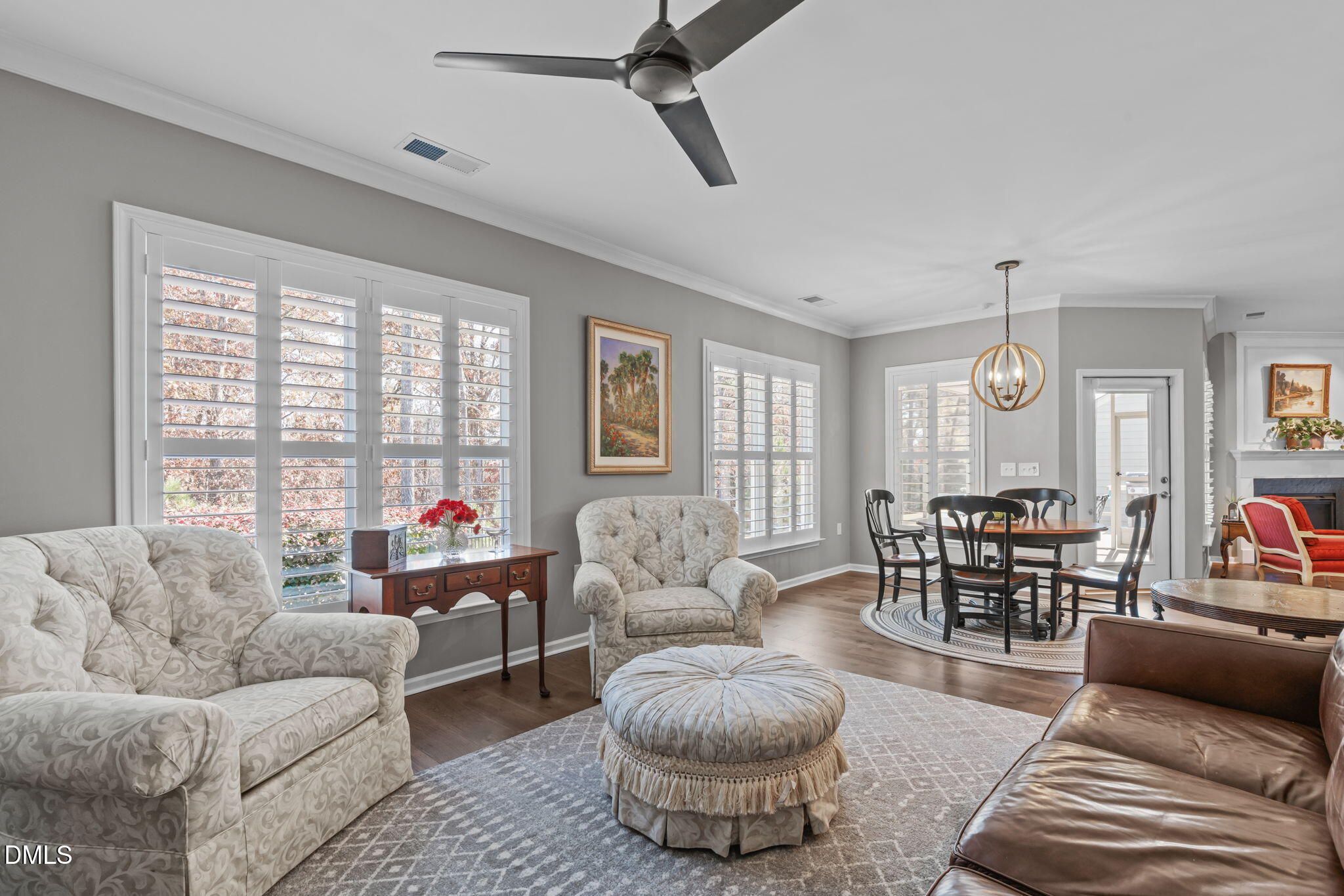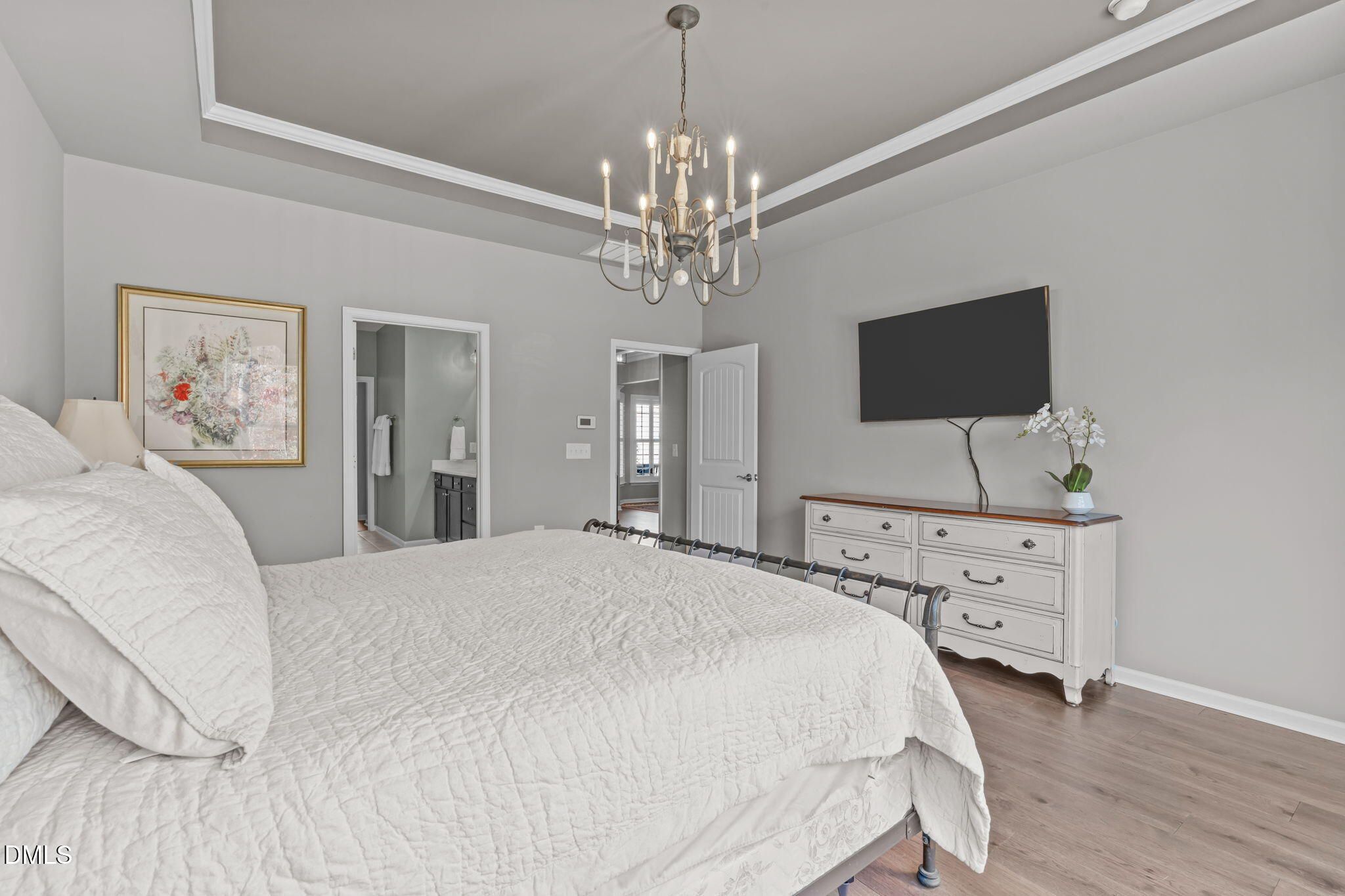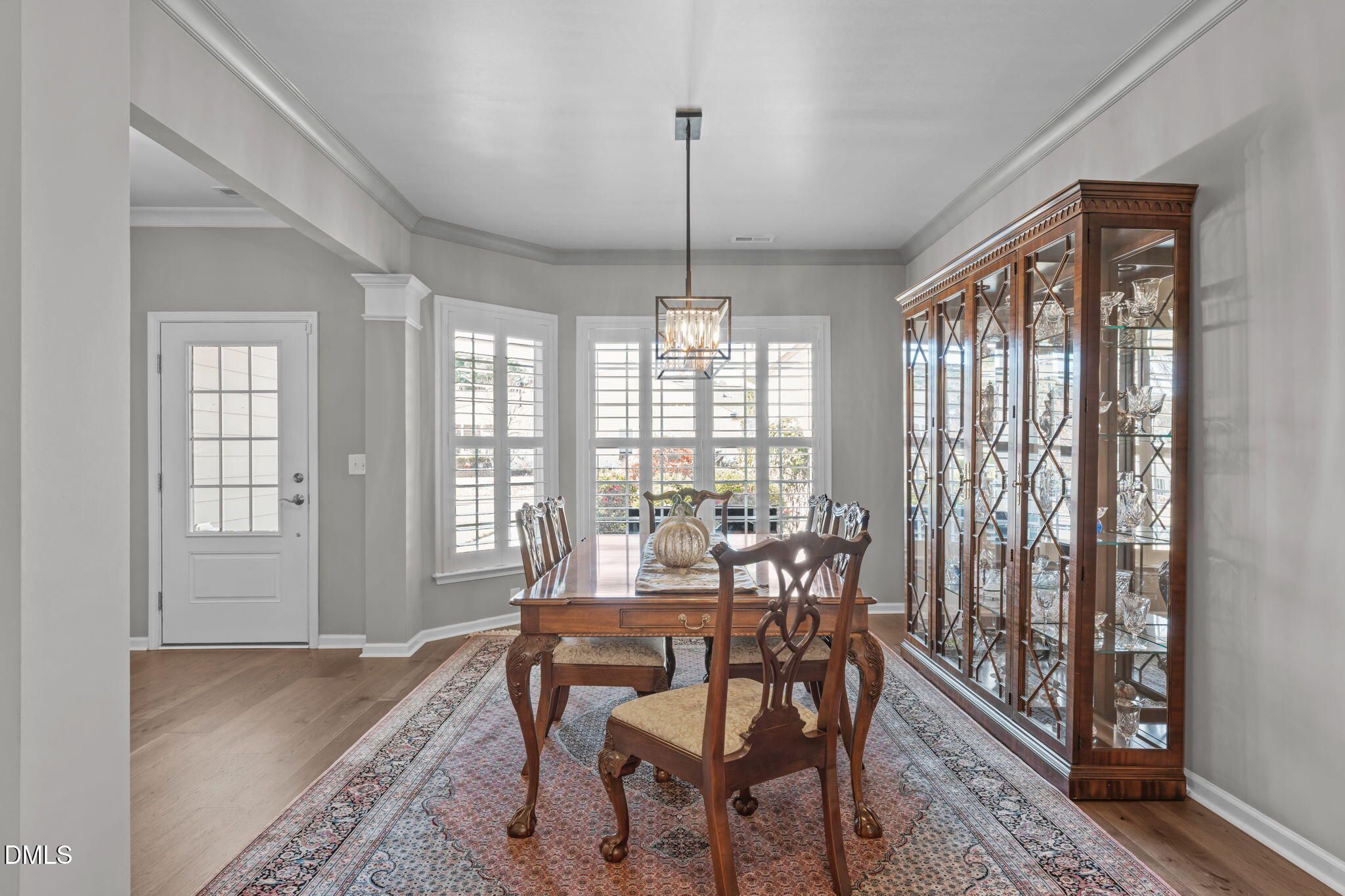 Welcome to Carolina Arbors, a premier 55+ active lifestyle community in Durham. This beautifully maintained Napa floor plan offers one of the most desirable homesites in the neighborhood, situated on an interior lot backing to a wooded buffer that provides exceptional privacy. The main level includes three bedrooms including the primary suite, with a fourth bedroom or bonus room upstairs along with conditioned walk-in storage. The floor plan lives beautifully with an open concept layout that includes a dining room, kitchen with eat-in space, and a keeping or sitting area. The large island allows for effortless entertaining and everyday comfort. Plantation shutters and custom pull-down blinds enhance the interior. The primary suite features dual vanities, a soaking tub, a separate tiled shower, a spacious water closet, and an oversized walk-in closet with built-in shelving. The gourmet kitchen is designed for both style and functionality with upgraded built-in stainless steel appliances, a gas range with hood, quartz countertops, large island with pendant lighting, and convenient pull-out drawers. New flooring extends throughout the main level with tile in all wet areas. Additional features include a large screened porch and separate 14x10 grilling patio, a dedicated laundry room with cabinetry, and an irrigation system that has been winterized for the season. The home has been meticulously maintained inside and out, with a new HVAC system installed in 2024. Residents of Carolina Arbors enjoy an award-winning amenity lifestyle including a clubhouse, indoor and outdoor pools, fitness center, pickleball and tennis courts, walking trails, and a billiards room. This home offers privacy, comfort, and the exceptional lifestyle that Carolina Arbors is known for.