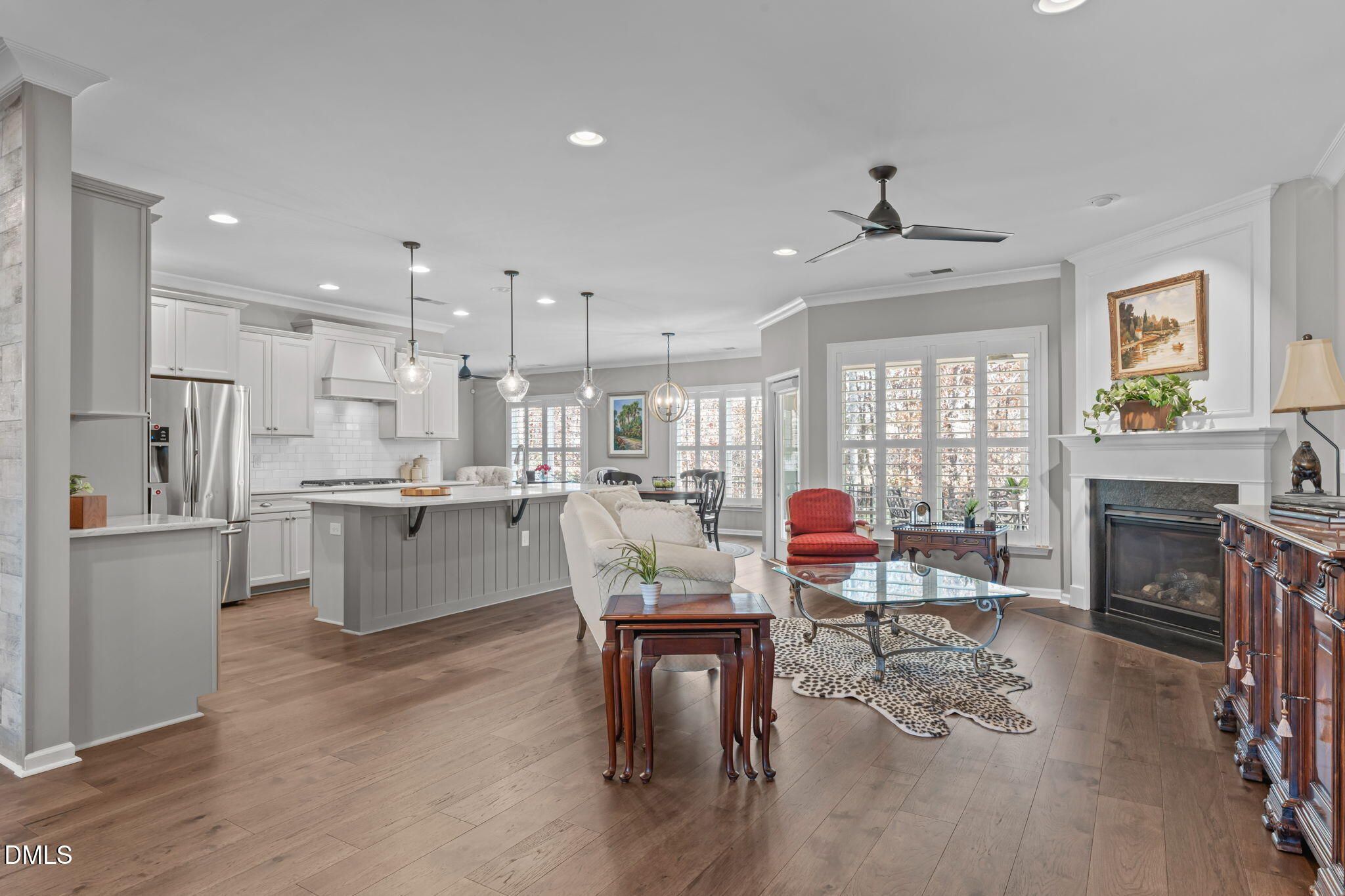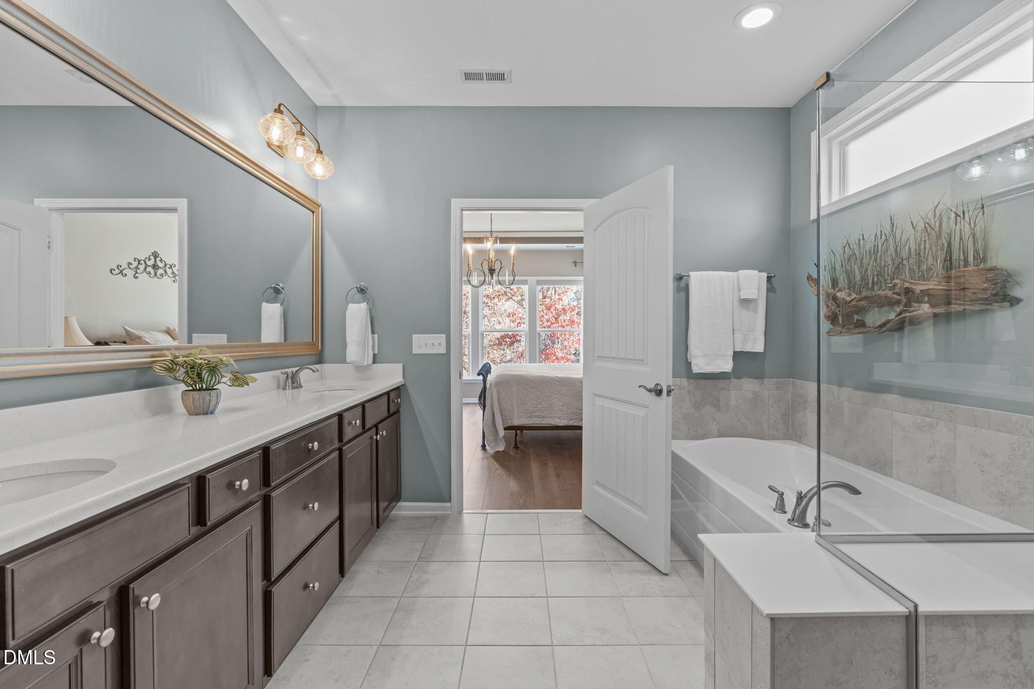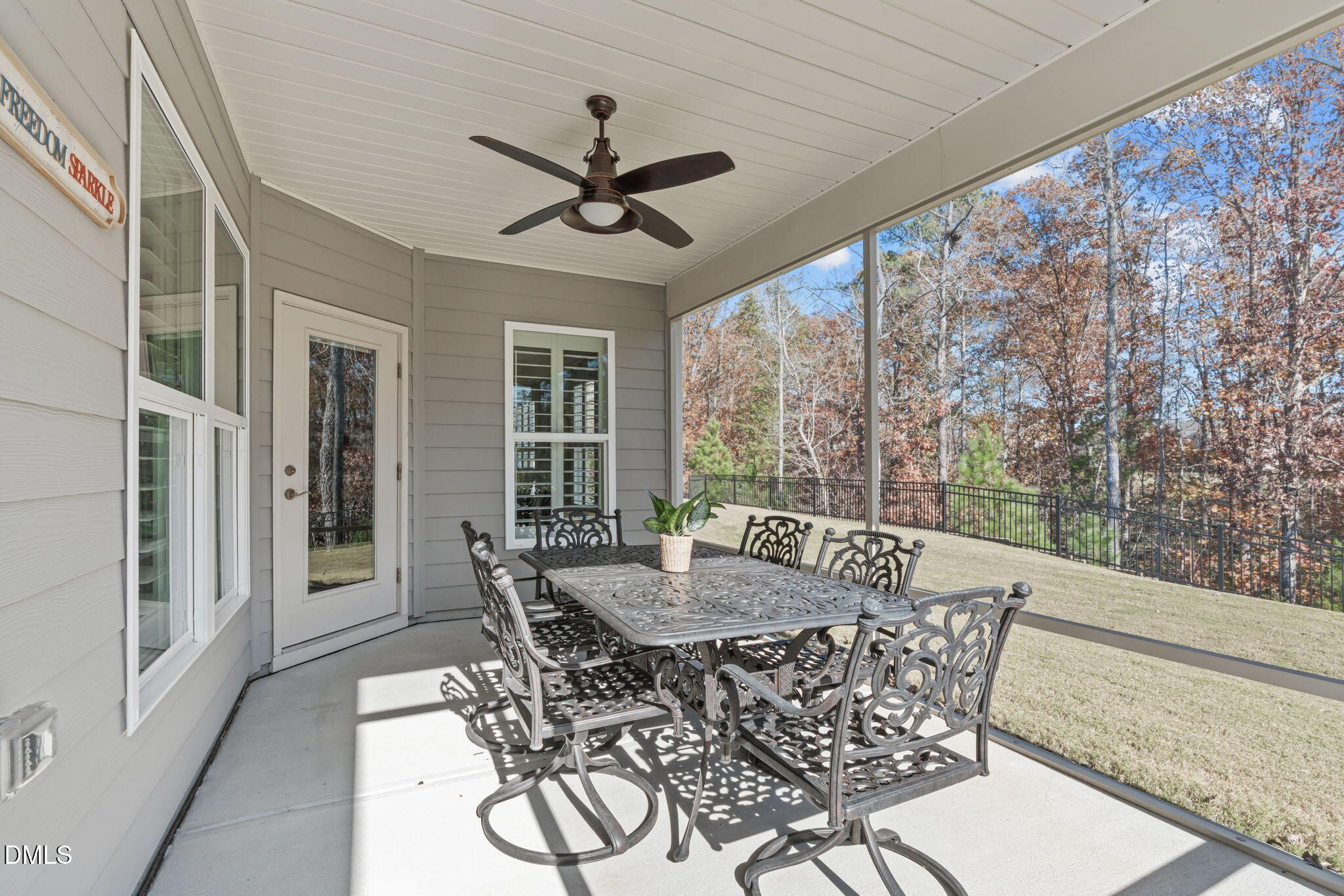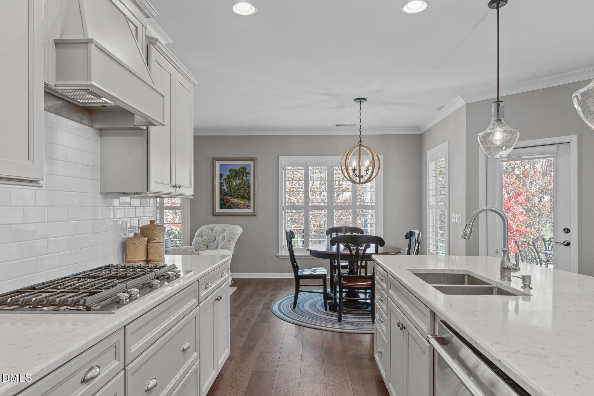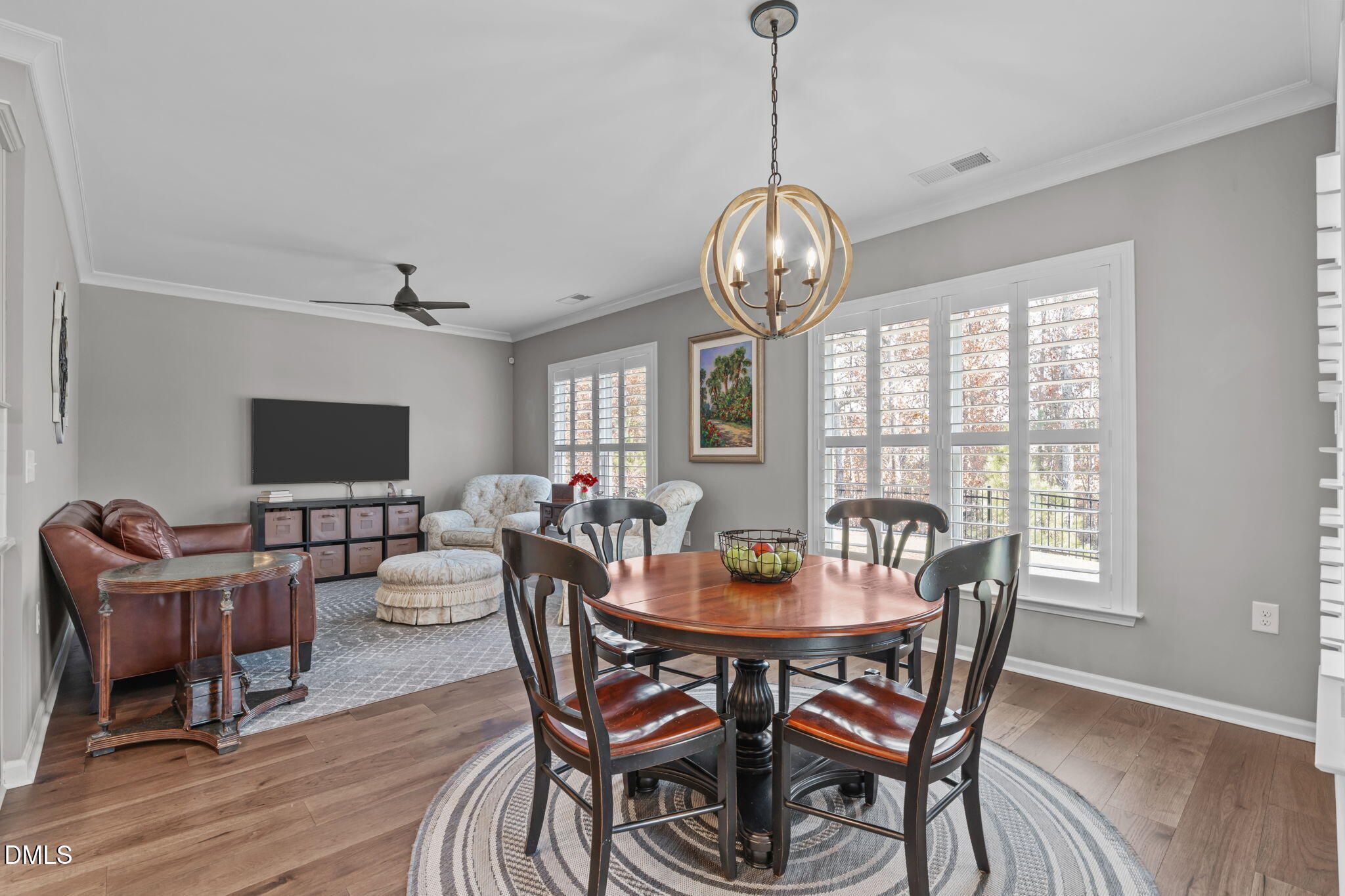 Welcome to Carolina Arbors, a premier 55+ active lifestyle community in Durham. This beautifully maintained Napa floor plan offers one of the most desirable homesites in the neighborhood, situated on an interior lot backing to a wooded buffer that provides exceptional privacy. The main level includes three bedrooms including the primary suite, with a fourth bedroom or bonus room upstairs along with conditioned walk-in storage. The floor plan lives beautifully with an open concept layout that includes a dining room, kitchen with eat-in space, and a keeping or sitting area. The large island allows for effortless entertaining and everyday comfort. Plantation shutters and custom pull-down blinds enhance the interior. The primary suite features dual vanities, a soaking tub, a separate tiled shower, a spacious water closet, and an oversized walk-in closet with built-in shelving. The gourmet kitchen is designed for both style and functionality with upgraded built-in stainless steel appliances, a gas range with hood, quartz countertops, large island with pendant lighting, and convenient pull-out drawers. New flooring extends throughout the main level with tile in all wet areas. Additional features include a large screened porch and separate 14x10 grilling patio, a dedicated laundry room with cabinetry, and an irrigation system that has been winterized for the season. The home has been meticulously maintained inside and out, with a new HVAC system installed in 2024. Residents of Carolina Arbors enjoy an award-winning amenity lifestyle including a clubhouse, indoor and outdoor pools, fitness center, pickleball and tennis courts, walking trails, and a billiards room. This home offers privacy, comfort, and the exceptional lifestyle that Carolina Arbors is known for.