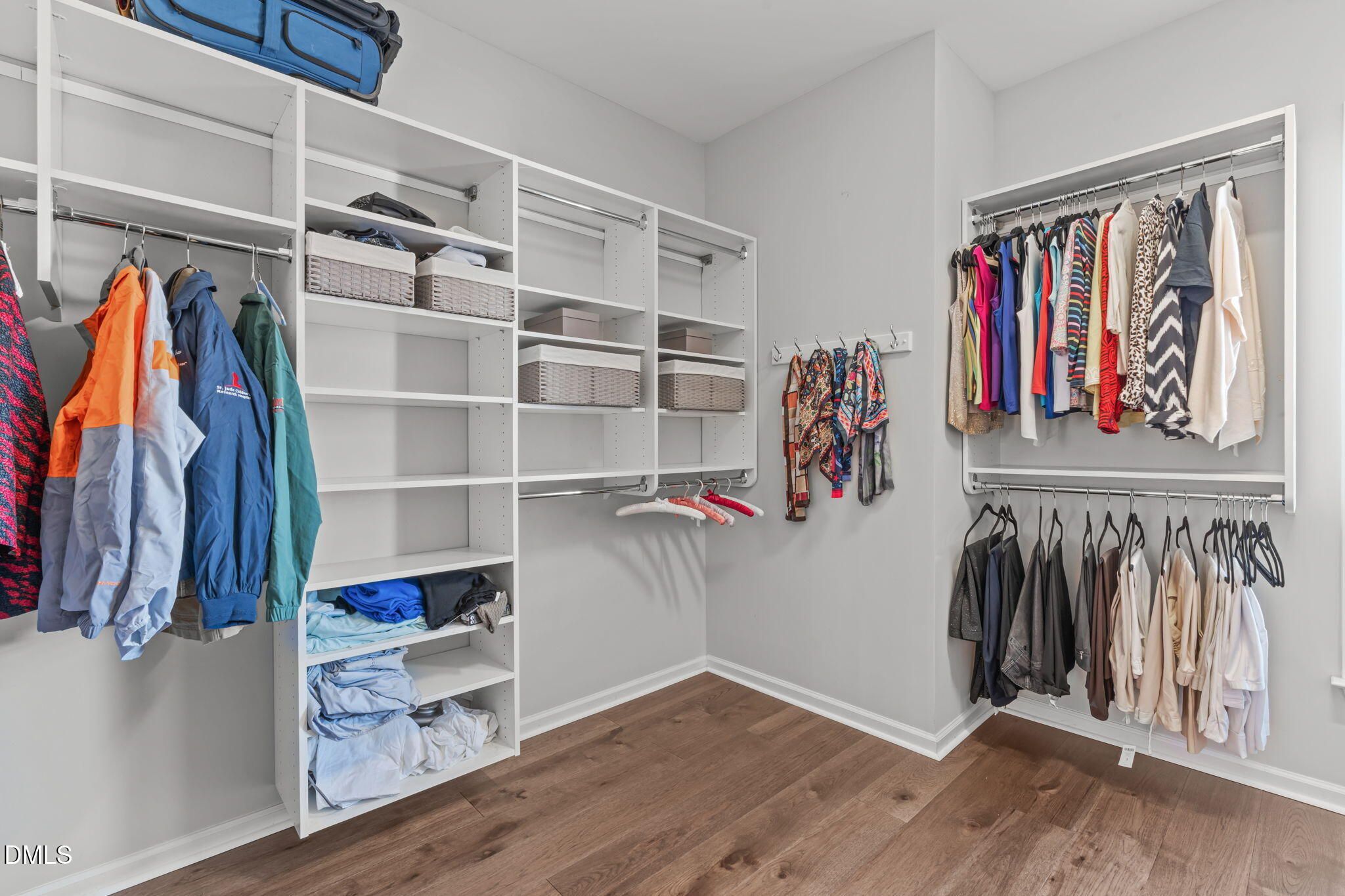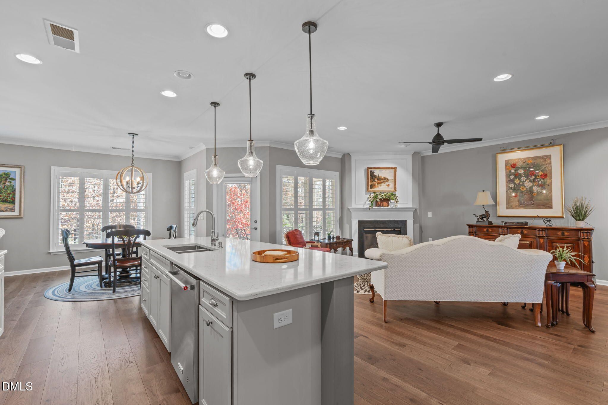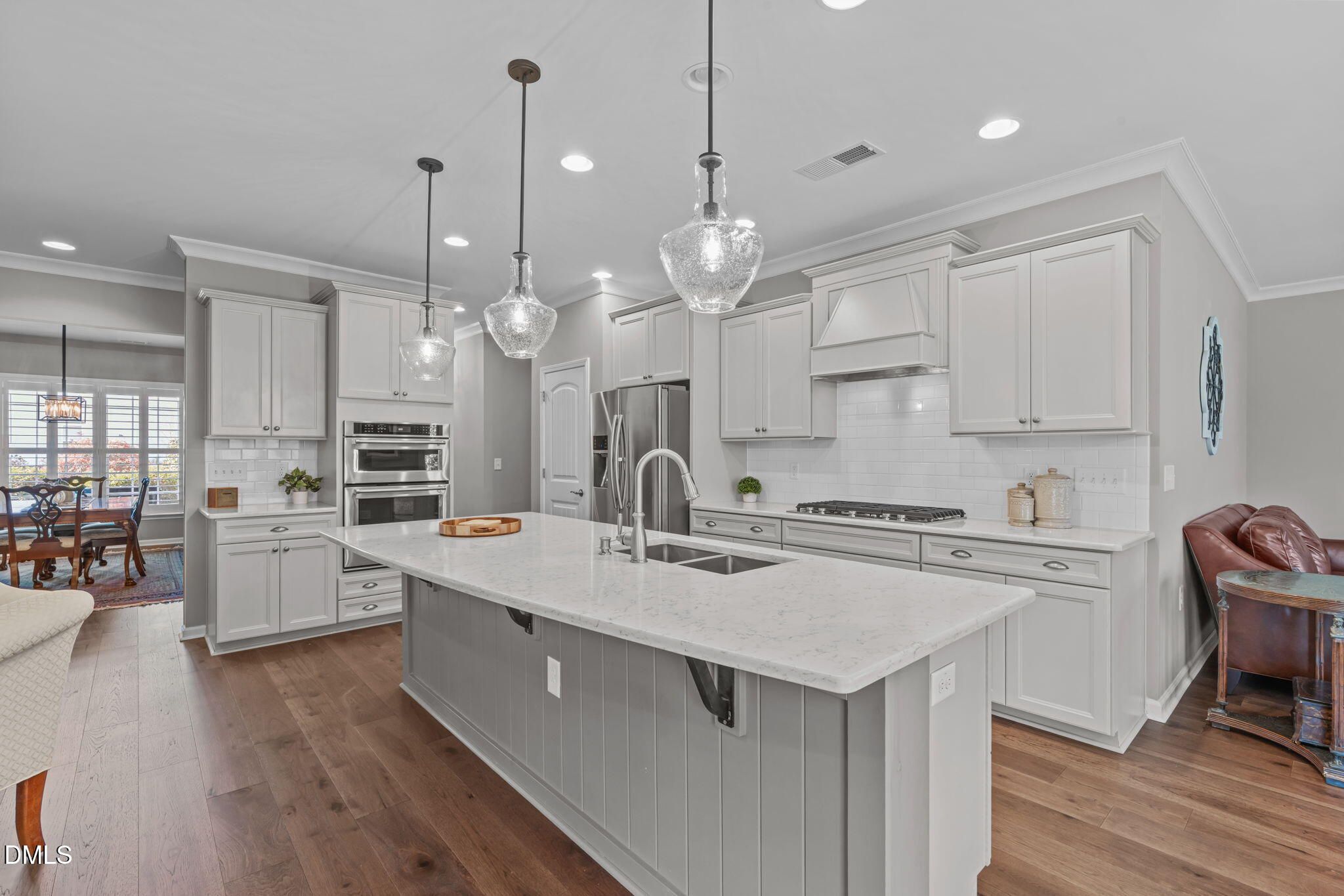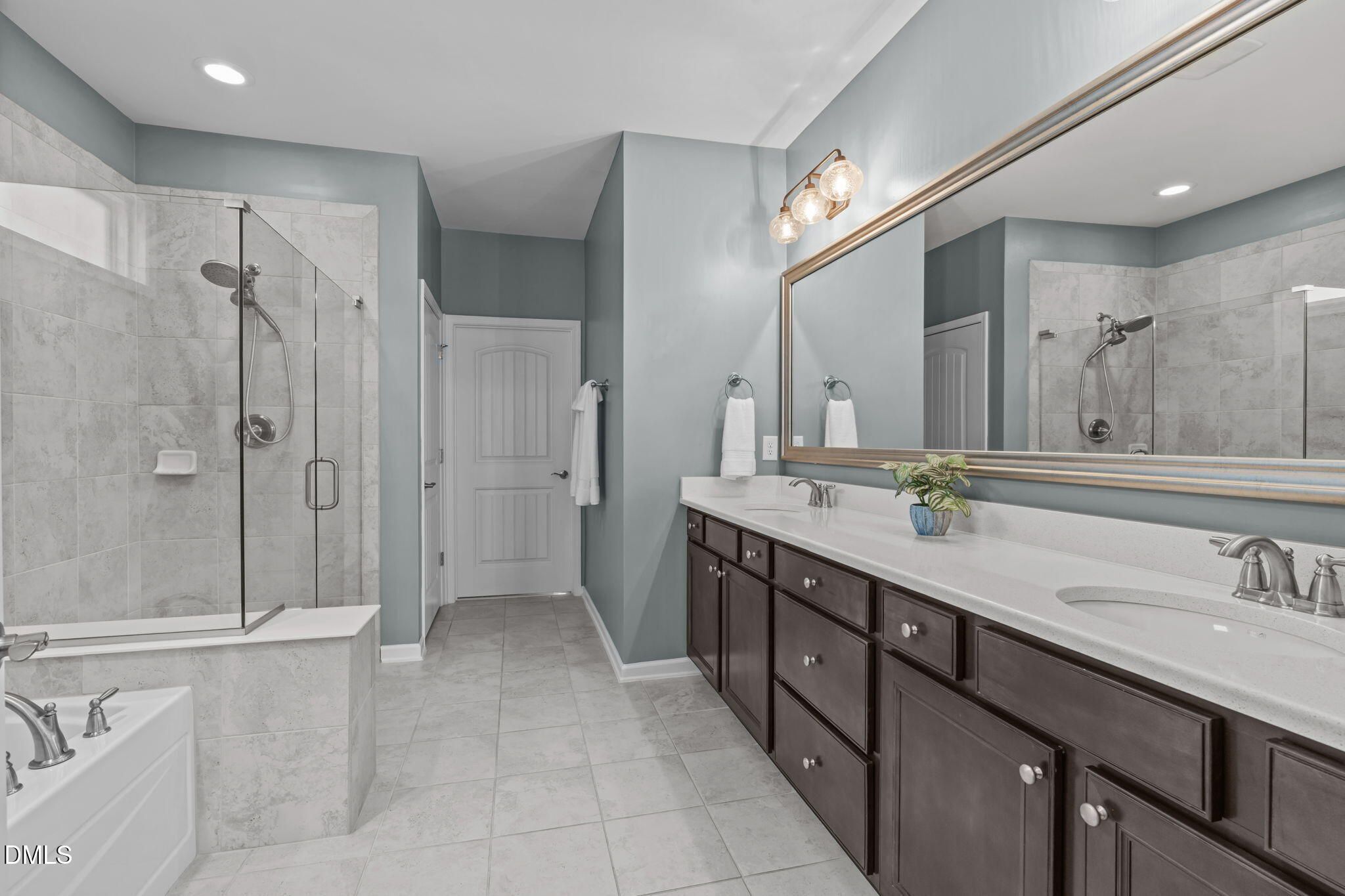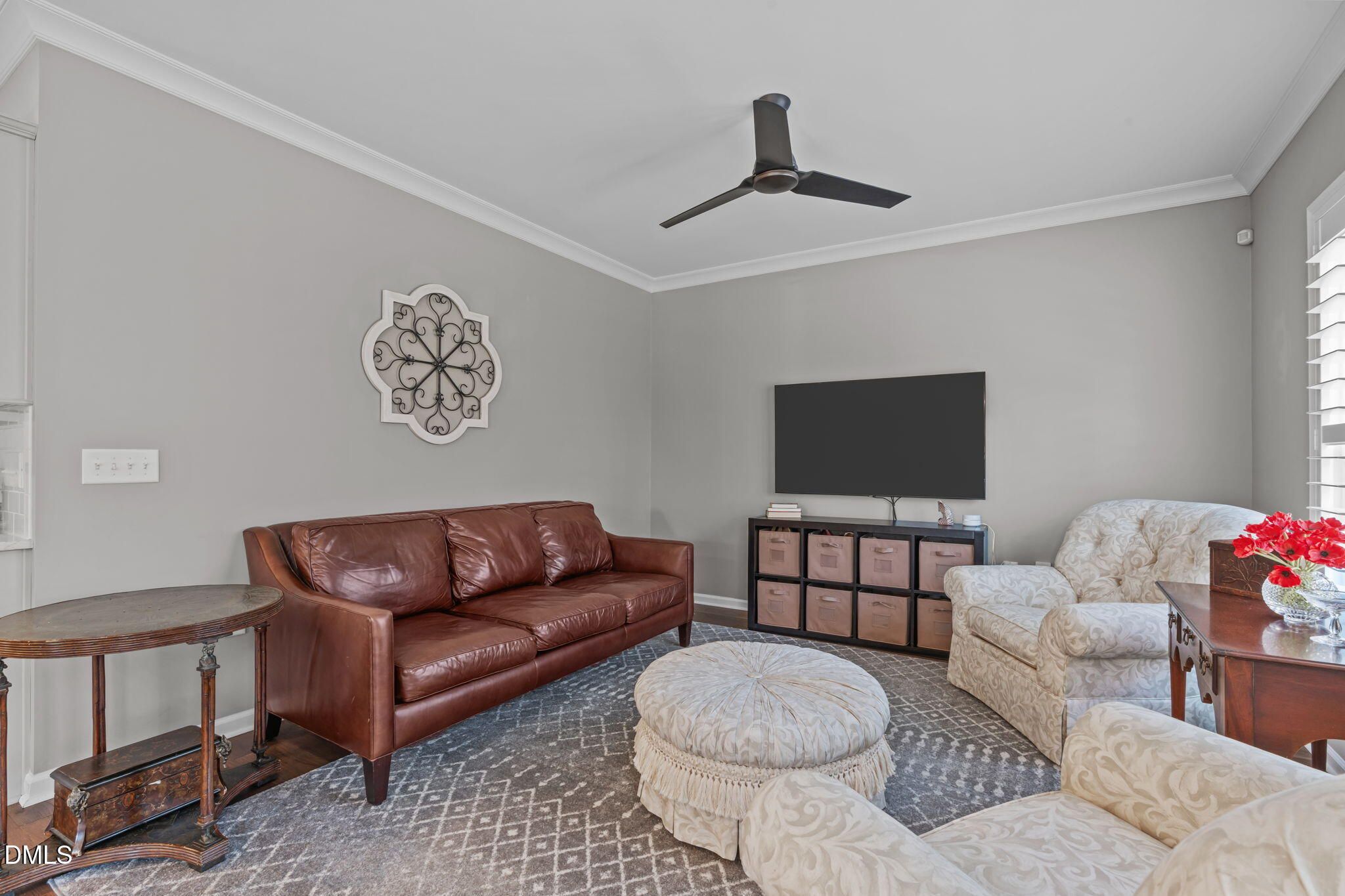 Welcome to Carolina Arbors, a premier 55+ active lifestyle community in Durham. This beautifully maintained Napa floor plan offers one of the most desirable homesites in the neighborhood, situated on an interior lot backing to a wooded buffer that provides exceptional privacy. The main level includes three bedrooms including the primary suite, with a fourth bedroom or bonus room upstairs along with conditioned walk-in storage. The floor plan lives beautifully with an open concept layout that includes a dining room, kitchen with eat-in space, and a keeping or sitting area. The large island allows for effortless entertaining and everyday comfort. Plantation shutters and custom pull-down blinds enhance the interior. The primary suite features dual vanities, a soaking tub, a separate tiled shower, a spacious water closet, and an oversized walk-in closet with built-in shelving. The gourmet kitchen is designed for both style and functionality with upgraded built-in stainless steel appliances, a gas range with hood, quartz countertops, large island with pendant lighting, and convenient pull-out drawers. New flooring extends throughout the main level with tile in all wet areas. Additional features include a large screened porch and separate 14x10 grilling patio, a dedicated laundry room with cabinetry, and an irrigation system that has been winterized for the season. The home has been meticulously maintained inside and out, with a new HVAC system installed in 2024. Residents of Carolina Arbors enjoy an award-winning amenity lifestyle including a clubhouse, indoor and outdoor pools, fitness center, pickleball and tennis courts, walking trails, and a billiards room. This home offers privacy, comfort, and the exceptional lifestyle that Carolina Arbors is known for.