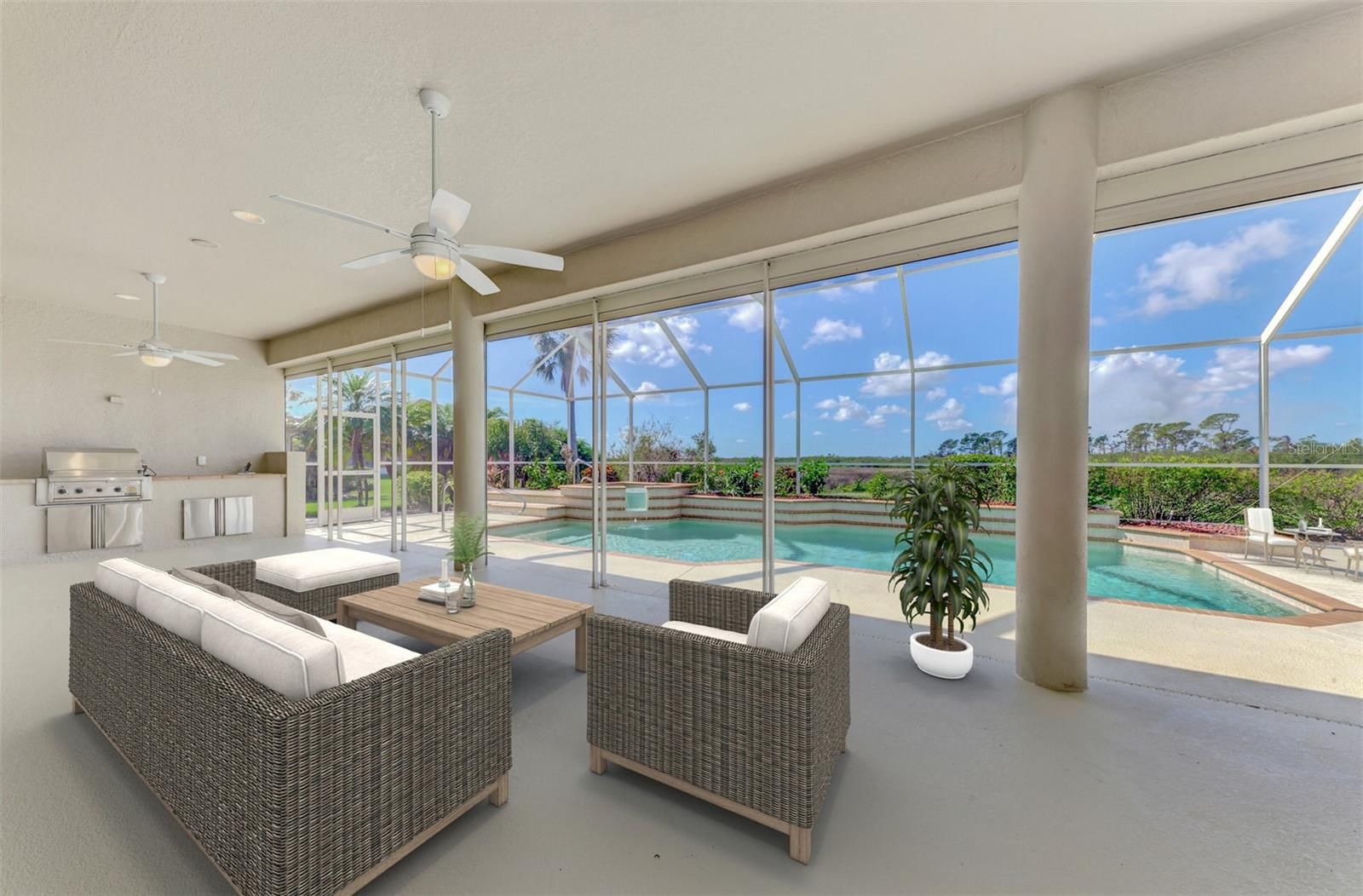 One or more photo(s) has been virtually staged. ACT FAST! Significant Price Reduction. Embrace the Grand Florida Lifestyle by owning this exquisite COVINGTON ESTATE HOME with 4 CAR GARAGE, situated on a sprawling 1.4 acre lot within the exclusive, gated neighborhood of Riverside in Riverwood. An extended driveway, lined with majestic Royal Palms, welcomes you to this opulent residence. Upon entry, a soaring foyer with a striking domed ceiling leads to an expansive great room, seamlessly flowing to a vast lanai. Here, a heated pool and spa invite relaxation, complemented by a fully equipped outdoor kitchen. Enjoy unparalleled privacy as you overlook a serene natural preserve, with distant views of the Myakka River—an idyllic backdrop for entertaining or unwinding while watching breathtaking sunsets. Inside, the open floor plan boasts four generously sized bedrooms, three bathrooms, a formal dining room, and a versatile office/den with custom built-ins PLUS BRAND NEW APPLIANCES, WASHER and DRYER AND OUTDOOR KITCHEN, and a NEW TILE ROOF. Elegant design elements throughout include soaring tray ceilings, crown molding and premium 42-inch wood cabinetry. The chef-inspired kitchen features granite countertops, while a combination of tile and NEW carpeted flooring offers a tasteful and timeless aesthetic. Designer lighting, custom fixtures and refined window treatments elevate every space. Motorized roll-down storm shutters and screens provide peace of mind, while the large four-car garage offers additional storage and a touch of grandeur. As a Riverside resident, you’ll enjoy access to the river for canoeing or kayaking. Other Riverwood’s renowned amenities include a championship golf course ranked among the Top 50 U.S. Courses by Golf Advisor. The community also features lap and resort-style pools, a state-of-the-art fitness center, pickleball and tennis courts, a dog park, lawn croquet, bocce courts, a craft room and a library, all set within a lush, Audubon-certified green community teeming with Florida wildlife. Further elevate your lifestyle with exclusive membership options, including access to Riverwood Golf Club’s private 72-par championship course and a private beach club on Manasota Key. Ideally located along the Myakka River, you’ll be just moments from vibrant cultural venues, upscale dining, shopping, and the pristine beaches of Southwest Florida, conveniently situated between Sarasota and Fort Myers. This isn’t just a home—it’s a gateway to paradise. Schedule your showing today and step into the Florida lifestyle you’ve always dreamed of!
