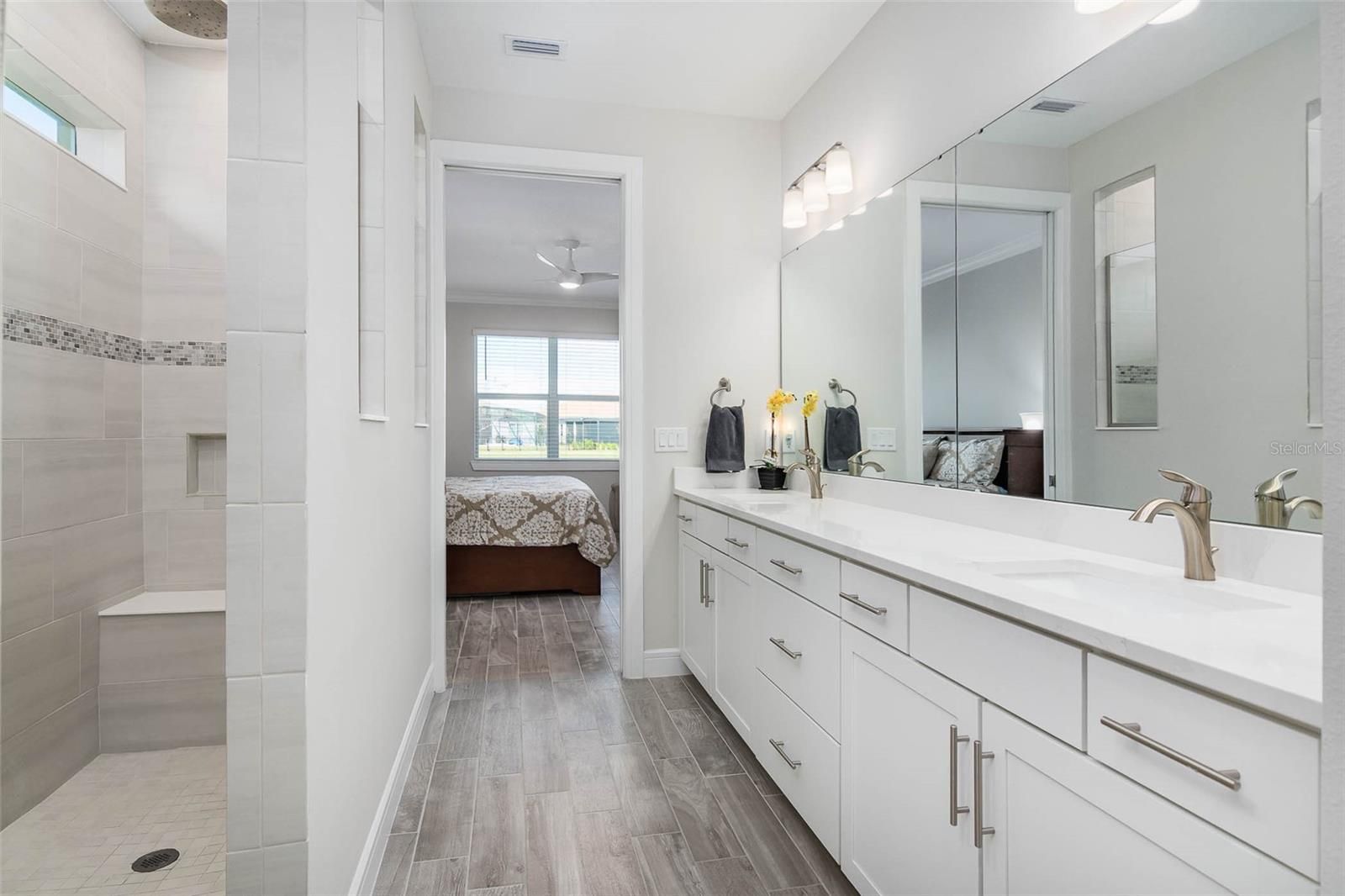 Over $130K in upgrades! This lakefront, 3BDRM Palmary plan in Viera's premier 55+ community is a showpiece. Stunning lake views from primary, living, dining & kitchen. Open-concept design is perfect for entertaining. Just 15 min to the beach! A 30k SF clubhouse anchors the social scene w/ restaurant, resort pool, pickleball, tennis & fitness center. HOA includes Duran Golf's Par 3 course membership & cable/wifi for $400/6 mos. Stone facade & bay window impress. Inside: wood-look tile, Minka-Aire fans, crown molding, tall baseboards, CAT6, faux-wood blinds. Chef's kitchen shines w/ white soft-close cabinets, pull-outs, built-in microwave/oven, gas cooktop & Calacatta Gold quartz on all counters (incl. baths), large pantry & island w/ pendants. Great rm soars w/ tray ceiling & 8' doors. Owner's suite is a retreat w/ huge walk-in closet & spa-like dual rain/std shower. All baths have floor-to-ceiling tiled showers & comfort-height toilets. Drop-zone bench & 3 storage racks in the garage.