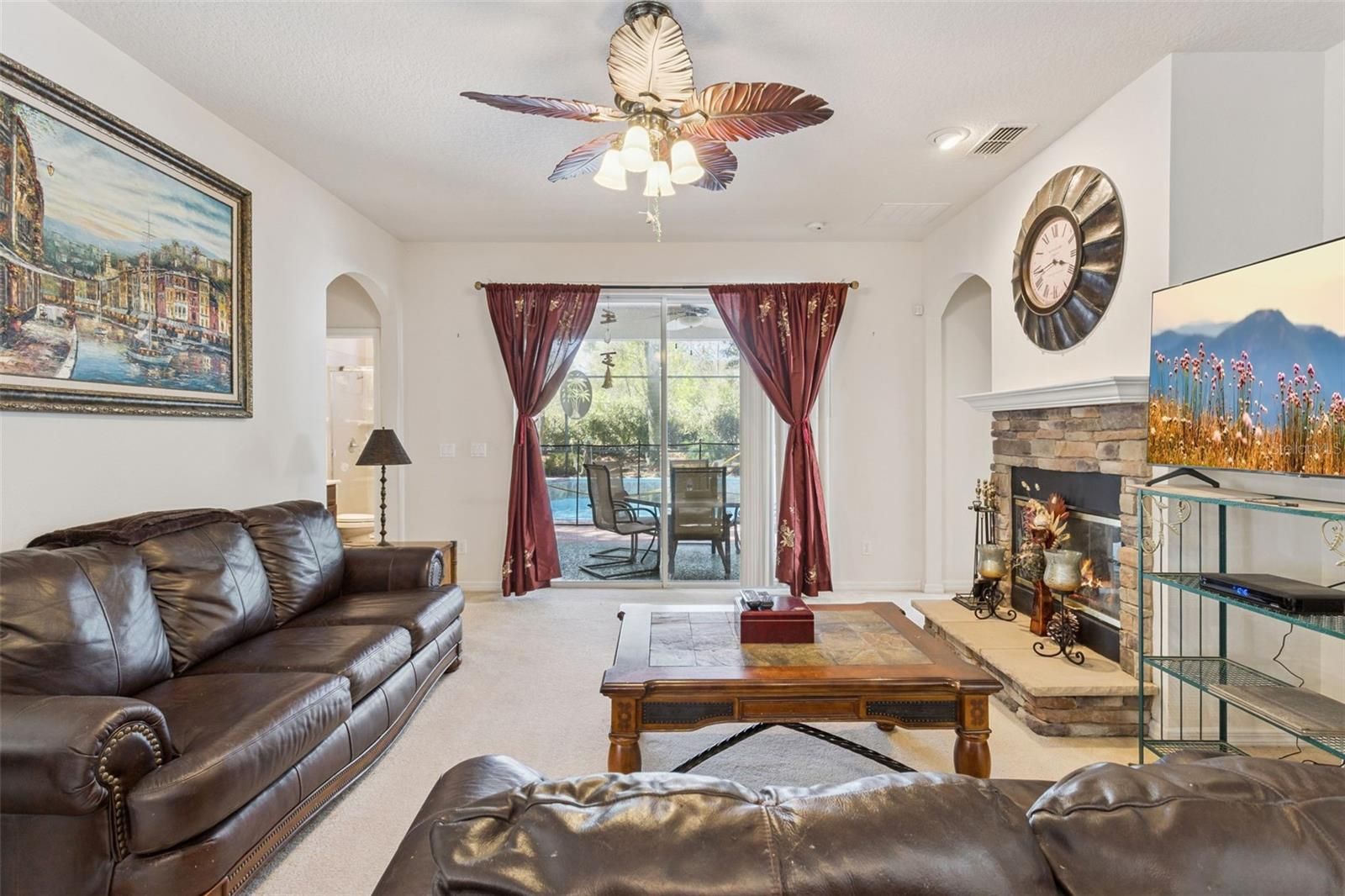 Located in the established Sullivan Ranch community, this well-planned pool home offers a combination of privacy, functional layout, and usable indoor-outdoor living, with no rear neighbors. The kitchen is designed for everyday use and entertaining, featuring granite countertops, a center island for added prep space, ample cabinetry, and clear sightlines into the main living area. An eat-in kitchen nook provides casual dining for daily routines, while a separate formal dining room allows for hosting, holidays, and gatherings without compromising living space. The primary living areas flow naturally toward the backyard, where a private screened pool serves as the focal point. The pool features new equipment and a new motor, offering improved efficiency and reduced near-term maintenance. Beyond the screen enclosure, a dedicated firepit area extends the usable outdoor living space, creating a comfortable setting for evening relaxation and seasonal entertaining. The absence of rear neighbors enhances backyard privacy and minimizes noise. A 3-car garage provides flexibility for vehicles, storage, home gym, or hobby use. The overall floor plan balances openness with defined rooms, supporting work-from-home needs, daily living, and entertaining. Situated within Sullivan Ranch, residents enjoy established landscaping, community amenities, and convenient access to Mount Dora in less than 8 mins, SR-429 in 5 mins, and surrounding Central Florida destinations.