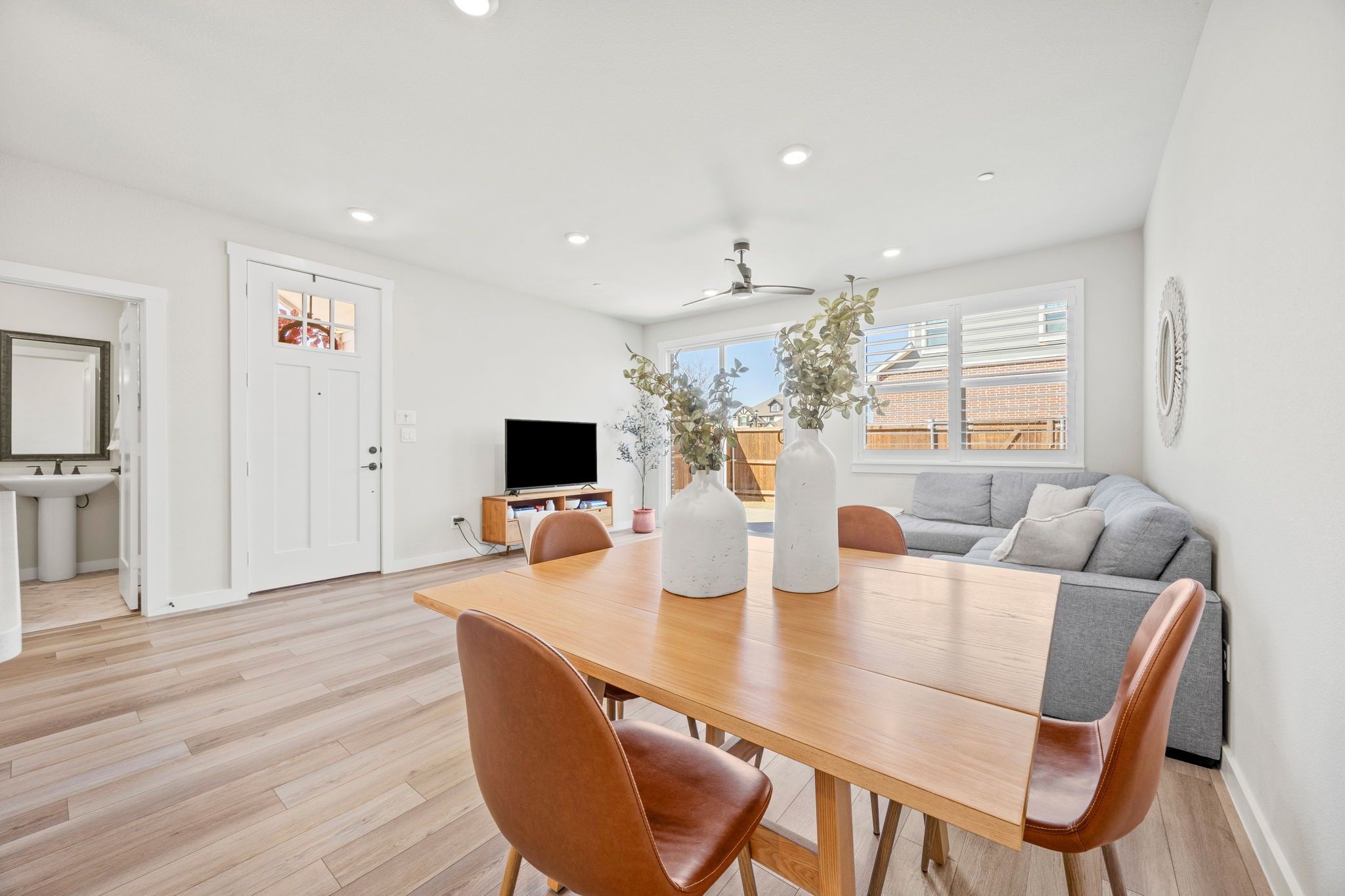 This exquisite modern home effortlessly combines luxury and comfort, sitting on a coveted corner lot right next to the community amenity center. As you enter, the open-concept living room bathes in natural light, enhanced by elegant plantation shutters that perfectly complement the sleek, contemporary design. This bright and airy space is perfect for both relaxation and hosting gatherings, creating a warm and inviting atmosphere. The kitchen is a chef’s dream, featuring a large island, a top-of-the-line gas stove, and custom finishes that make cooking a true pleasure. Whether preparing daily meals or entertaining friends, this kitchen offers both functionality and style with ample counter space and storage. The master suite is a true sanctuary, offering a spacious bedroom with room for a cozy sitting area and a generously sized walk-in closet. The luxurious bathroom features high-end finishes, creating the perfect spot to unwind. With thoughtful design, the primary bedroom provides a perfect blend of privacy, convenience, and comfort. Step outside to your own private retreat, where a fenced patio with a 6-ft privacy fence ensures complete seclusion. Whether you're enjoying a quiet evening or hosting an outdoor gathering, this space is perfect for relaxation and entertainment. Set in a dynamic and thriving community, this home offers residents access to a range of top-tier amenities. Spend your days by the sparkling pool, let your pets enjoy the dog park, or take in the beautifully landscaped grounds—all maintained by the HOA. Convenience is at your doorstep, with shopping, grocery stores, and a wide variety of restaurants just moments away. The nearby parks, walking trails, and gym offer excellent options for an active lifestyle. With its beautiful design, premium amenities, and prime location, it truly has it all.