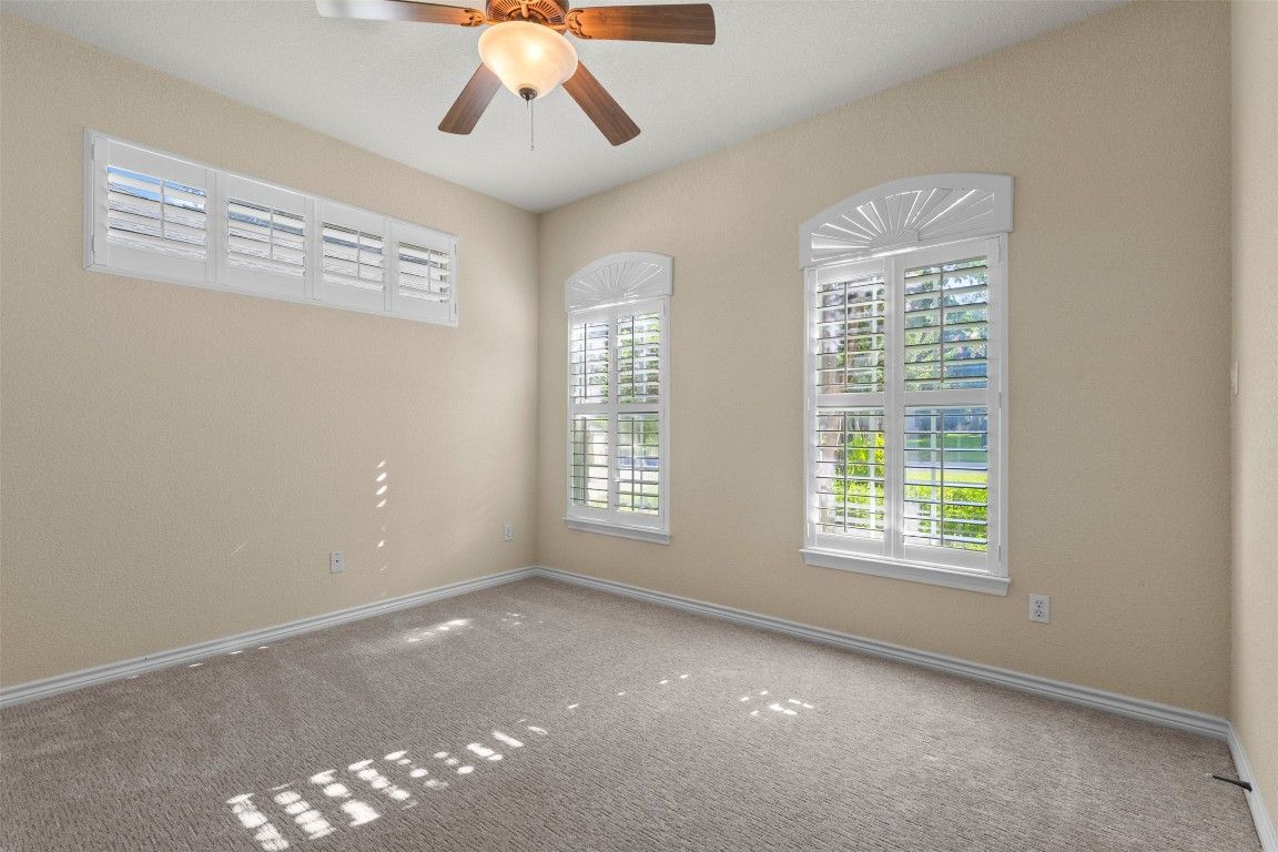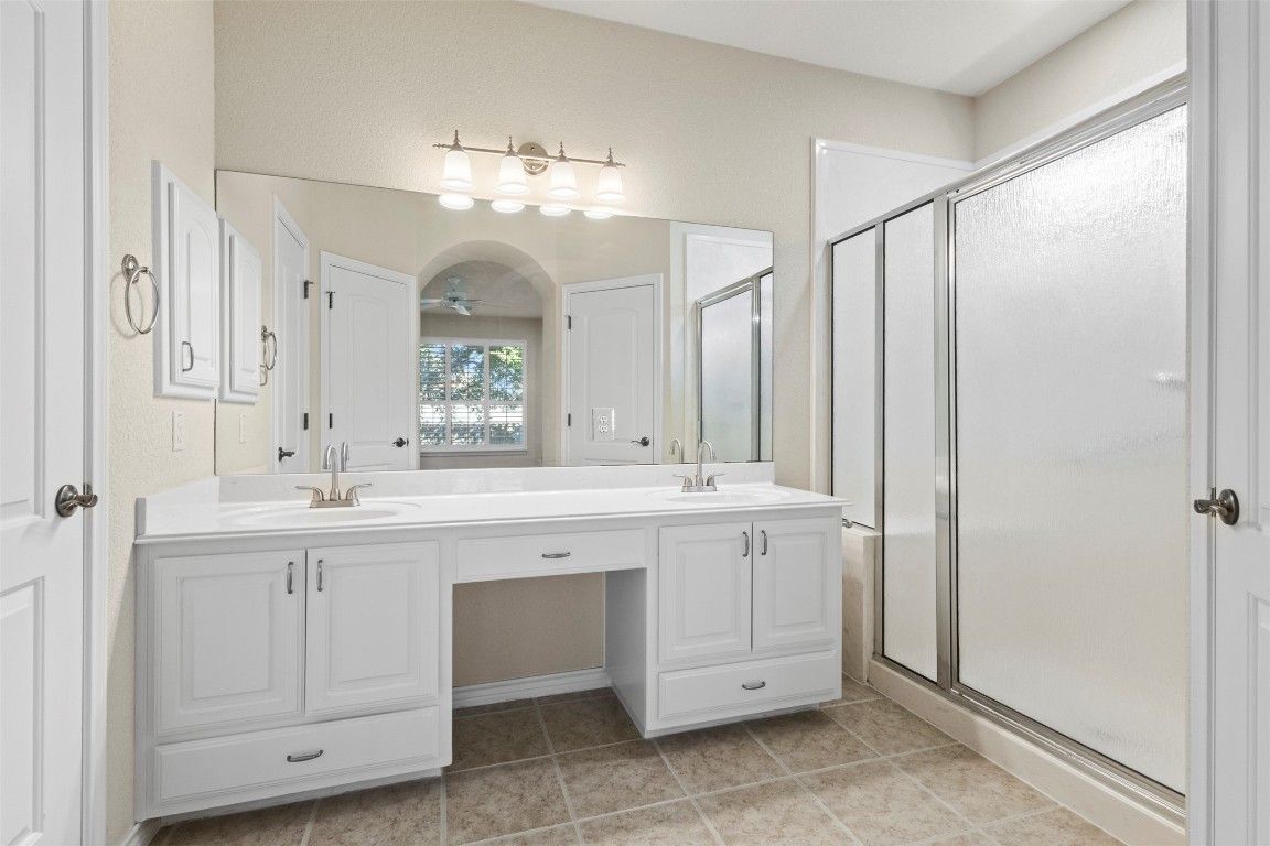 Sparkling home with NEW CARPET 7-2025 and FRESH PAINT 7-2025; Unbelievable opportunity to live in desirable Texas Traditions in this move-in ready home! PLANTATION SHUTTERS throughout! Office / Study located just steps from the front entry. Oversized Living Area opens to the Kitchen and Dining areas. This living area offers a spectacular view of the HEAVILY TREED BACK YARD! Master Bedroom has HIS AND HER CLOSETS and a stylish barn door to allow privacy for the Master Bath. Master Bath with dual vanity, a dressing counter and large rain glass front walk-in shower. 2 Additional Bedrooms provide essential guest quarters - 1 guest room provides a charming built-in curio cabinet. Do not miss the SCREENED IN PATIO complete with ceiling fan. The view it offers is of the meticulously designed and maintained yard - complete with a GROVE OF LIGHT WRAPPED TREES! The garage provides a side bump-out with built-in cabinets, a handy pegboard, and a workbench. Why would you look anywhere else? Texas Traditions is a 55+ neighborhood.