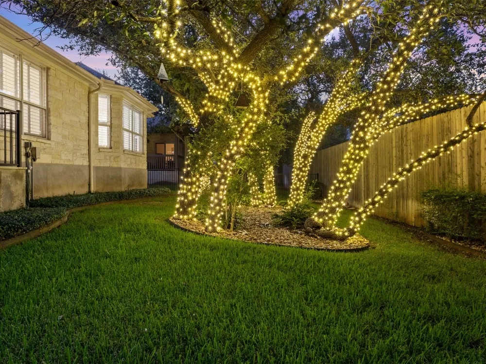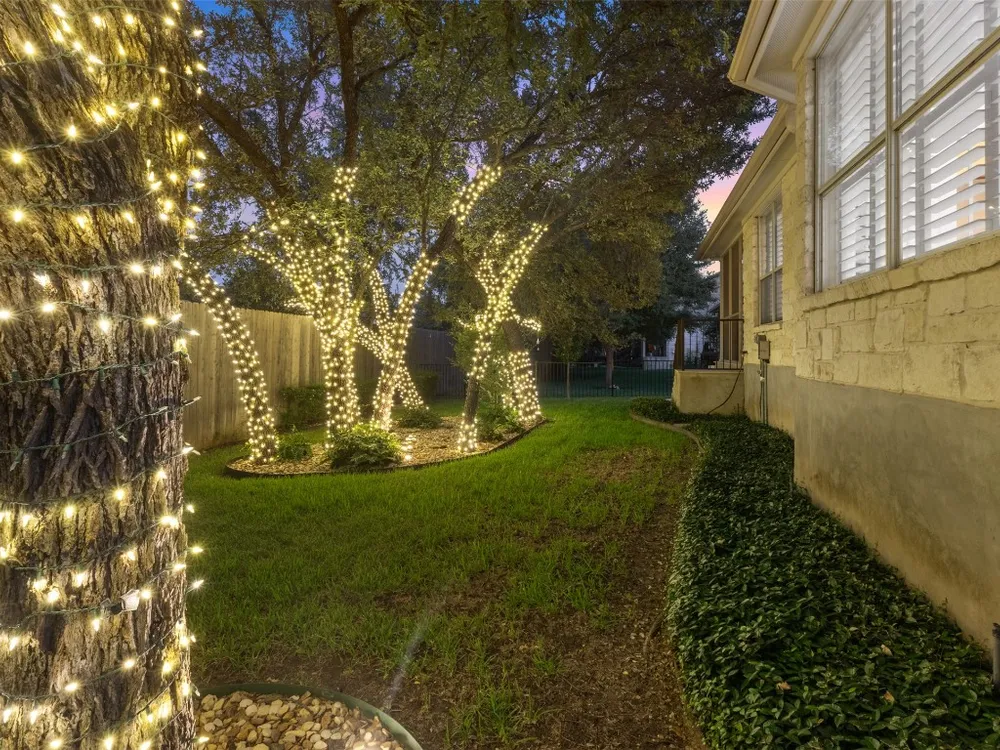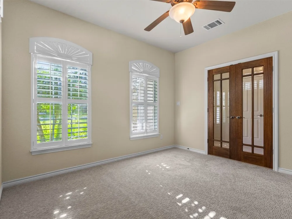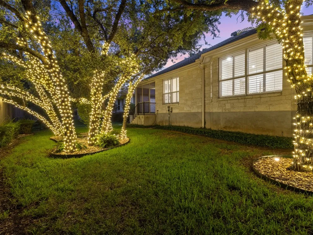 Sparkling home with NEW CARPET 7-2025 and FRESH PAINT 7-2025; Unbelievable opportunity to live in desirable Texas Traditions in this move-in ready home! PLANTATION SHUTTERS throughout! Office / Study located just steps from the front entry. Oversized Living Area opens to the Kitchen and Dining areas. This living area offers a spectacular view of the HEAVILY TREED BACK YARD! Master Bedroom has HIS AND HER CLOSETS and a stylish barn door to allow privacy for the Master Bath. Master Bath with dual vanity, a dressing counter and large rain glass front walk-in shower. 2 Additional Bedrooms provide essential guest quarters - 1 guest room provides a charming built-in curio cabinet. Do not miss the SCREENED IN PATIO complete with ceiling fan. The view it offers is of the meticulously designed and maintained yard - complete with a GROVE OF LIGHT WRAPPED TREES! The garage provides a side bump-out with built-in cabinets, a handy pegboard, and a workbench. Why would you look anywhere else?