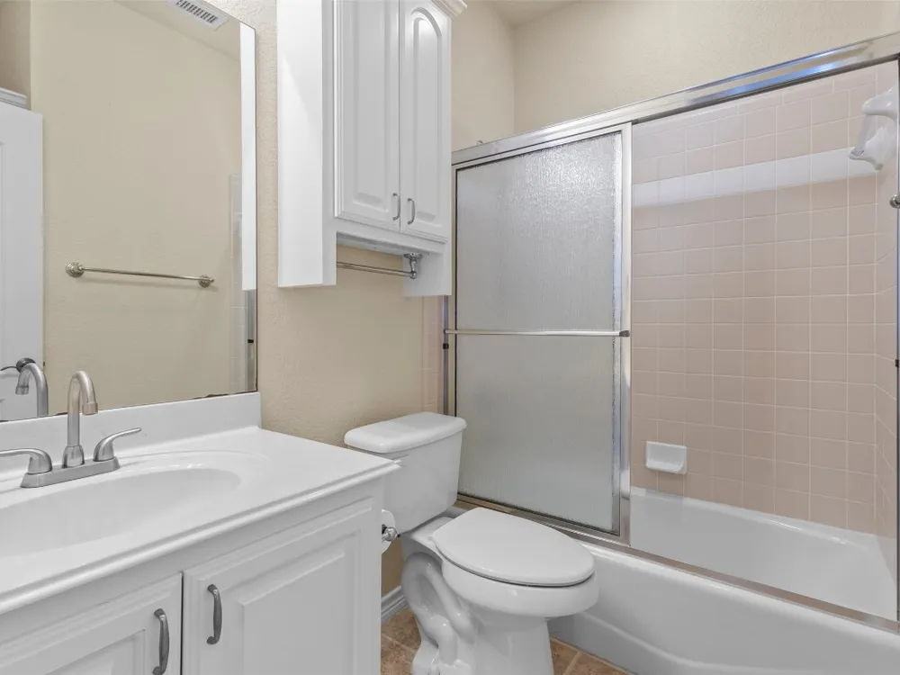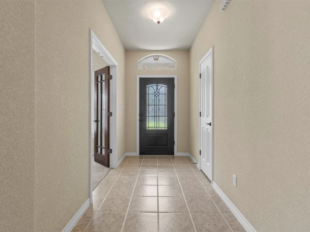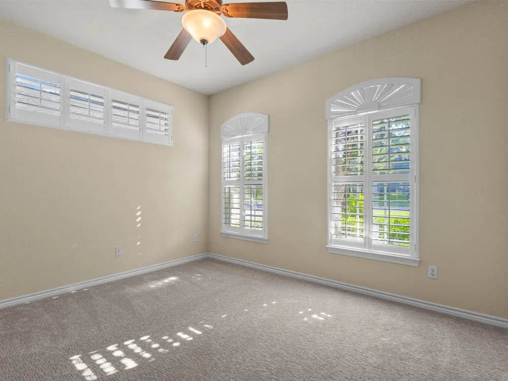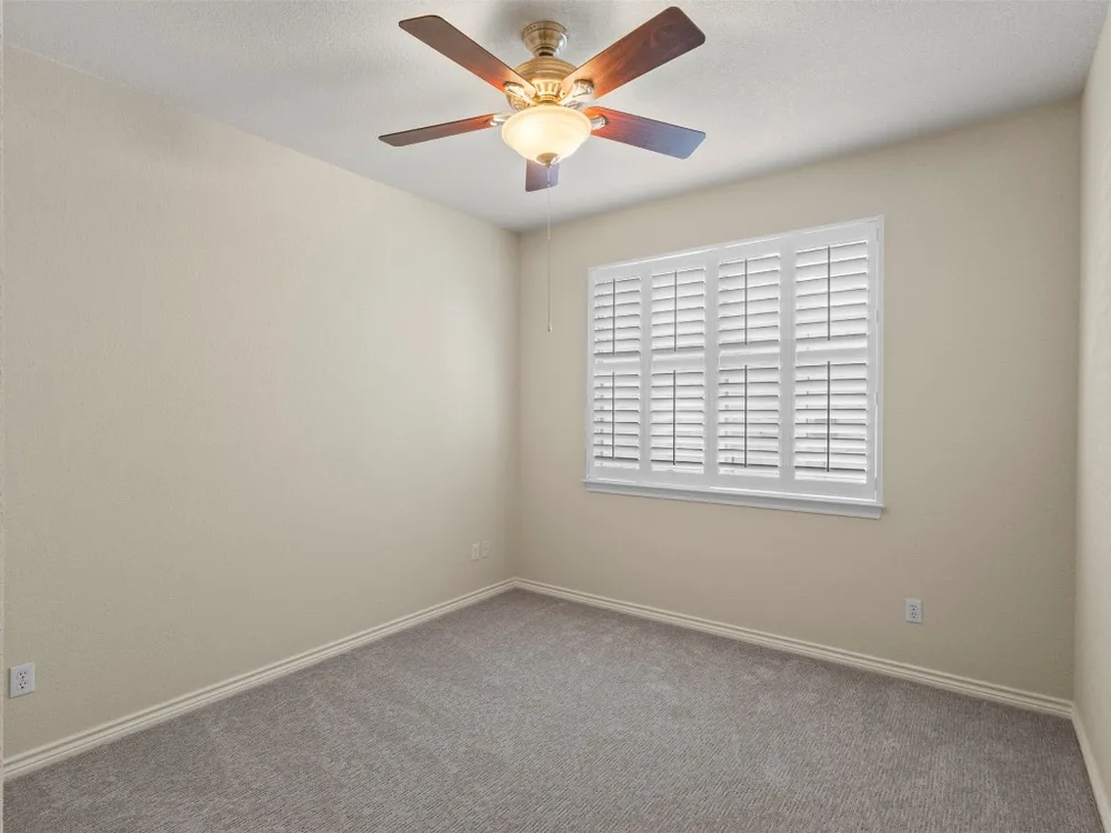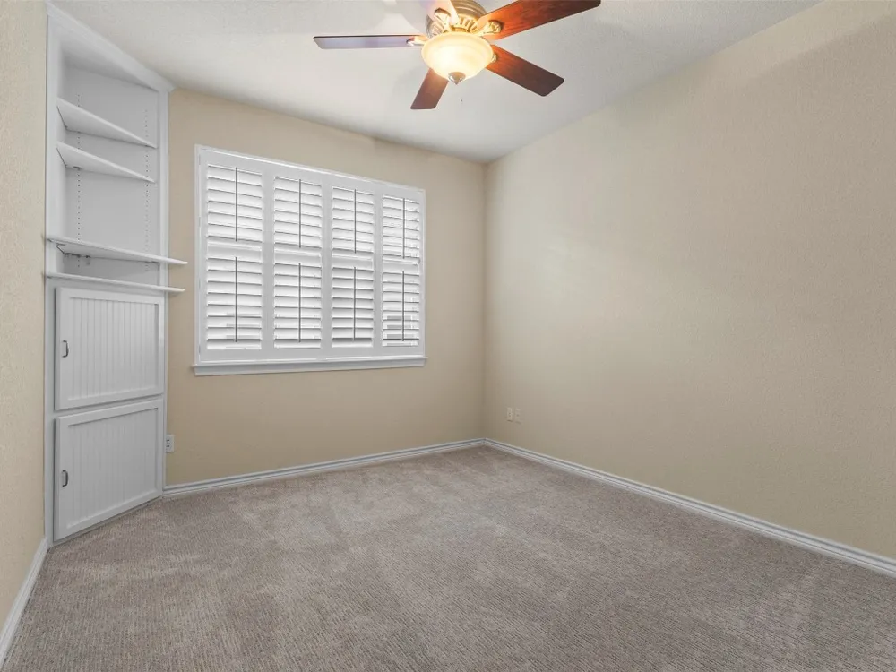 Sparkling home with NEW CARPET 7-2025 and FRESH PAINT 7-2025; Unbelievable opportunity to live in desirable Texas Traditions in this move-in ready home! PLANTATION SHUTTERS throughout! Office / Study located just steps from the front entry. Oversized Living Area opens to the Kitchen and Dining areas. This living area offers a spectacular view of the HEAVILY TREED BACK YARD! Master Bedroom has HIS AND HER CLOSETS and a stylish barn door to allow privacy for the Master Bath. Master Bath with dual vanity, a dressing counter and large rain glass front walk-in shower. 2 Additional Bedrooms provide essential guest quarters - 1 guest room provides a charming built-in curio cabinet. Do not miss the SCREENED IN PATIO complete with ceiling fan. The view it offers is of the meticulously designed and maintained yard - complete with a GROVE OF LIGHT WRAPPED TREES! The garage provides a side bump-out with built-in cabinets, a handy pegboard, and a workbench. Why would you look anywhere else?