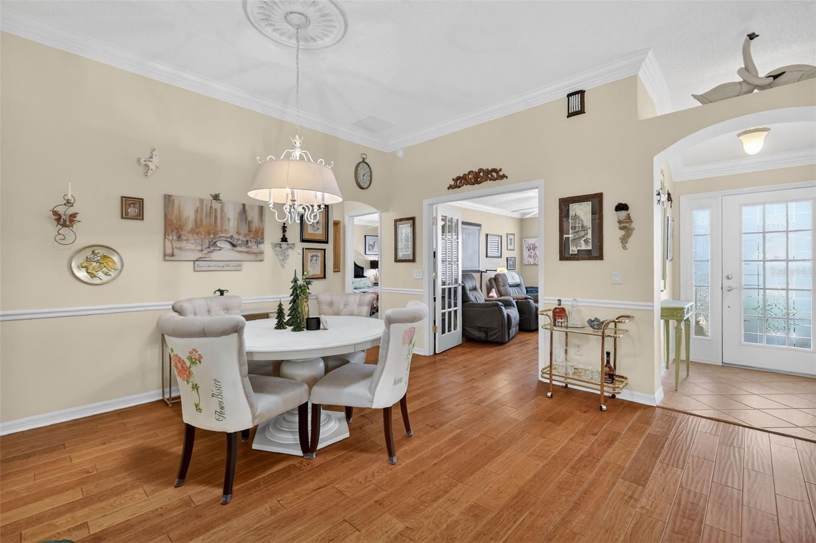 FANTASTIC 3/2 Designer Whispering Pine with ENCLOSED LANAI, EXTENDED SCREENED LANAI, and REAR PATIO nestled in the highly desirable Village of Glenbrook! JUST MINUTES to Lake Sumter Landing! BOND PAID! ROOF 2020. DECORATIVELY PAINTED drive and walk ways, CURBED landscaping with STONED beds, COVERED entry vestibule, and FROSTED GLASS French door and side lite welcome you in to the GENEROUS foyer of this INCREDIBLE home! The OPEN CONCEPT layout with HIGH VAULTED CEILINGS and ARCHED DOORWAYS creates a SPACIOUS and VOLUMINOUS main living and dining area. GORGEOUS ENGINEERED HARDWOOD flooring flows SEAMLESSLY THROUGHOUT this area while elegant CROWN MOLDING adorns the ceilings of the entire home. The STUNNING KITCHEN is the heart of the home showcasing blonde WOOD cabinetry with frosted GLASS accents and a convenient PLATE RACK, NEUTRAL countertops, TILE backsplash, UNDER-CABINET lighting, STAINLESS steel appliances with DOUBLE oven and GAS cooking, and a side peninsula with additional prep space and EAT-IN seating. An adjacent dinette features a VAULTED ceiling and BAY WINDOW. - perfect for casual dining. From the living room, TRIPLE sliding glass doors lead you into the ENCLOSED LANAI featuring TILE floors and sliding panels that open to the EXTENDED SCREENED LANAI! This INCREDIBLE OUTDOOR OASIS is perfect for entertaining friends and family or simply relaxing with your morning coffee or evening cocktail. A knee-high fence surrounds the rear yard making it ideal for small pets. There’s also a REAR PATIO where you can soak up the Florida sun and enjoy the BEAUTY of this BACKYARD PARADISE! Back inside this wonderful home, the luxurious primary bedroom boasts a high VAULTED ceiling, LAMINATE flooring, and LARGE WALK-IN closet. Its en-suite bathroom features TILE floors, WHITE cabinetry, DOUBLE vanities, and a TILED WALK-IN shower. A CONVENIENT connecting door to the adjoining second bathroom can also be accessed to provide easy use of the tub if desired. This bathroom features a TILED tub and shower combination, WHITE pedestal sink, and a hall LINEN closet. Bedroom two offers DOUBLE windows and a built-in closet. The third bedroom (no closet) boasts a DOUBLE FRENCH DOOR entry, ENGINEERED HARDWOOD floors, and TWO large windows. This versatile room is perfect for either a home office, den, and/or an additional sleeping area for guests. Completing the package is a two-car garage boasting attic access with stairs, a utility sink with TILE backsplash, SPACIOUS laundry area with WHITE cabinets and a shelving, and PLENTY of room for parking and storage! DON'T MISS YOUR OPPORTUNITY to make this GORGEOUS HOME in a FANTASTIC LOCATION YOUR OWN! The Village of Glenbrook is CONVENIENTLY LOCATED near BOTH Spanish Springs Square and Lake Sumter Landing with live nightly entertainment; Saddlebrook Recreation Complex with two executive golf courses, an adult swimming pool, four softball diamonds, and Polo Field; Hawkes Bay Executive Golf Course; Glenview Champions Golf and Country Club; the Savannah Center; multiple swimming pools and pickle ball; and 466 with abundant shopping, restaurants, banks, medical, and more! PLEASE WATCH OUR WALKTHROUGH VIDEO of this FABULOUS HOME in an AMAZING LOCATION and call today to schedule your Private Showing or Virtual Tour!