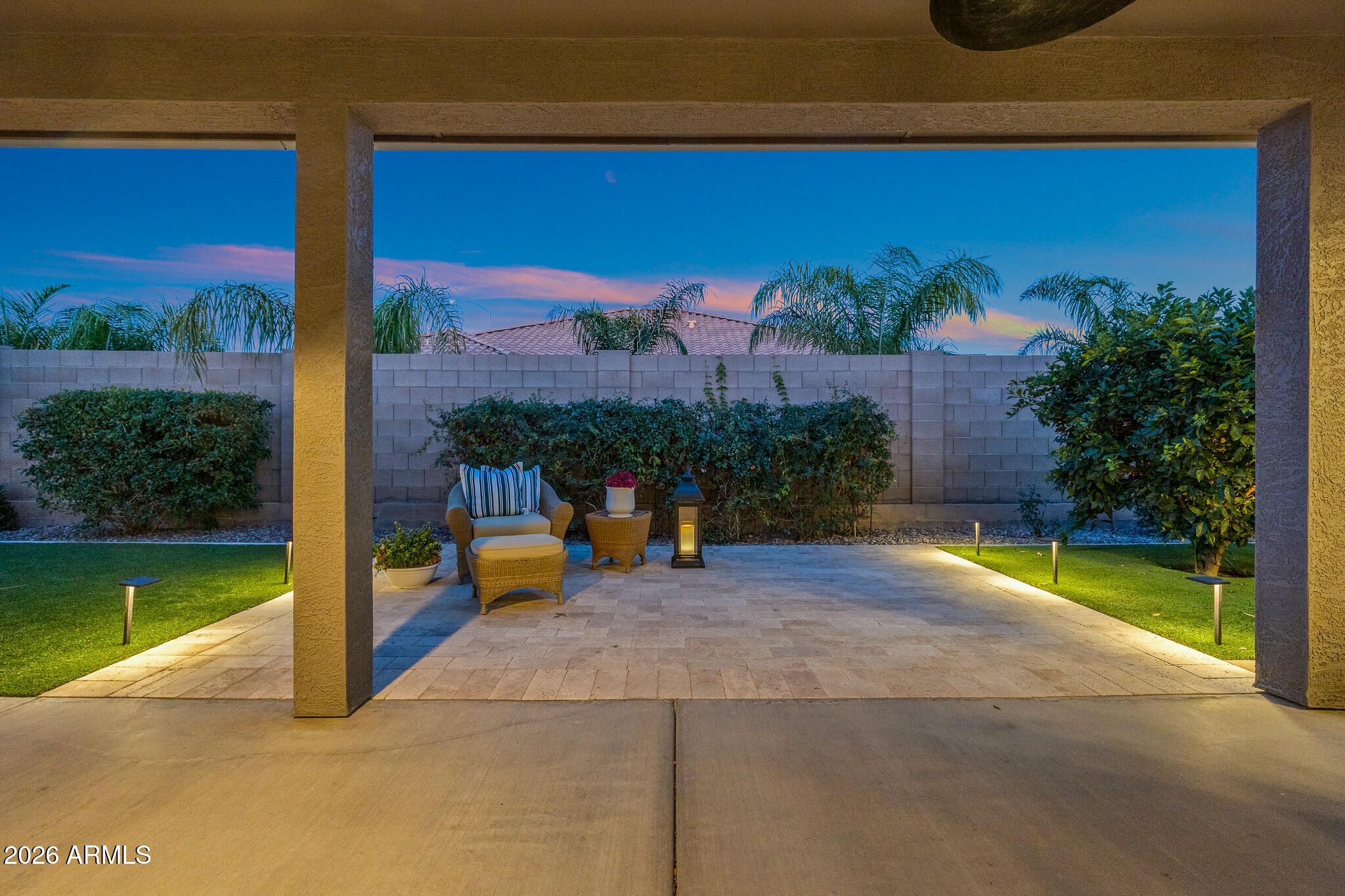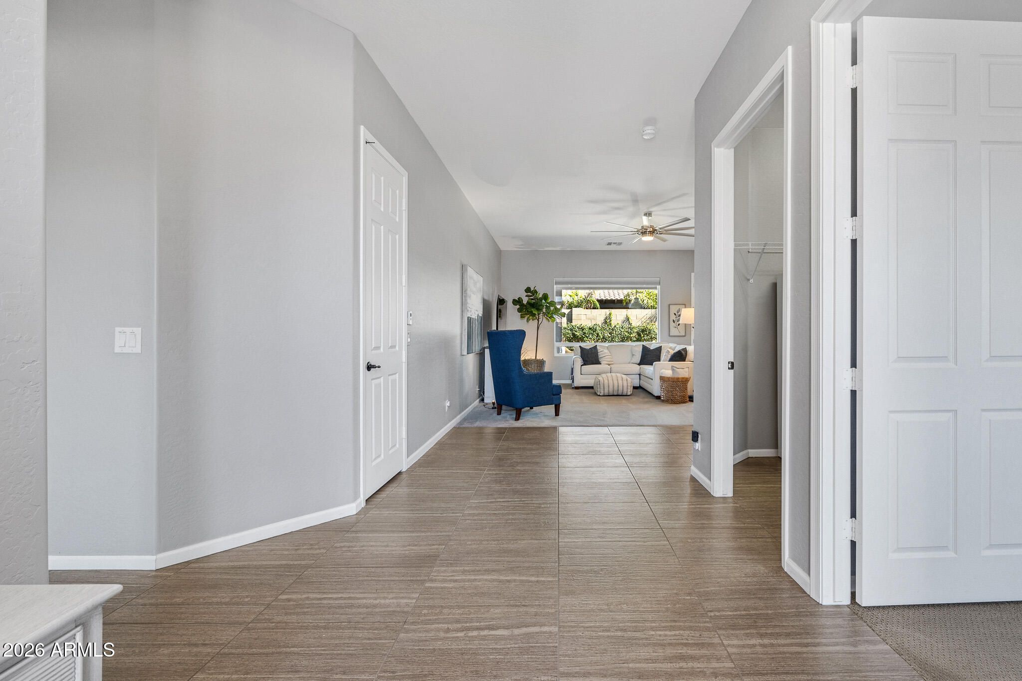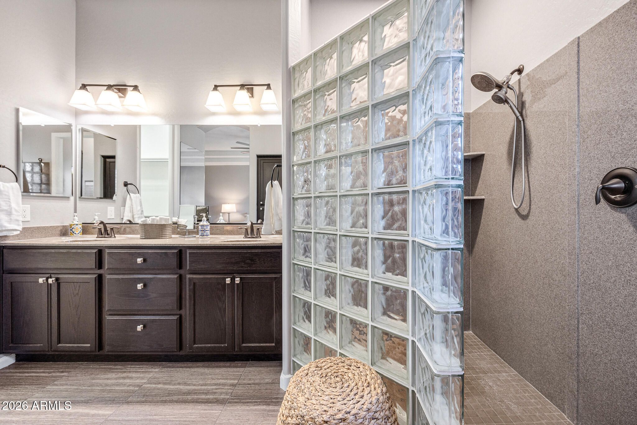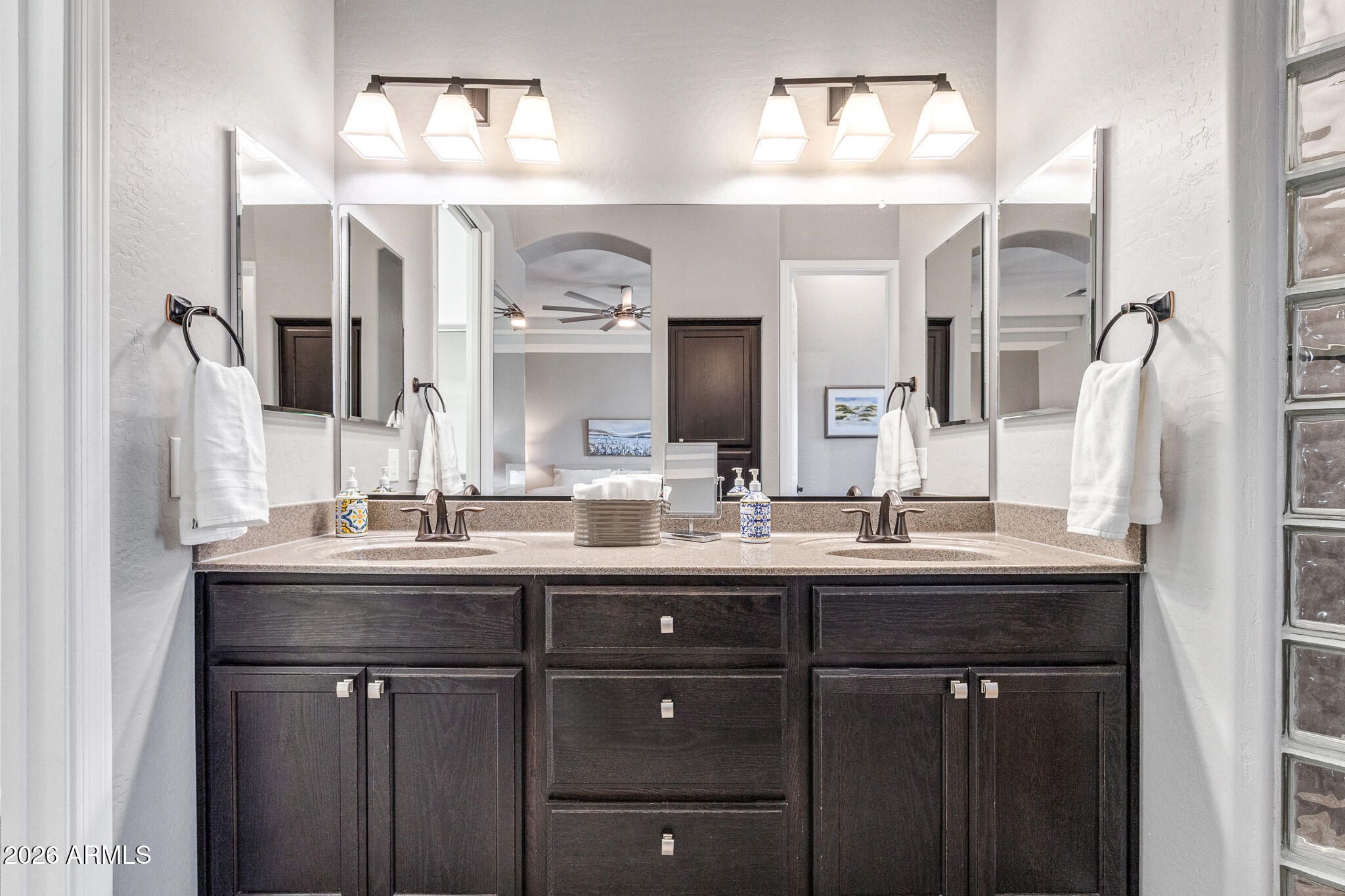 Experience exceptional living in this model-quality home in the desirable adult community of Sunland Springs, featuring top notch amenities & close to shopping, dining & entertainment. Inside, enjoy two expansive primary suites, a third full bath, & a versatile den ideal for a bedroom or office. Soaring 12' ceilings, modern finishes, & a bright open great room create an elegant feel. The gourmet eat-in kitchen features granite counters, a large island, stainless appliances, & ample storage. Outside, you will love the beautifully designed low-maintenance backyard featuring an extended covered patio, stone pavers, turf, low voltage lighting & a raised garden area. Need extra storage? Be sure to check out the tandem 3rd stall garage. Sunland Village Springs offers a plethora of activities and amenities. Some of which include: Heated Community Pool/Spas, Pickleball, Tennis, Workout Facility, Golf, Shuffleboard, Woodshop, Library, Exercise classes, Hiking Club, Billiards, Cards and so much more!
