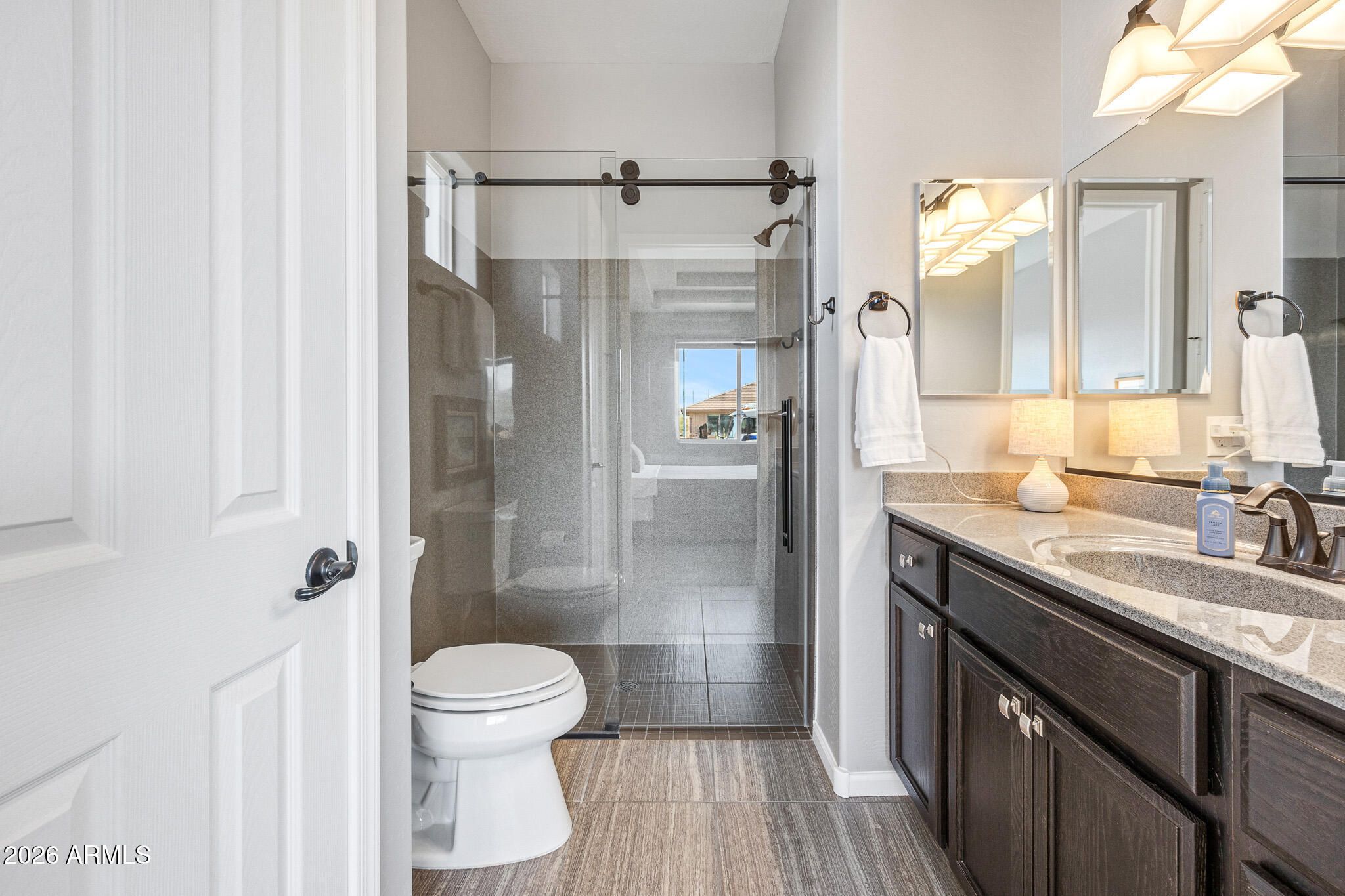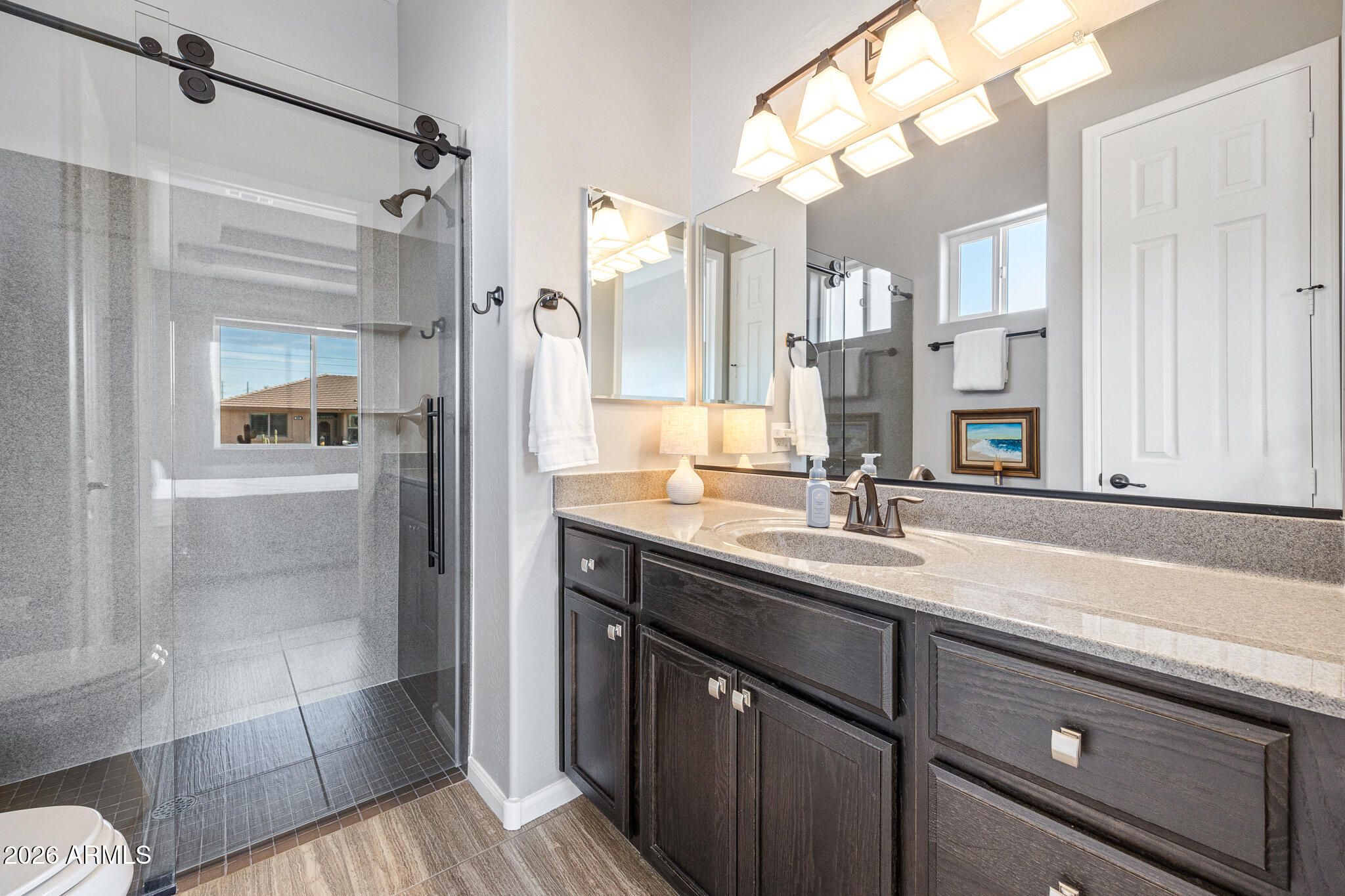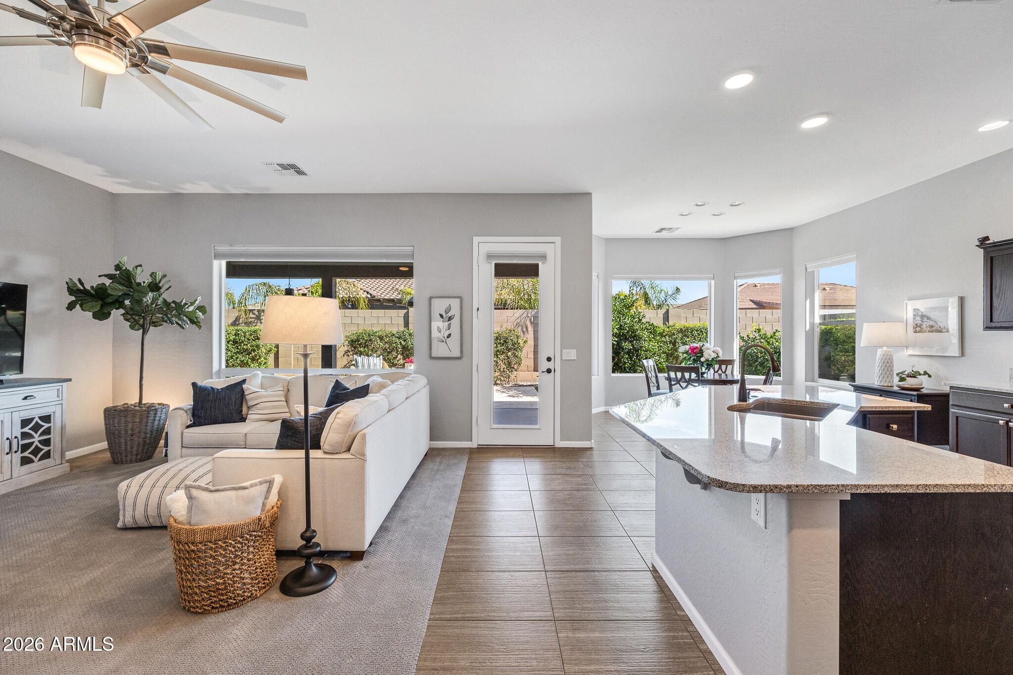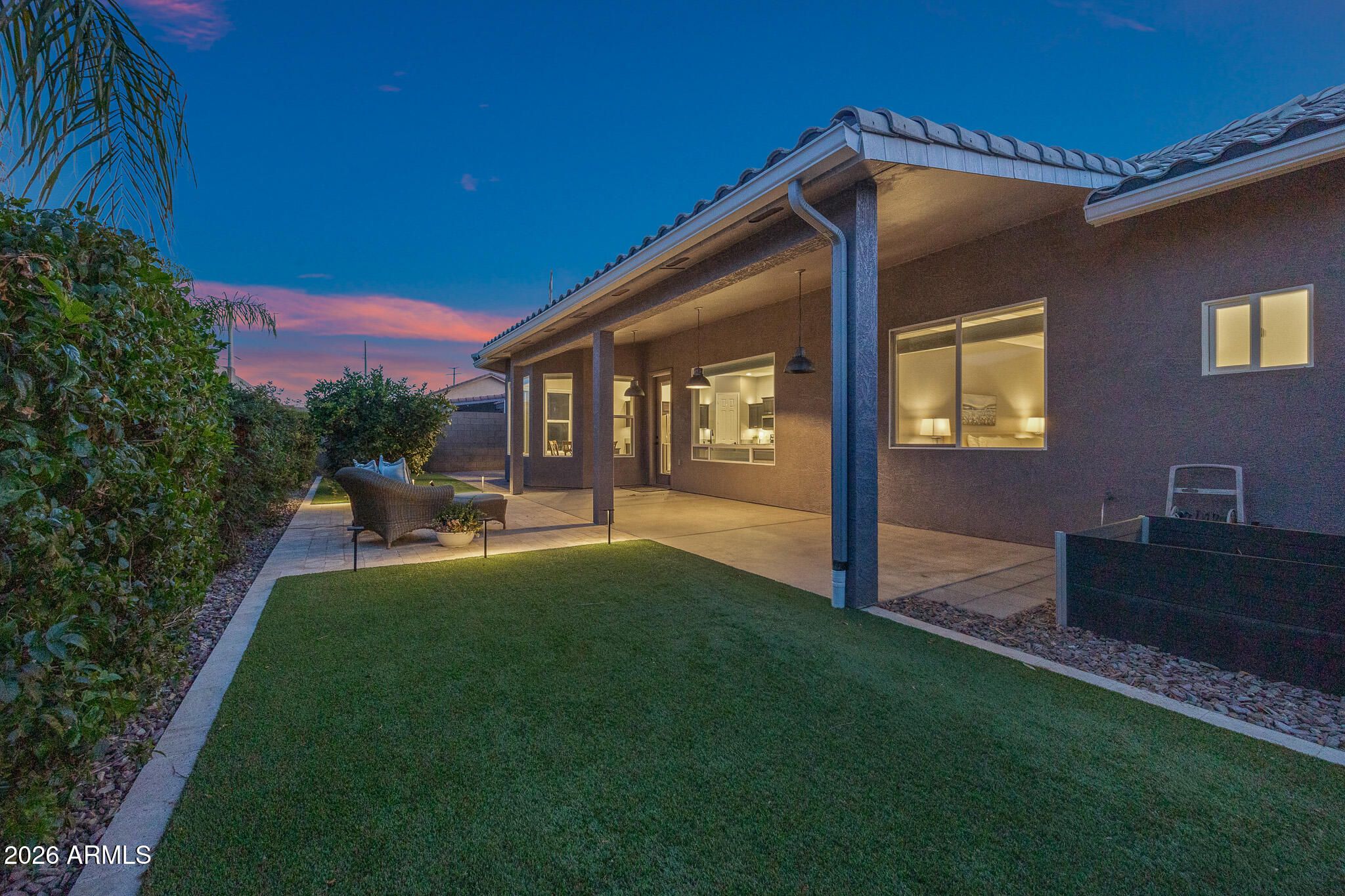 Experience exceptional living in this model-quality home in the desirable adult community of Sunland Springs, featuring top notch amenities & close to shopping, dining & entertainment. Inside, enjoy two expansive primary suites, a third full bath, & a versatile den ideal for a bedroom or office. Soaring 12' ceilings, modern finishes, & a bright open great room create an elegant feel. The gourmet eat-in kitchen features granite counters, a large island, stainless appliances, & ample storage. Outside, you will love the beautifully designed low-maintenance backyard featuring an extended covered patio, stone pavers, turf, low voltage lighting & a raised garden area. Need extra storage? Be sure to check out the tandem 3rd stall garage. Sunland Village Springs offers a plethora of activities and amenities. Some of which include: Heated Community Pool/Spas, Pickleball, Tennis, Workout Facility, Golf, Shuffleboard, Woodshop, Library, Exercise classes, Hiking Club, Billiards, Cards and so much more!