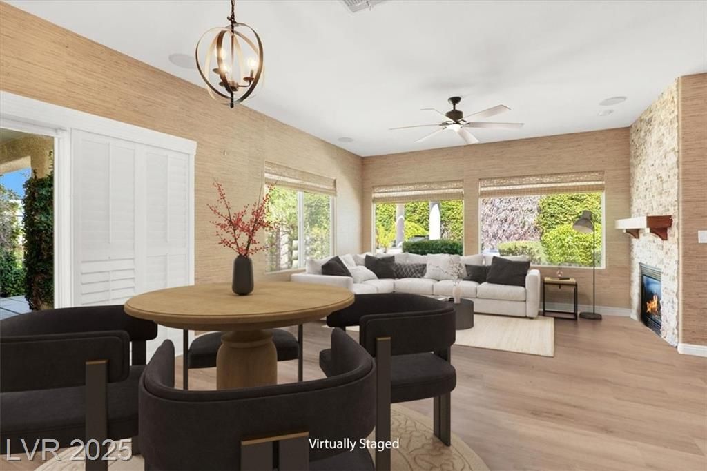 Stunning VIEWS in Sun City Anthem! Welcome to this 2,190 sqft Montgomery model featuring 3 true bedrooms & 2 bathrooms. The private primary suite boasts laminate wood flooring, plantation shutters, glass slider doors with patio access, spa-like bath with Roman tub, separate shower, infrared spa, custom walk-in closet & extra storage. Enjoy breathtaking city & mountain VIEWS from the family room & the oversized backyard (fully fenced) with custom stoned built-in BBQ island, sunken Jacuzzi, gas fire pit & covered patio—perfect for entertaining. The renovated kitchen offers Kitchen Aid SS appliances, granite counters, white cabinetry with pullouts & pantry. Upgrades include LVP flooring, surround sound, crown molding, custom lighting, Alkaline water system, spacious laundry room with utility sink & flex space. Trane A/C (2024), Air-cooled 2+ car garage features epoxy floors, storage cabinets, overhead racks & space for a golf cart. Endless community amenities in Sun City. A rare find!