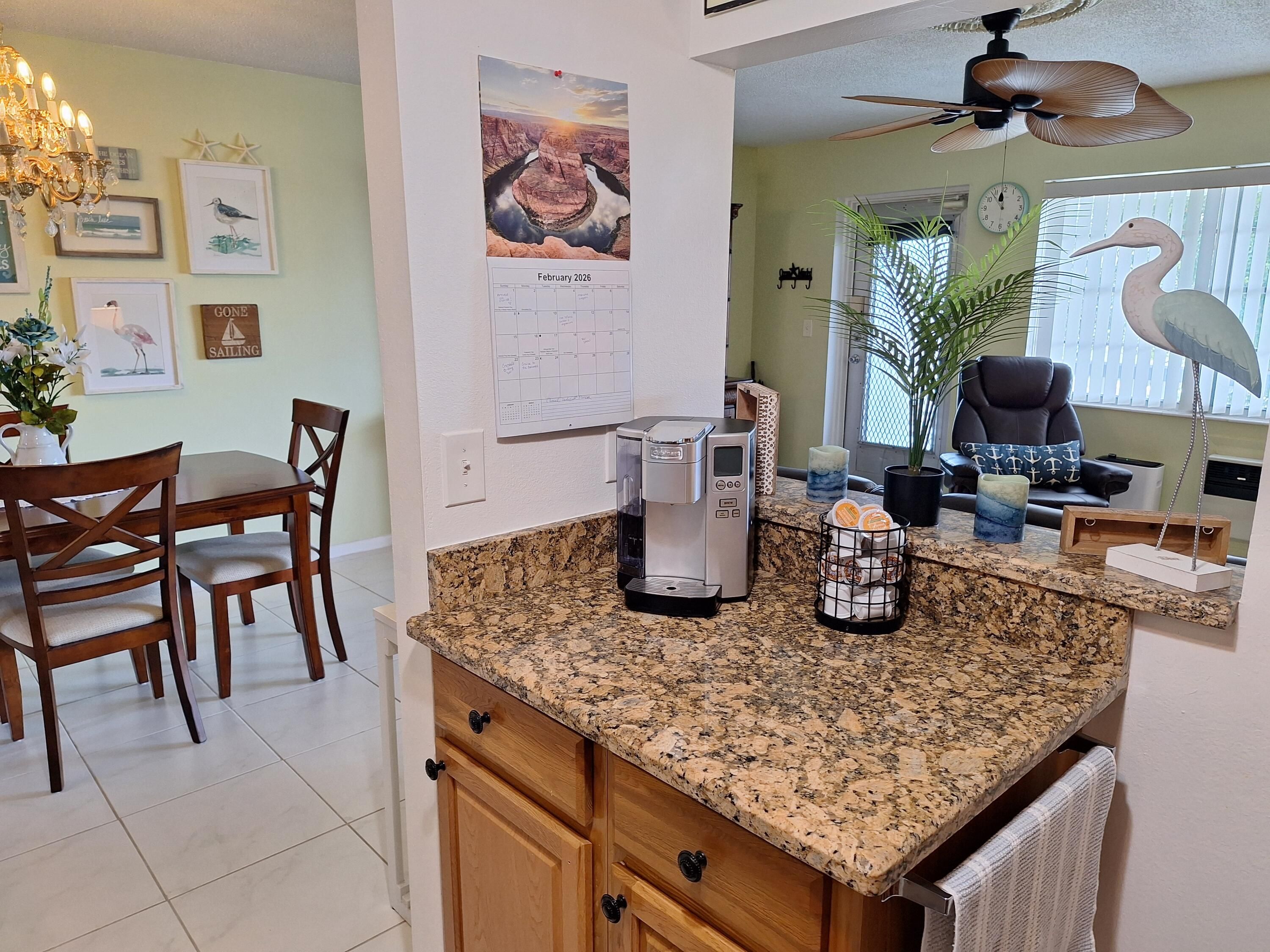 A rare opportunity to own a turnkey, pet-friendly unit that has a water view facing the eastern sunrise. Fully furnished, with everything you want or need. From the moment you enter, you will notice the comfort and pride of ownership, which has been geltly used as a winter get away. Beautiful ceramic tile floors throughout the entire living space, a kitchen that has been upgraded with top-of-the-line Samsung appliances and granite countertops, and everything that one would need, pots, pans, dishes, glasses, a Keurig coffee maker, a toaster oven, a microwave, etc. A spacious bedroom with a king-size bed flows to the screened-in patio that faces east, which has water views, to relax with a coffee or tea. This unit is a pleasure to visit and will make one lucky family very happy. The community offers everything that one would need. gated entry, several pools, and one indoor heated pool, movie theater, live performance theater, clubhouse, exercise room, pickle ball courts, free bus service, the list is endless. Come visit this special condo and you will be sold.