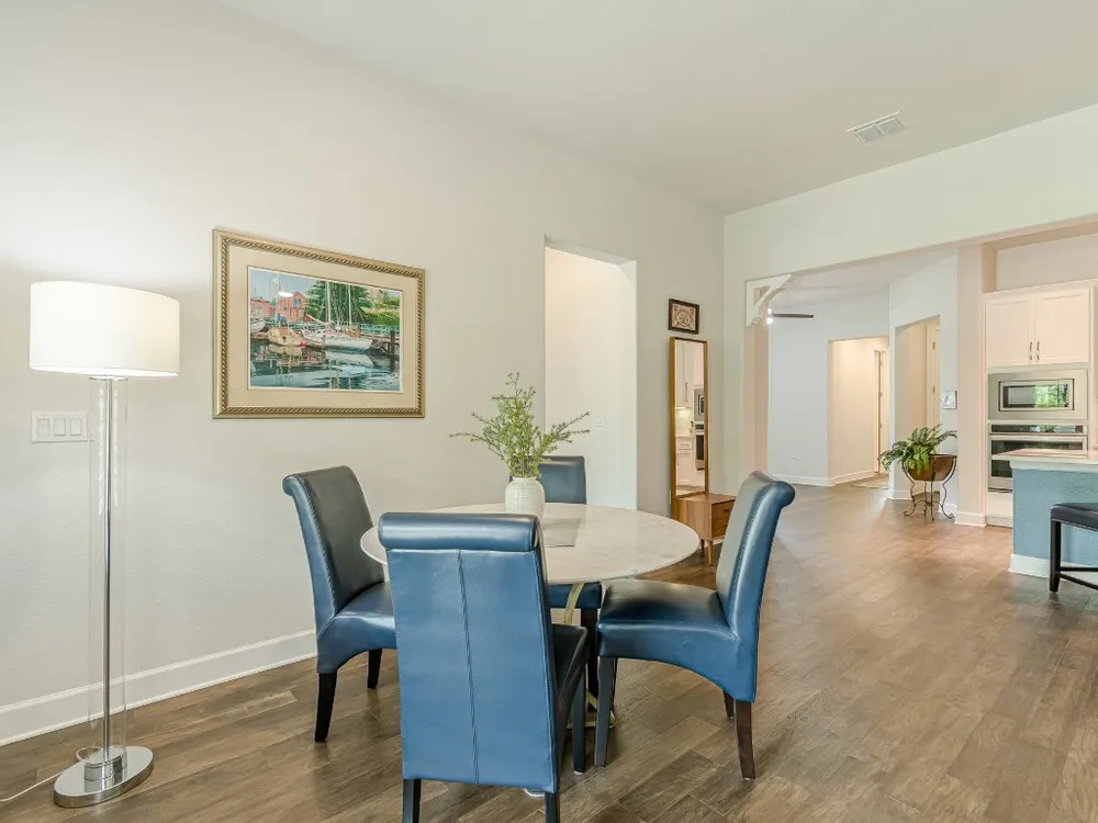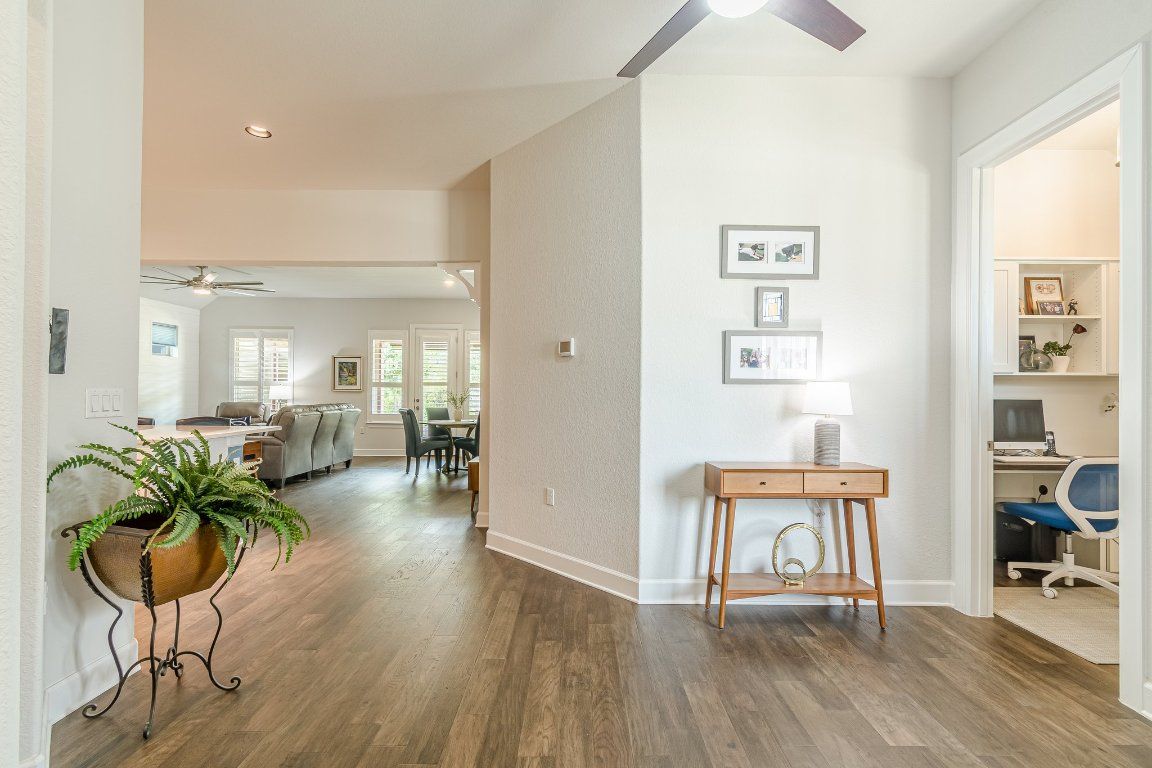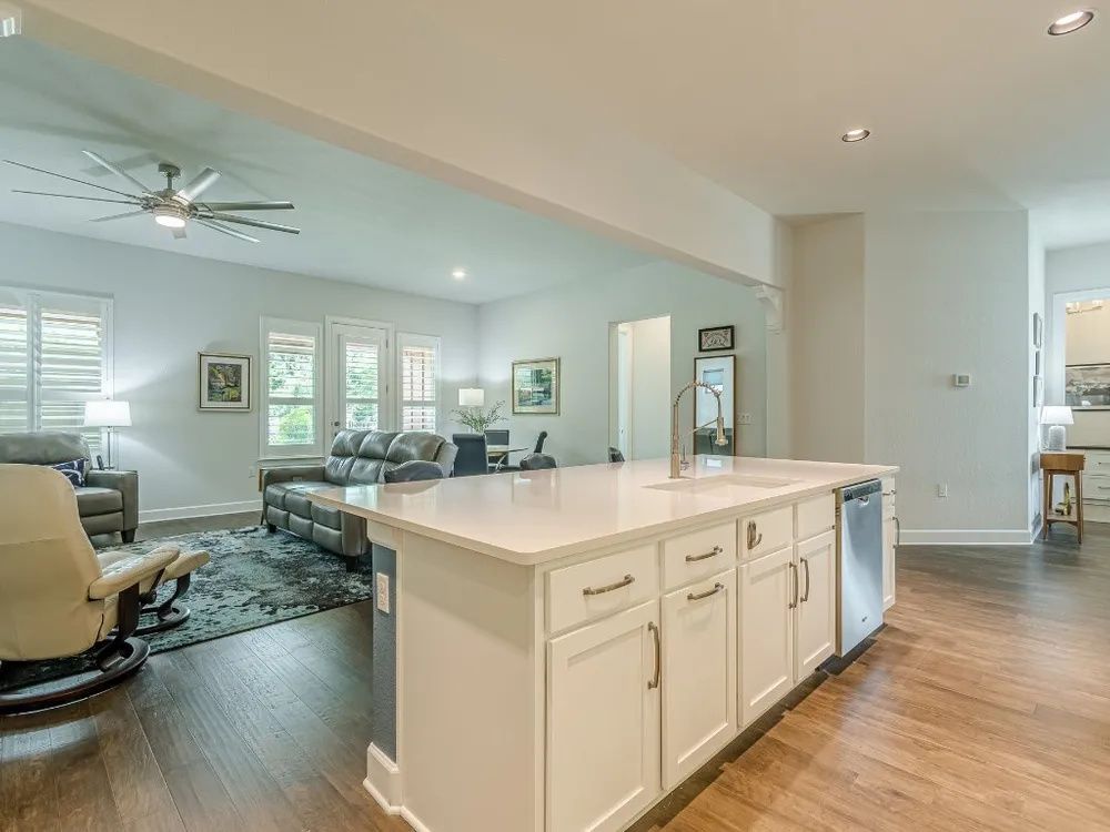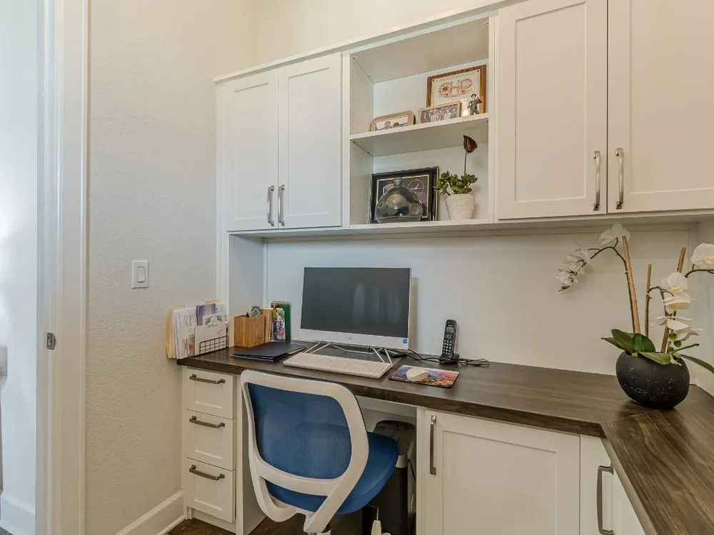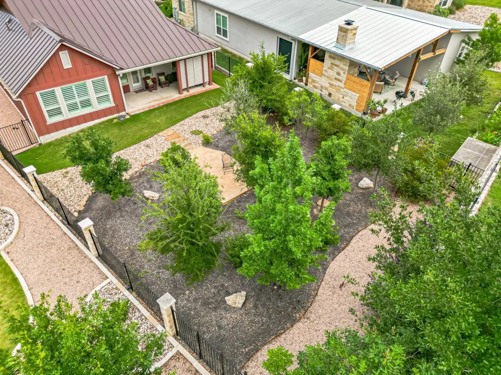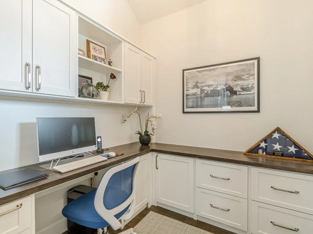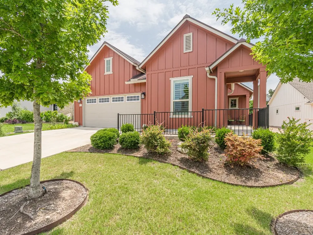 Welcome to your new home in this Davidson floor plan at the prestigious 55 plus community of Kissing Tree! This farmhouse style exterior with metal roof welcomes you home with a large oversized treed lot strategically located on a nice, quiet, cul-de-sac! Offering a unique foot print that is hard to find, with an office off the entry that includes custom built in desk and cabinetry - and an open kitchen/living at the heart of the home. Features include: wood floors, shutters throughout, white shaker style cabinetry, white quartz counters, slat board accented walls, upgraded six panel 8 foot doors, a large covered back patio, and a picture perfect backyard with extensive landscaping and trees, trees, trees! The oversized main bedroom is located at the back of the home and has a beautiful main bathroom with a good neutral color palette selection and an upgraded seamless glass shower. This home is better than new and ready to go - why wait to build, when you can have all the best options in a home and a lot location! - Reach out to schedule your private showing!