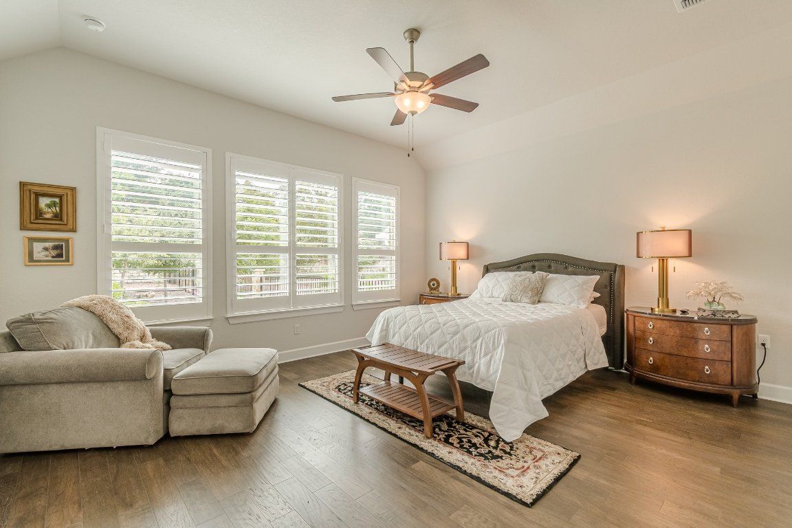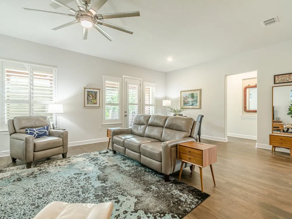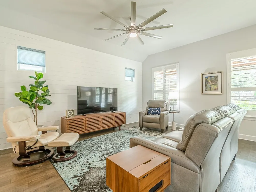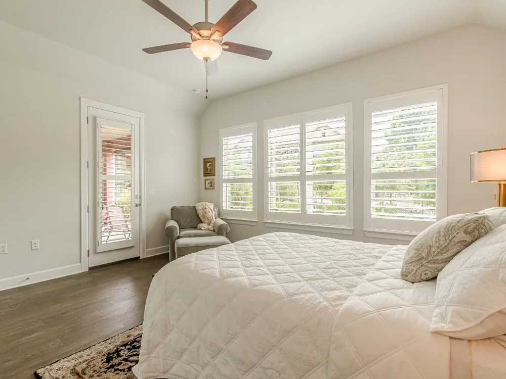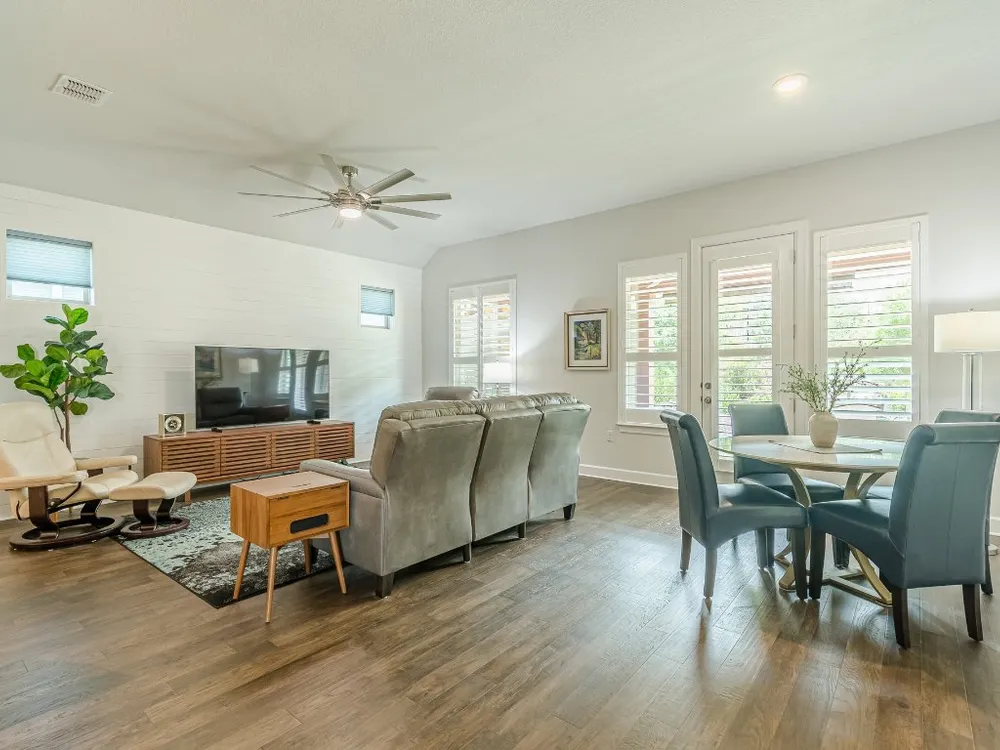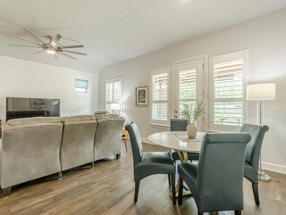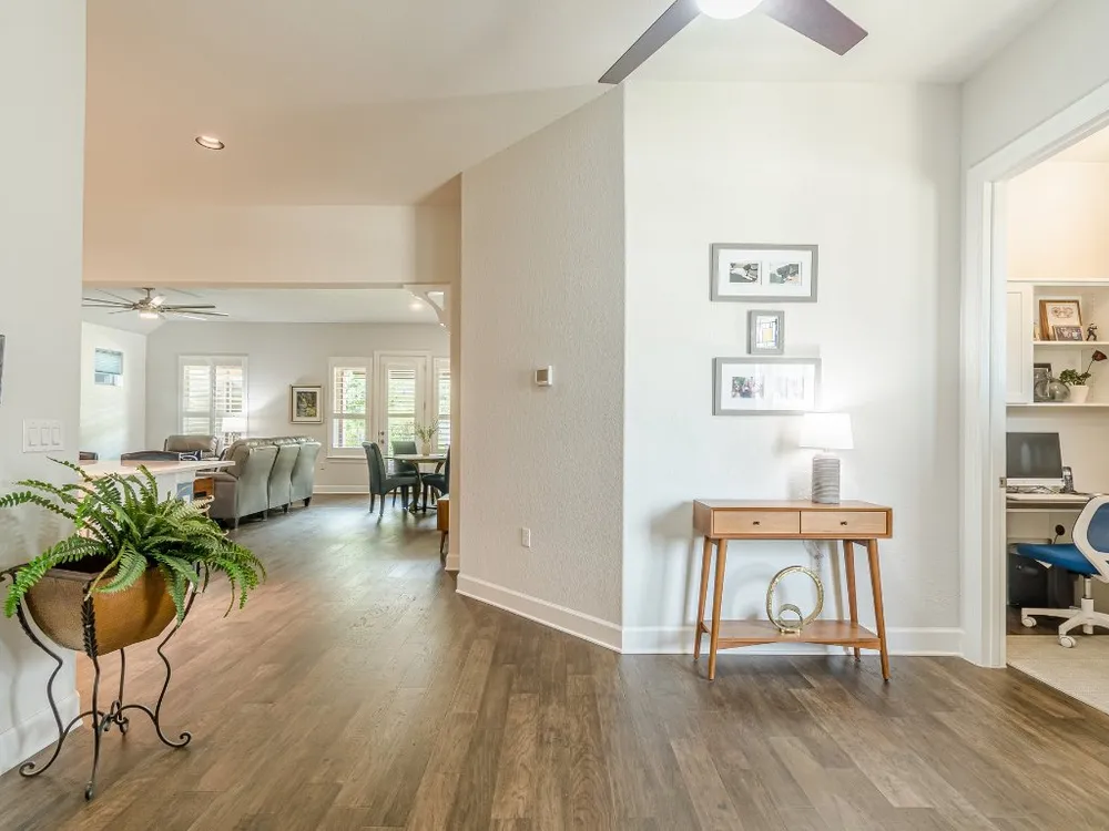 Welcome to your new home in this Davidson floor plan at the prestigious 55 plus community of Kissing Tree! This farmhouse style exterior with metal roof welcomes you home with a large oversized treed lot strategically located on a nice, quiet, cul-de-sac! Offering a unique foot print that is hard to find, with an office off the entry that includes custom built in desk and cabinetry - and an open kitchen/living at the heart of the home. Features include: wood floors, shutters throughout, white shaker style cabinetry, white quartz counters, slat board accented walls, upgraded six panel 8 foot doors, a large covered back patio, and a picture perfect backyard with extensive landscaping and trees, trees, trees! The oversized main bedroom is located at the back of the home and has a beautiful main bathroom with a good neutral color palette selection and an upgraded seamless glass shower. This home is better than new and ready to go - why wait to build, when you can have all the best options in a home and a lot location! - Reach out to schedule your private showing!