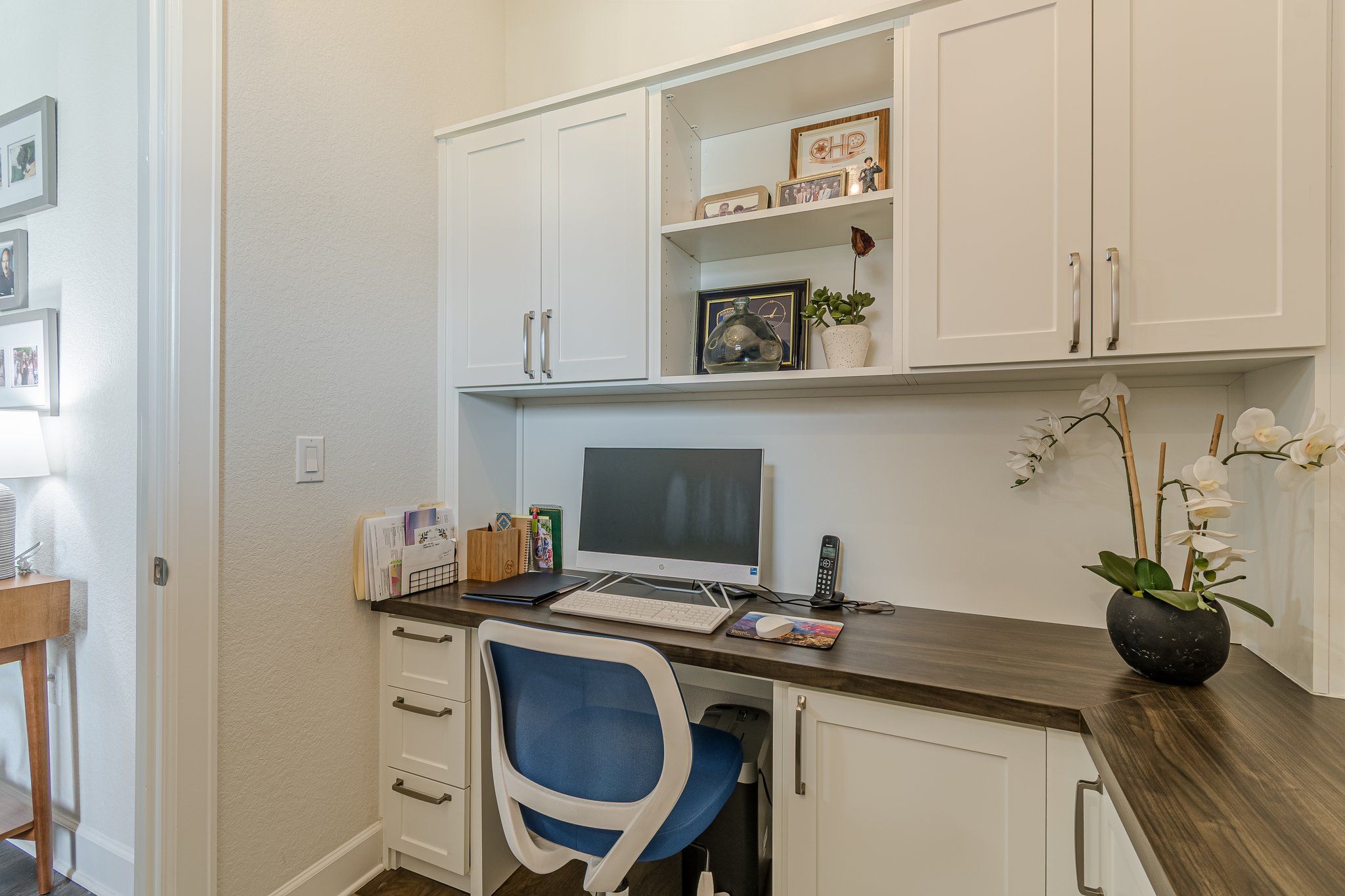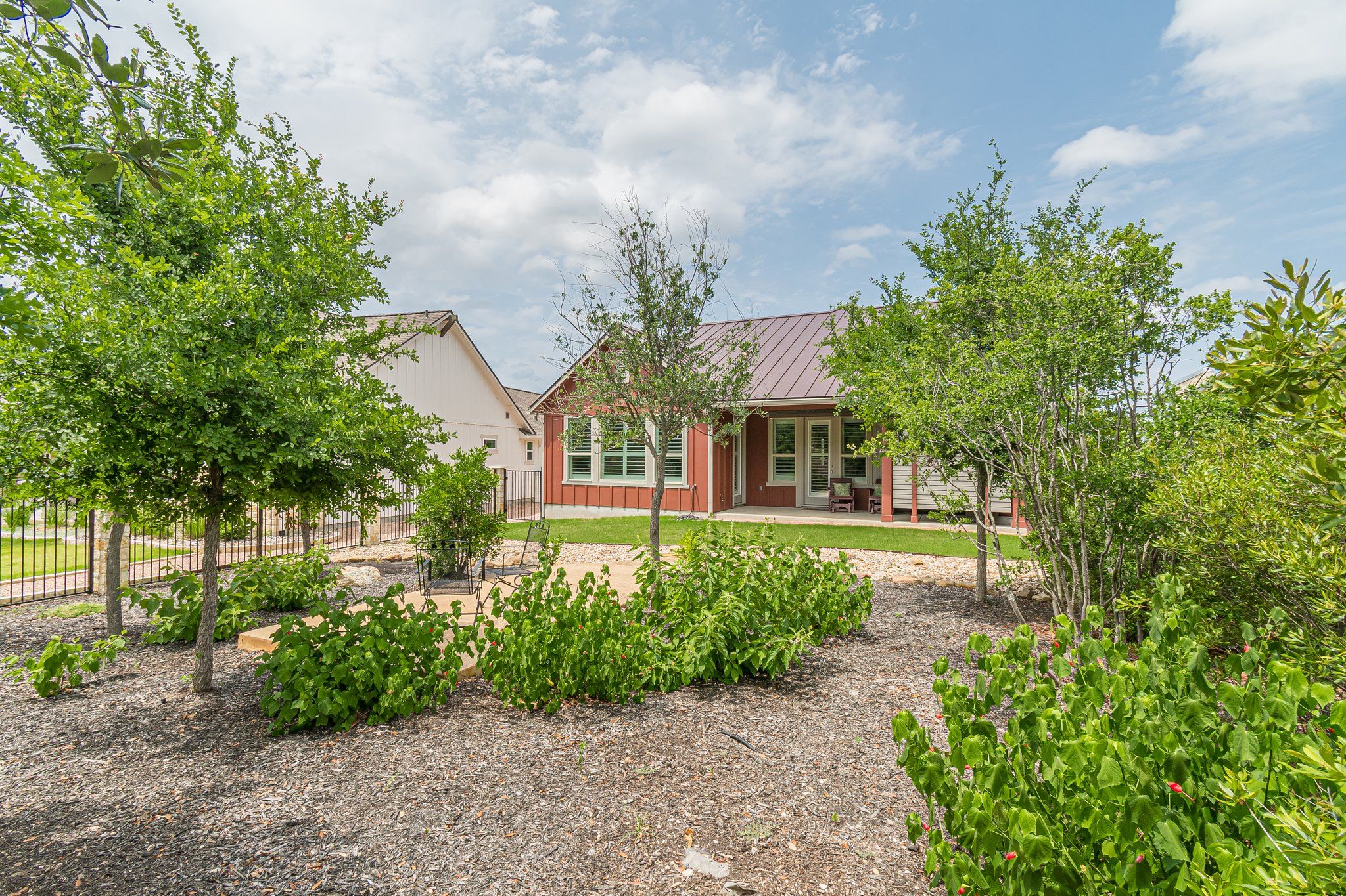 Welcome to your dream home in the highly sought-after 55+ community of Kissing Tree! This stunning Davidson floor plan showcases a charming farmhouse-style exterior with a metal roof, perfectly situated on an oversized, tree-filled lot tucked away in a peaceful cul-de-sac. From the moment you arrive, you’ll appreciate the thoughtful design and inviting curb appeal. Inside, you’ll find a unique and highly desirable layout featuring a private office just off the entry, complete with custom built-in desk and cabinetry — ideal for working from home or managing day-to-day life with ease. The heart of the home boasts an open-concept kitchen and living area, designed for both comfort and entertaining. Notable features include: Beautiful wood flooring Plantation shutters throughout White shaker-style cabinetry White quartz countertops Stylish slat-board accent walls Upgraded 8-foot, six-panel doors Large covered back patio Professionally landscaped backyard with mature trees and exceptional privacy The oversized primary suite is thoughtfully positioned at the rear of the home for added tranquility. The en-suite bath features a neutral, timeless color palette and an upgraded seamless glass walk-in shower — creating a spa-like retreat. Better than new and loaded with premium upgrades, this home offers the perfect blend of style, comfort, and location. Why wait to build when you can enjoy all the best finishes and one of the most desirable lot placements right now? Schedule your private showing today — this exceptional home won’t last long!