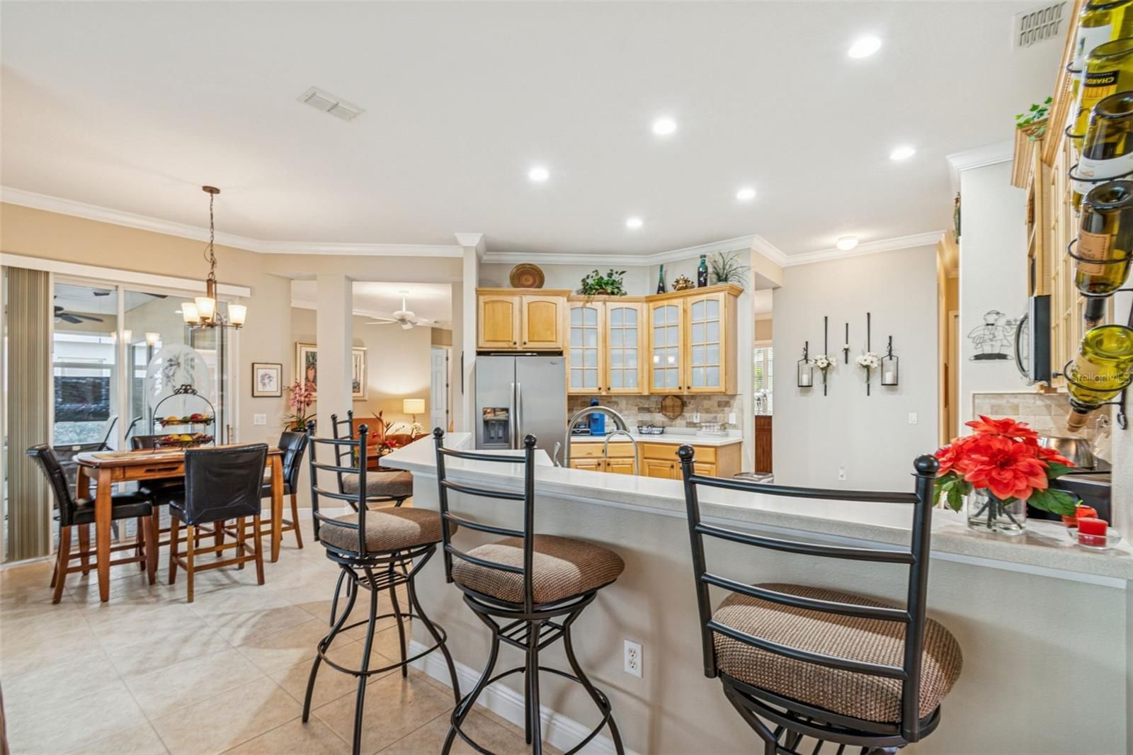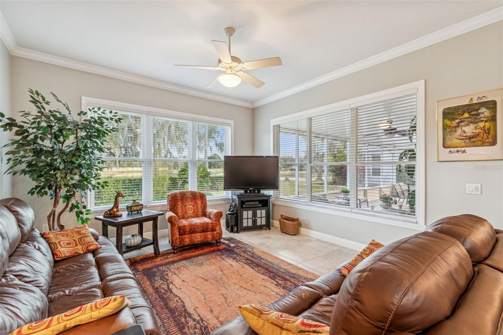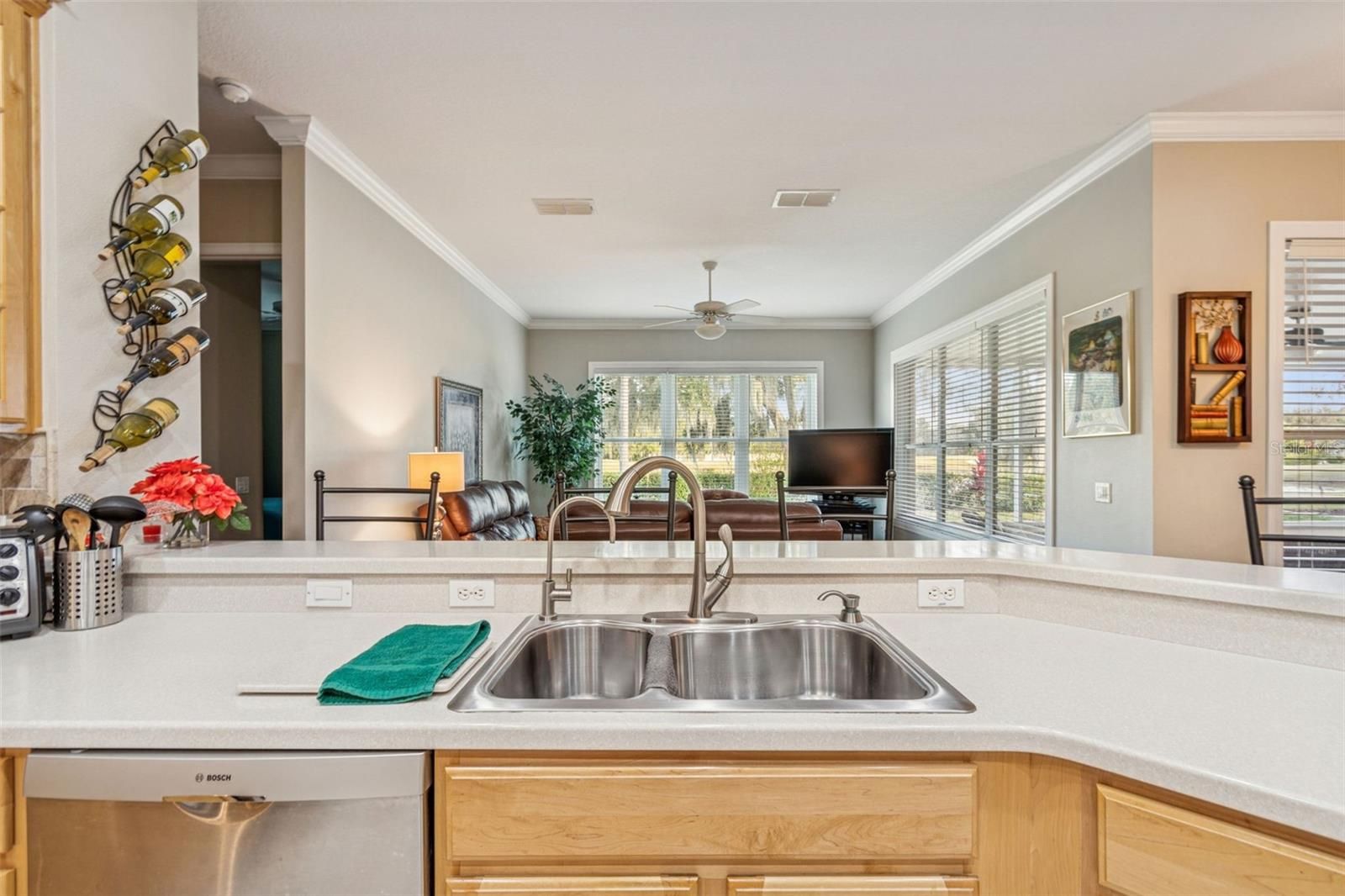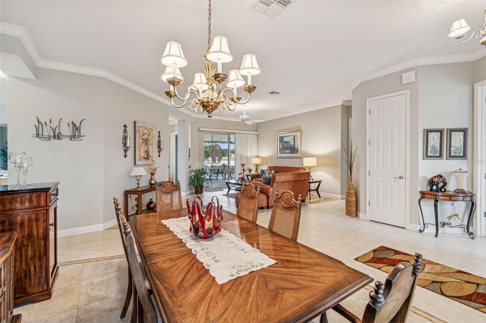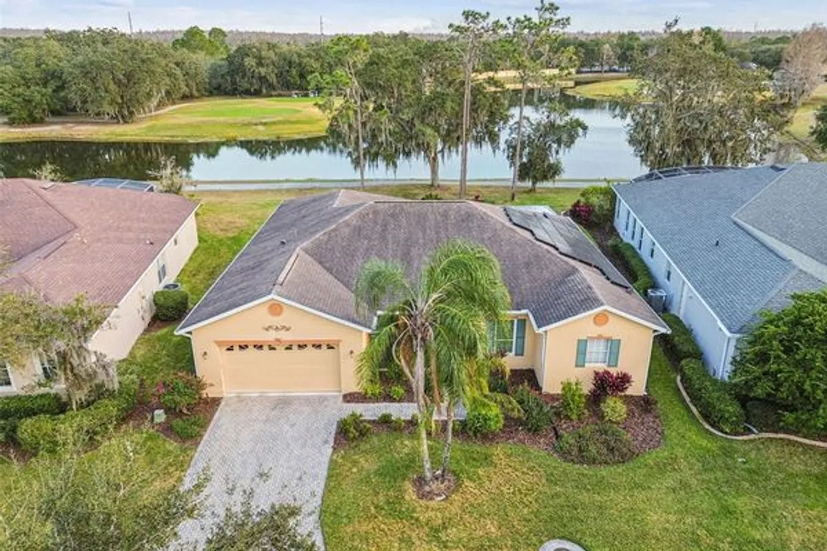 Welcome to this beautifully appointed Operetta model, offering 3 bedrooms, 2.5 bathrooms, a Florida room, formal dining room, and a den/study, perfectly positioned on an expansive water view with the golf course beyond. Enjoy serene vistas across the water to the 15th green, creating a truly special setting. A screened front entry porch and leaded glass door welcome you into the bright living room, featuring sliders that open to the impressive 528 sq. ft. covered and screened lanai—the ultimate space for relaxing or entertaining while taking in the water and golf course views. The gourmet kitchen boasts custom cabinetry with pull-out shelves, tile back splash, gas range, eat-at bar, breakfast nook, and newer appliances, making it both functional and stylish. The Florida room offers additional living space with tranquil water views. The primary suite is a private retreat with stunning water views, two walk-in closets, and an en-suite bath featuring a soaking tub, walk-in shower, dual vanities with knee space, and a separate water closet. Bedrooms 2 and 3 and the guest bath are thoughtfully located on the opposite side of the home for added privacy. The den/study is enhanced with high-end custom cabinetry and built-in desk, ideal for a home office or hobby space. A 2-car garage with golf cart hookups adds convenience. Additional highlights include owned solar panels with an average power bill of approximately $33 per month, roof replaced in 2017, HVAC system in 2021, and a water softener. This home offers exceptional indoor-outdoor living with breathtaking water and golf course views—a true Florida lifestyle gem. Solivita is a premier 55+ community, offering residents an exceptional lifestyle with state-of-the-art amenities. Enjoy a fully equipped fitness center, dance and aerobics studios, and an impressive array of recreational options including 14 heated swimming pools, two heated spas, tennis courts, pickleball courts, shuffleboard, bocce ball, billiards, and an art gallery. The community also features three on-site restaurants and two championship 18-hole golf courses. With a full calendar of activities and events, there’s always something new to explore and enjoy. This home is conveniently located near a hospital and medical office complex, shopping, dining, and a brand-new shopping center—featuring Sprouts, Outback and other popular retailers—offering the perfect balance of privacy, convenience, and an active lifestyle