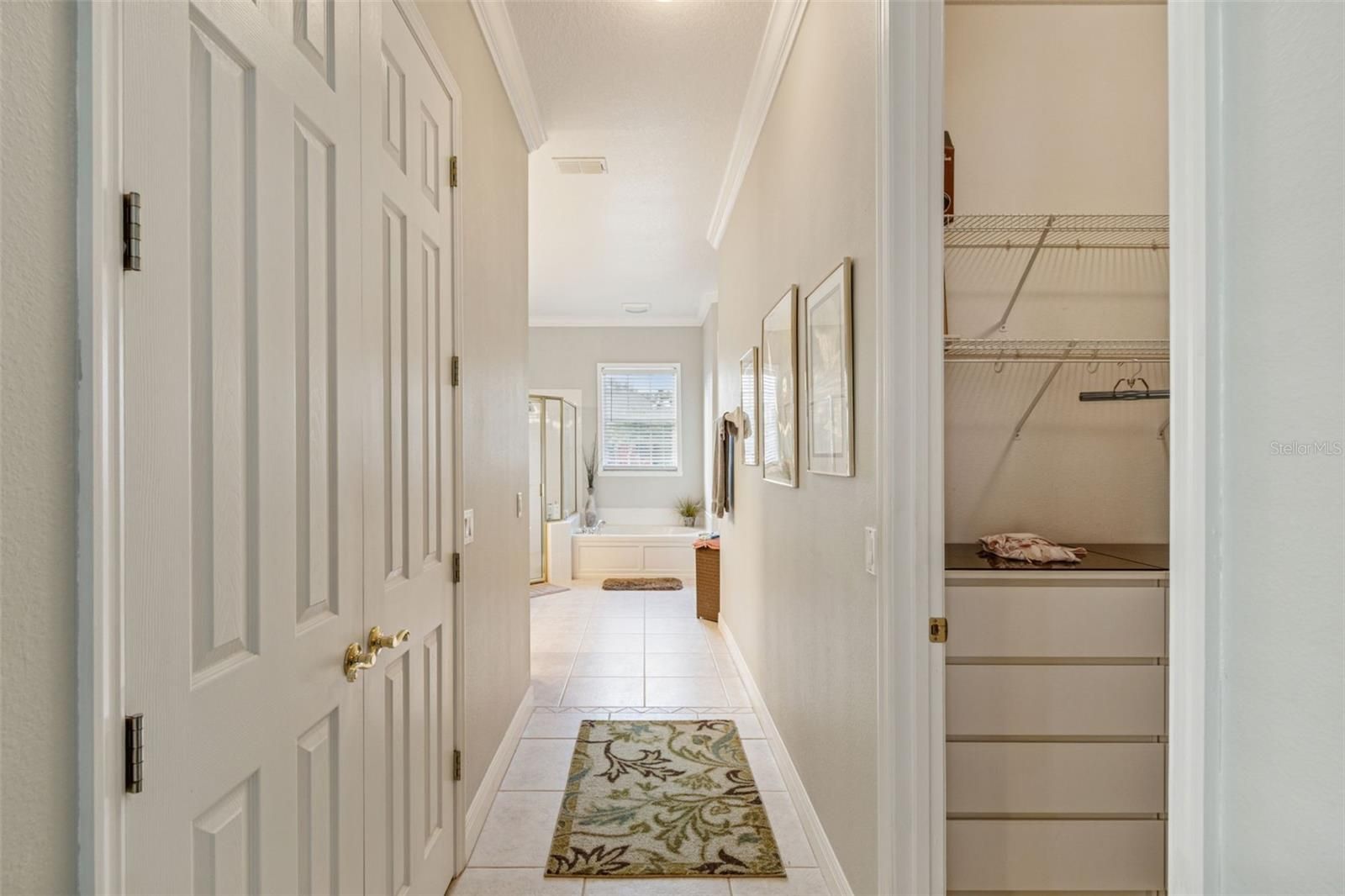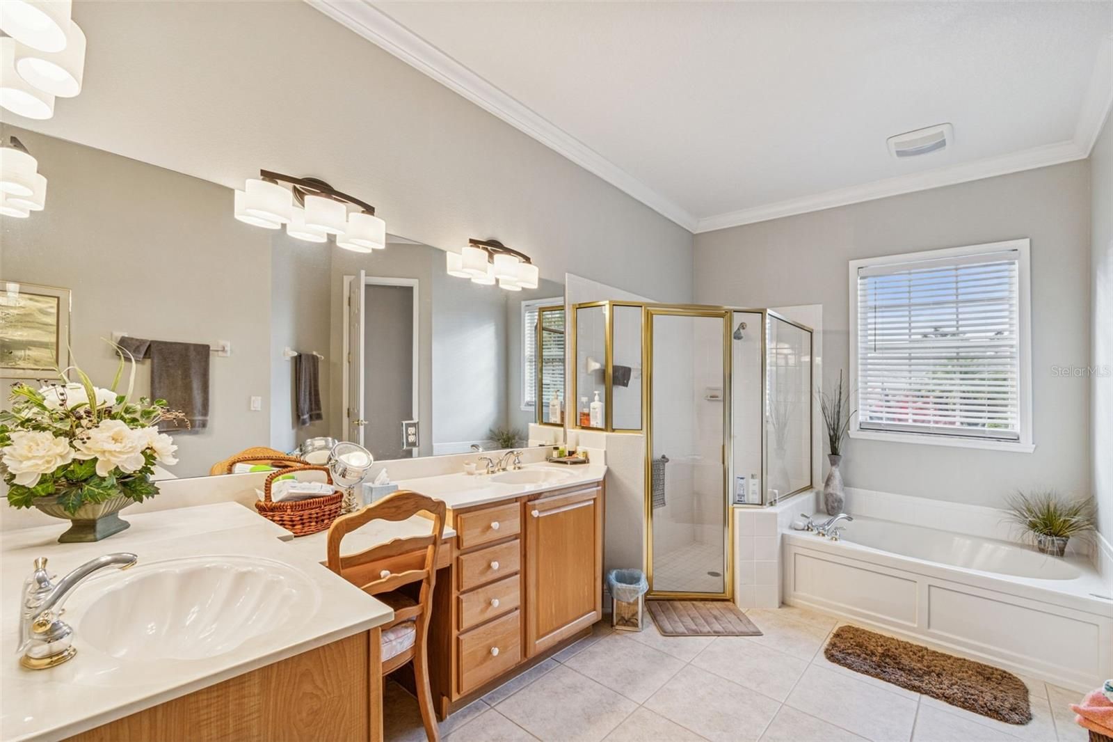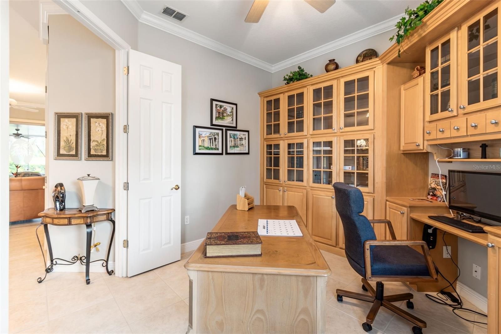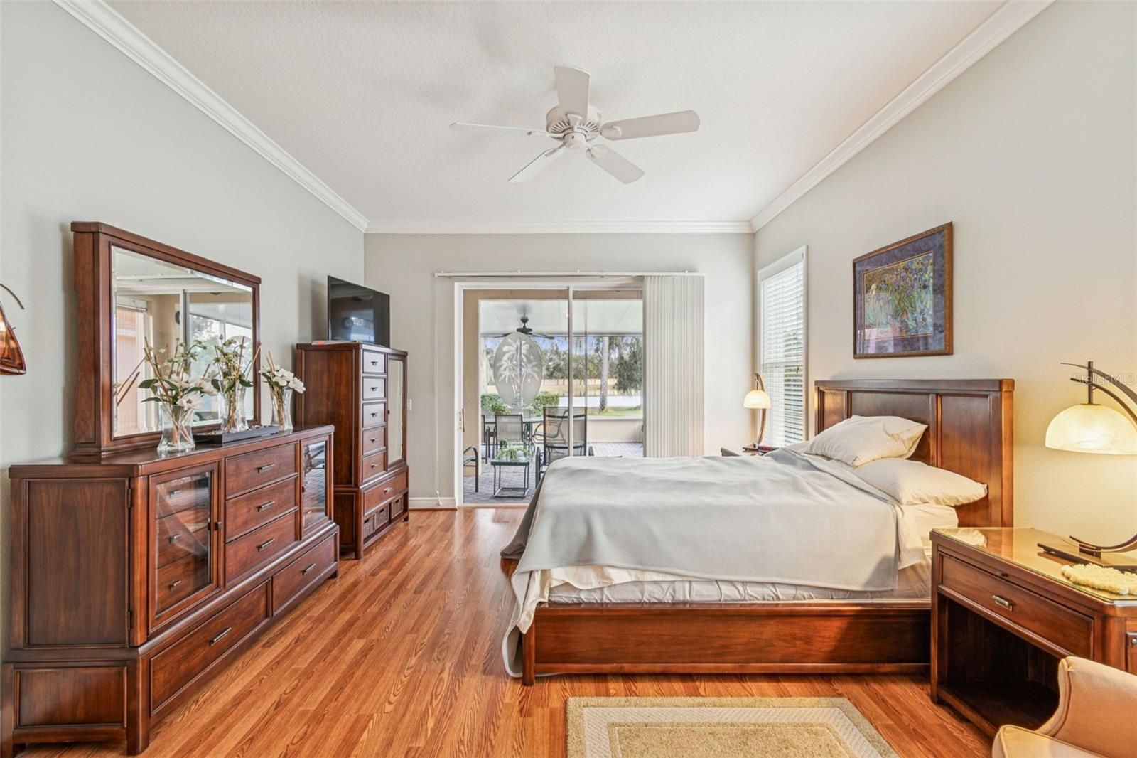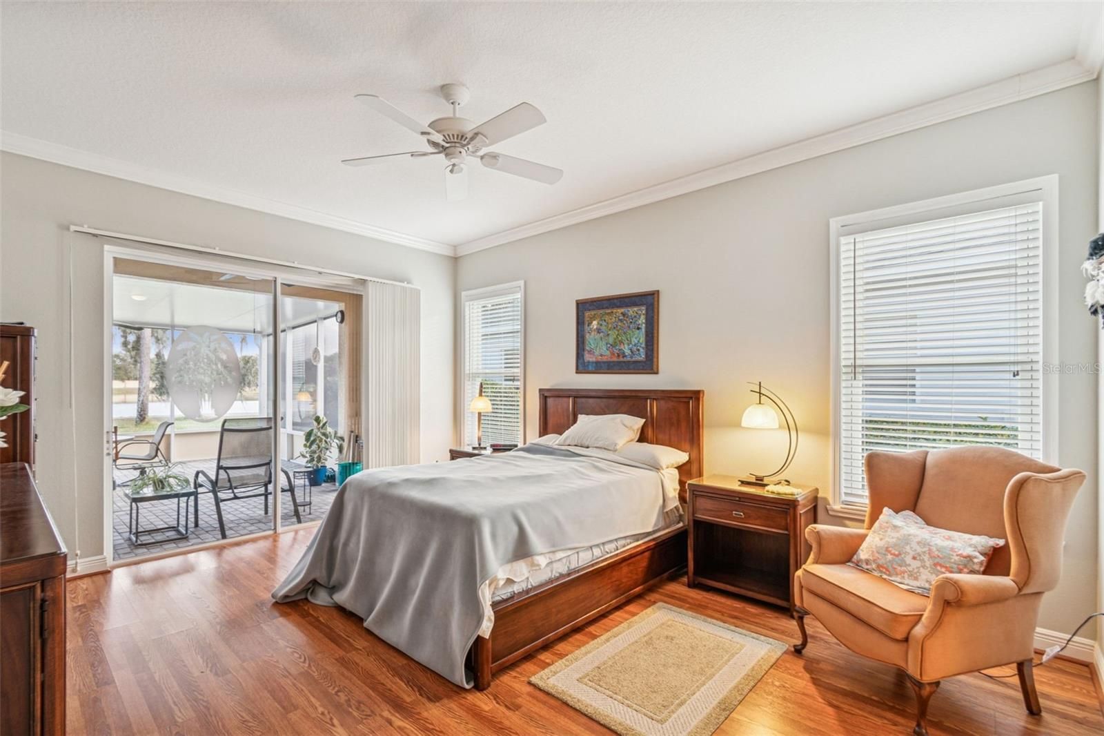 - Ceiling Fan(s), Crown Molding, Kitchen/Family Room Combo, Main Level Primary, Solid-Wood Cabinets, Split Bedrooms, Stone Counters, Thermostat, Walk-In Closet(s), Window Treatments