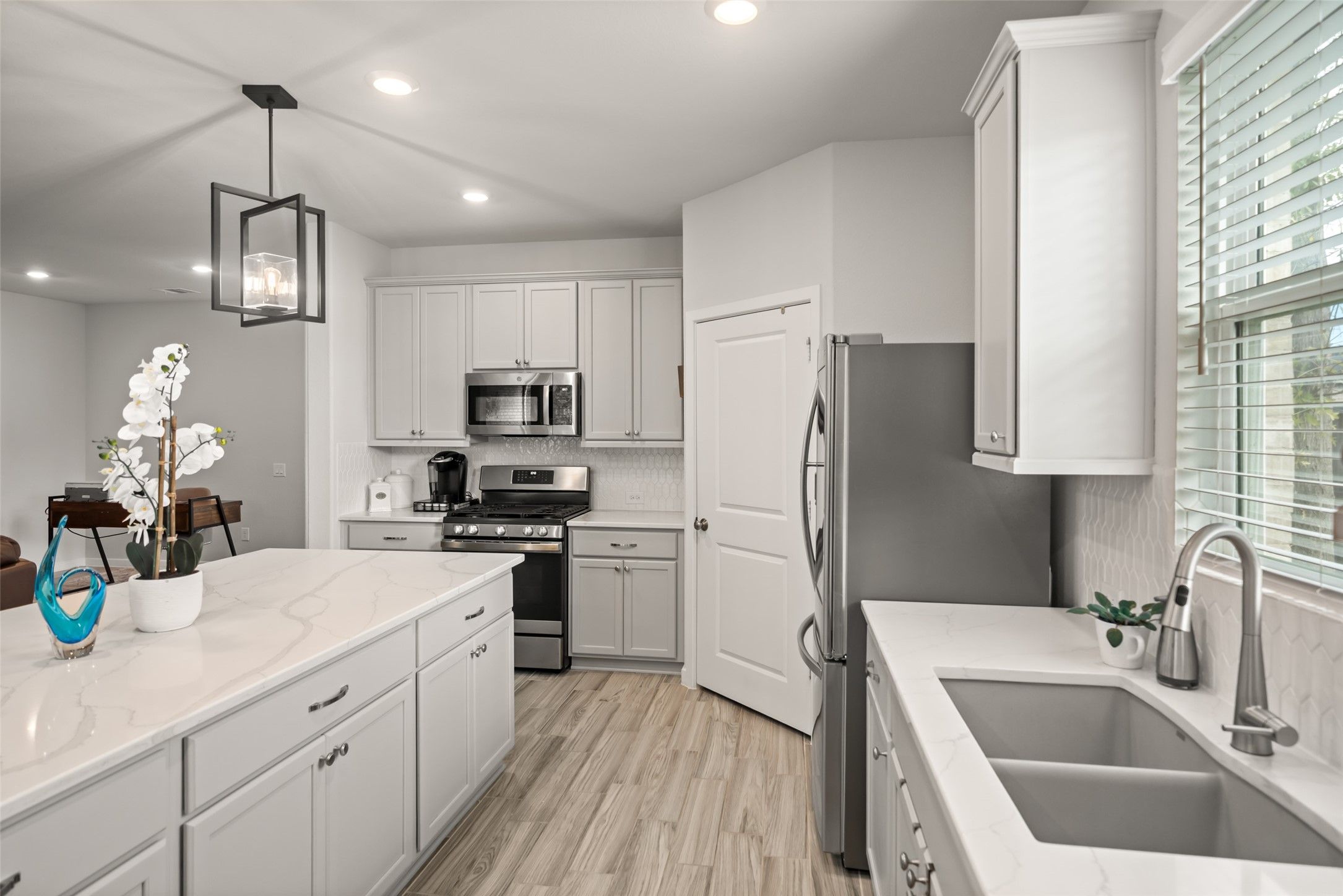 - Crown Molding, Double Vanity, Entrance Foyer, Kitchen/Family Room Combo, Pantry, Quartz Countertops, Tub Shower, Walk-In Pantry, Window Treatments, Kitchen/Dining Combo