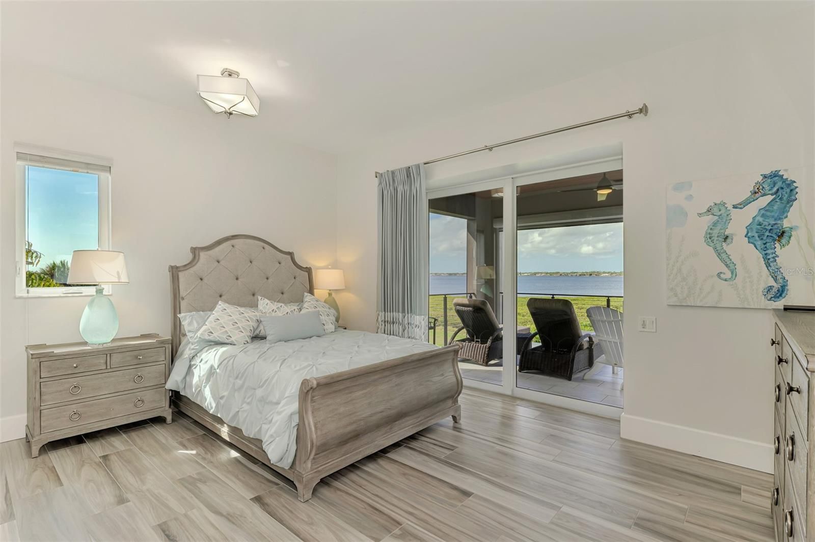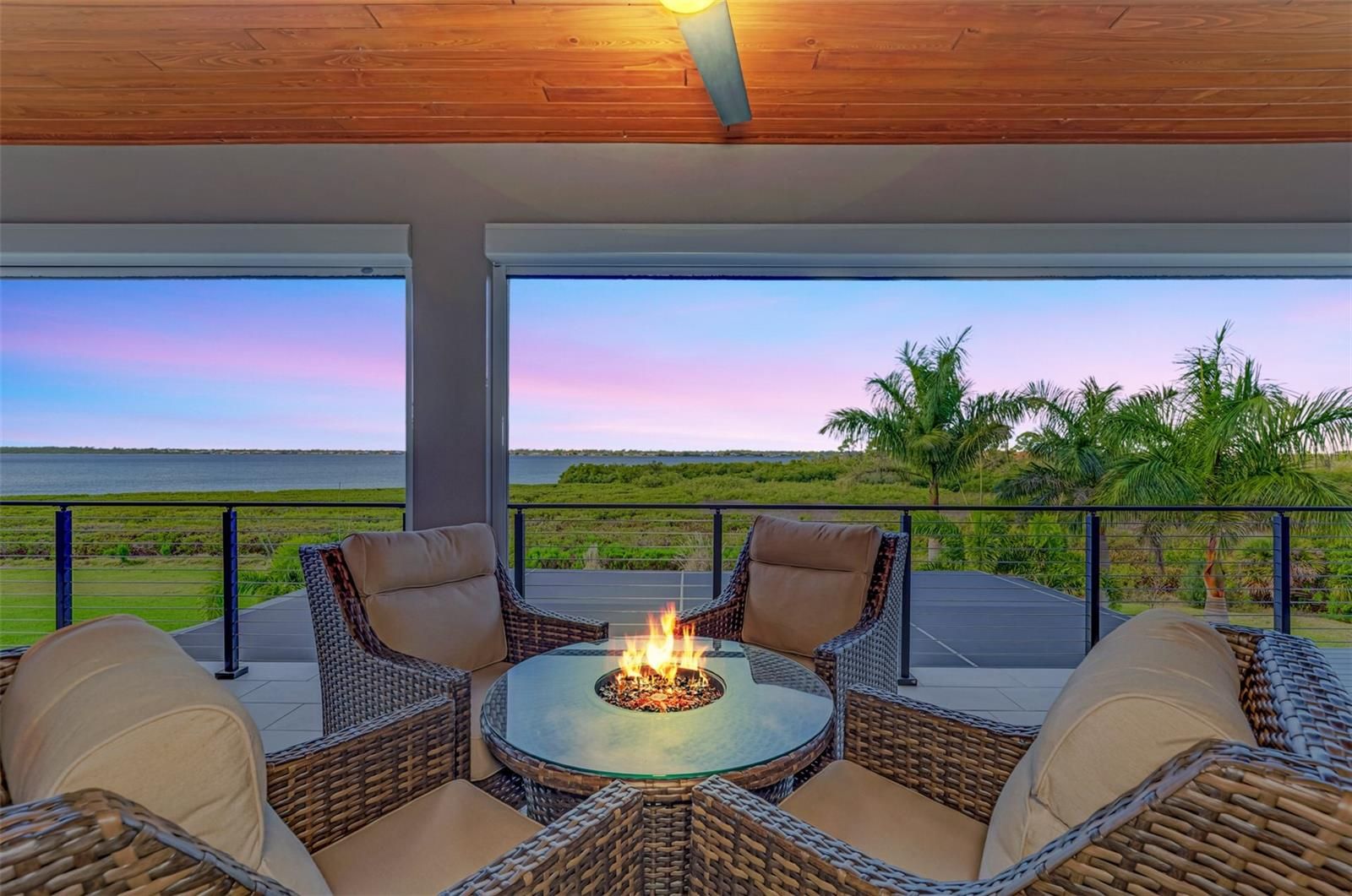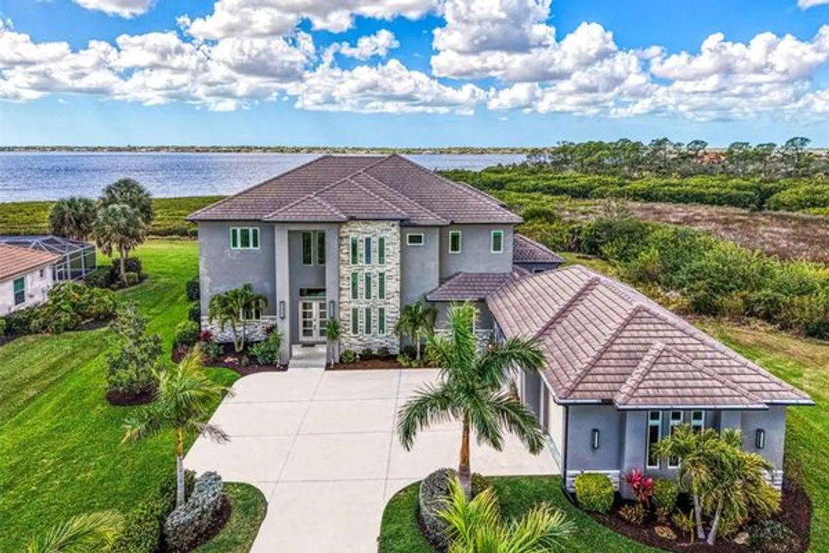 RIVERSIDE of RIVERWOOD – Exclusive Modern Florida Living on a Grand Scale. Captivating panoramic views of the Myakka River, lush preserves, and breathtaking sunsets are enjoyed from every level of this spectacular 2021-built riverfront estate. This well-constructed two-story residence with private elevator offers 4 bedrooms, 4.5 baths, a den, and over one acre of prime waterfront property, truly a rare riverfront jewel. From the moment you arrive, the architectural curb appeal impresses. An extended palm-lined driveway leads to an oversized three-car garage plus golf cart bay. The welcoming foyer opens to a dramatic great room with soaring 22-foot coffered ceilings and a wall of glass framing the expansive lanai, resort-style pool and spa, and tranquil river beyond. Contemporary design, superior craftsmanship, and designer lighting, window treatments, tile, fixtures, and flooring are showcased throughout. The gourmet kitchen is designed for entertaining, offering sprawling granite countertops, oversized center island, wet bar, walk-in pantry, top-of-the-line appliances, and adjacent formal dining. Tray ceilings, abundant windows, and sliding glass doors flood the home with natural light, creating seamless indoor-outdoor living. The main level features a private en-suite bedroom, den with direct lanai access, second bedroom ideal as an office, half bath, and ample storage. Outdoor living is exceptional with a fully equipped kitchen with gas grill and smoker and convenient full pool bath. Ascend the decorative wood staircase or elevator to the second-floor primary retreat featuring a private balcony overlooking the river, dual walk-in closets and vanities, freestanding tub, and expansive Roman shower. An additional guest bedroom with full bath and upstairs laundry complete the level. Additional highlights include impact-rated hurricane and UV-protected windows and doors, handicap-accessible baths, whole-house oversized generator, and 1,000-gallon propane tank. Residents enjoy private fishing, canoeing, and kayaking from the Riverside pier with frequent dolphin, snook, and redfish sightings.Located within Riverwood, a premier resort-style community offering Riverwood Golf Club, activity center with lap and resort pools, fitness center, pickleball, tennis, croquet, bocce, art room, library, dog parks, and vibrant social events. Optional memberships available for golf, dog park, and private beach club on Manasota Key. Ideally located near spring training for the Tampa Bay Rays and Atlanta Braves, Gulf beaches, Charlotte Harbor, Punta Gorda, Venice, Englewood, and Boca Grande, positioned between Sarasota and Fort Myers. A rare opportunity to own a magnificent riverfront estate blending coastal elegance, nature, and luxury resort living.