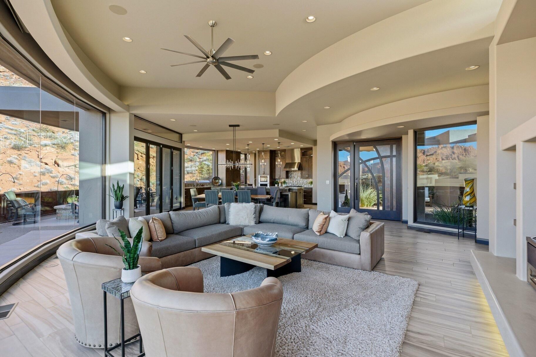 Elevated in the Cliffs of Snow Canyon, this exceptional home offers a front-row seat to one of Southern Utah's most iconic landscapes. Floor-to-ceiling butted glass captures sweeping canyon views while filling the home with natural light and seamlessly blending indoor and outdoor living. The custom designed layout features 3 bedrooms plus a private office, highlighted by high-end finishes and generous spaces ideal for entertaining. The thoughtfully designed kitchen is both striking and functional, showcasing premium appliances, sleek cabinetry, and abundant storage for effortless everyday living and hosting. The primary suite serves as a private sanctuary with stunning views and a spa-inspired outdoor shower. Multiple outdoor fire pits extend the living space and set the stage for sunset gatherings and starlit evenings overlooking Snow Canyon.