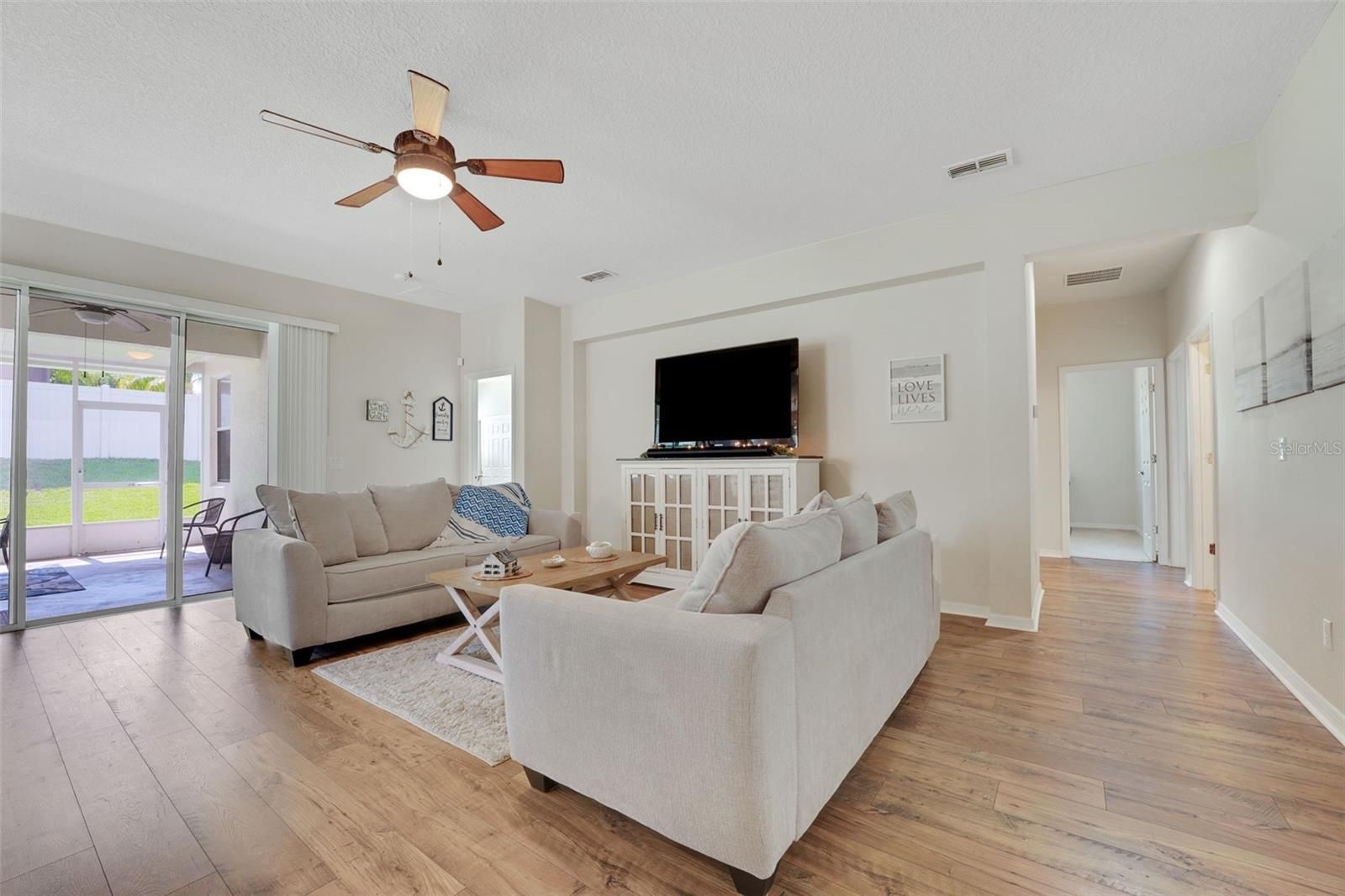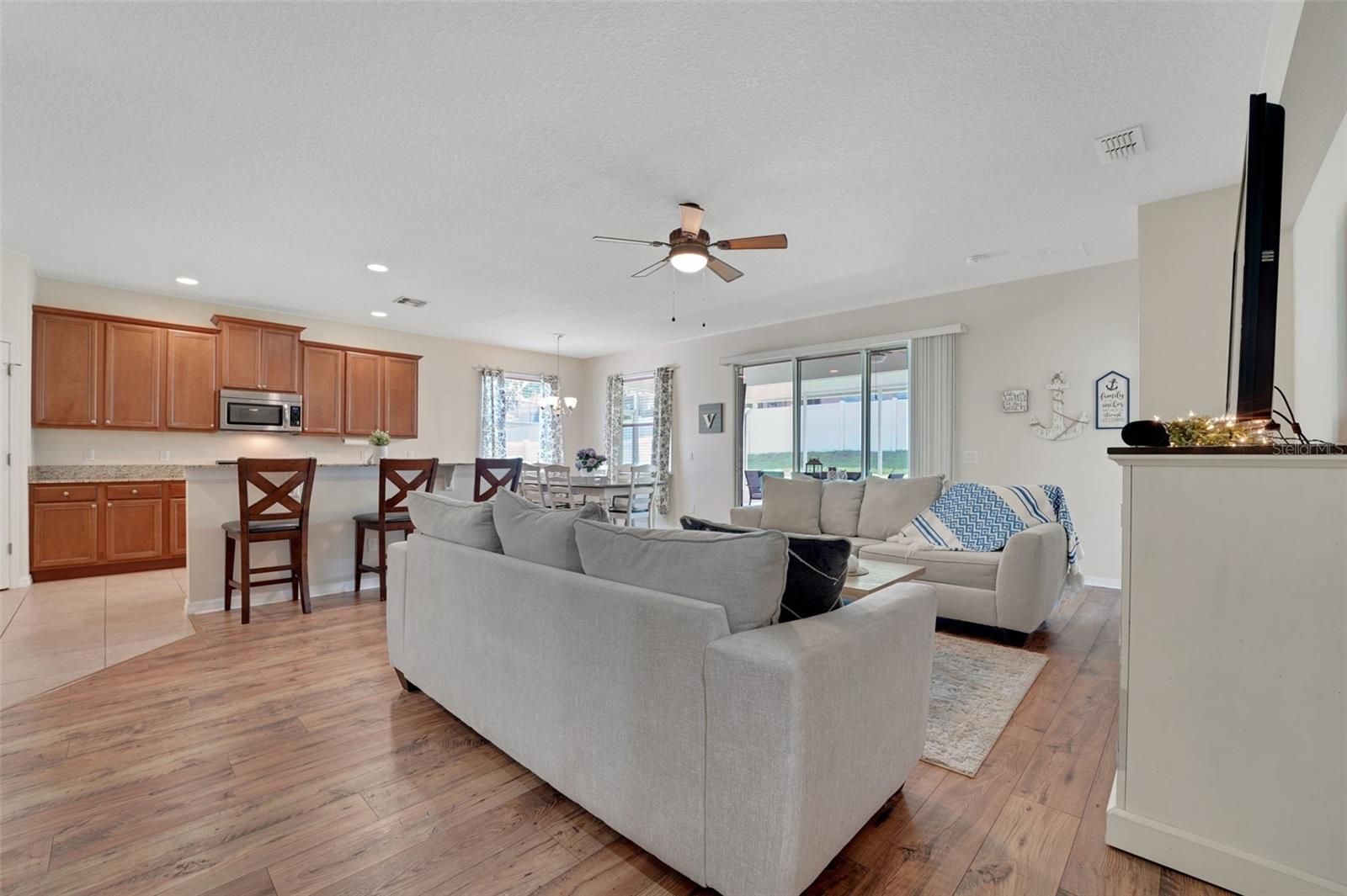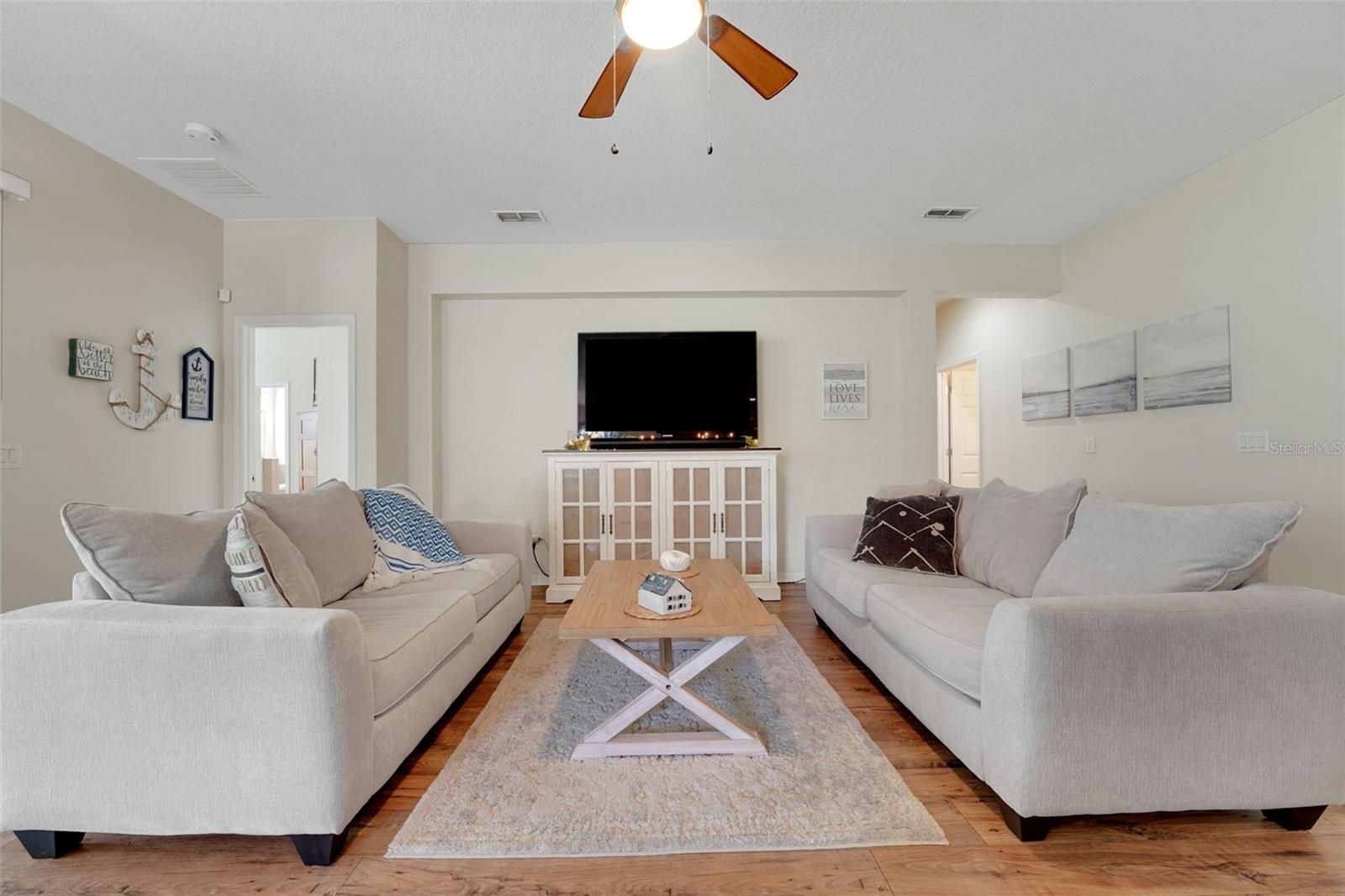 Welcome to 30532 Gidran Terrace, a warm and elegant 4-bedroom, 2-bath single-family home in the desirable gated Sullivan Ranch community of Mount Dora, Florida. This home offers 2,426 sq ft of open-concept living space situated on almost a 1/4 acre lot. The 3-car garage provide ample room for vehicles and storing odds and ins. Upon entering the home, you will find a large foyer area adorned with crown molding and will immediately notice the bright, airy atmosphere. Both the interior and exterior of the home was recently professionally painted making this home truly move-in ready. Just off the entry is a generous bonus room that's an ideal space for a second family room, home office, or formal dining area, offering flexibility to suit your lifestyle. The popular split floor plan was designed with privacy and practicality in mind. The entire HVAC system is brand new, ensuring efficient cooling and heating for years to come during the Florida summers. New luxury vinyl plank (LVP) flooring extends through the main living areas and into the master bedroom, creating a modern look that’s both stylish and easy to maintain. The living room and kitchen areas are precisely located in the center of the home, perfect for family gatherings or entertaining friends. The gourmet kitchen is a chef’s delight, featuring granite countertops, solid 42-inch wood cabinets for abundant storage, and a amazingly large center island perfect for prepping or socializing. Upgraded stainless steel appliances, including a new refrigerator and dishwasher, add elegance, style and convenience. The three additional guest bedrooms recently had brand new carpet installed. The oversized laundry room with built-in cabinets and an industrial-sized sink is just another additional bonus this home offers. The Owner's suite is a tranquil retreat. This spacious bedroom features beautiful flooring, an extra-large walk-in closet to accommodate an extensive wardrobe along with a smaller secondary closet. The en-suite bathroom provides a spa-like experience with dual vanities, a relaxing garden tub, a separate walk-in shower, a private water closet, and a generously sized linen closet. Step outside and enjoy the covered and screen-enclosed patio that invites Florida's weather all year-round. This expansive outdoor living area is perfect for morning coffee, weekend barbecues, or simply unwinding after a long day. The completely fenced backyard offers privacy and plenty of room for outdoor activities or gardening. Sullivan Ranch isn’t just a neighborhood, it’s a lifestyle. Enjoy an array of resort-style amenities, including an impressive 5,000 sq ft clubhouse, a fully equipped fitness center, a Junior Olympic-size swimming pool for laps or lounging, a playground complete with a splash pad, a fenced dog park for your four-legged friends, and miles of lighted walking trails flow throughout this picturesque community. Just minutes from historic downtown Mount Dora, this location allows you to enjoy the quaint shops, cafes, festivals, and lakefront charm of this beloved town. You'll also appreciate quick access to the 429 Expressway, which makes commutes to Orlando and beyond a breeze. Here, you can savor the tranquility of a tight-knit community while staying connected to everything Central Florida has to offer. This stunning home truly offers the best of comfortable living, modern convenience, and a vibrant community lifestyle.