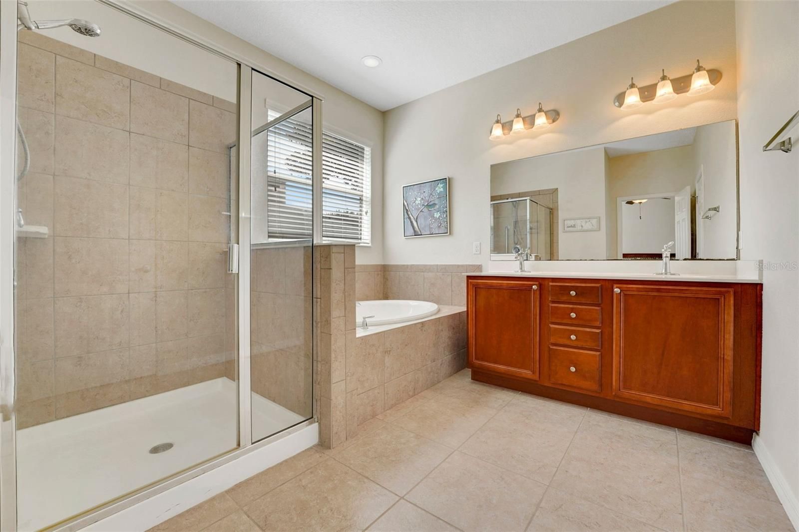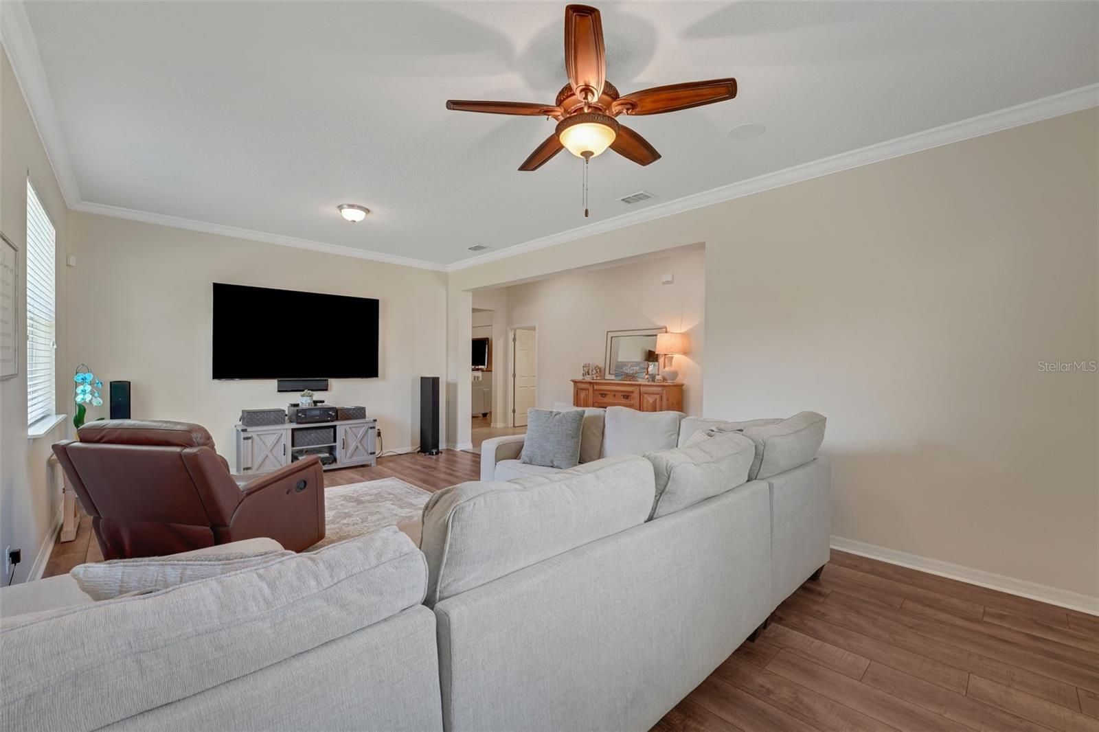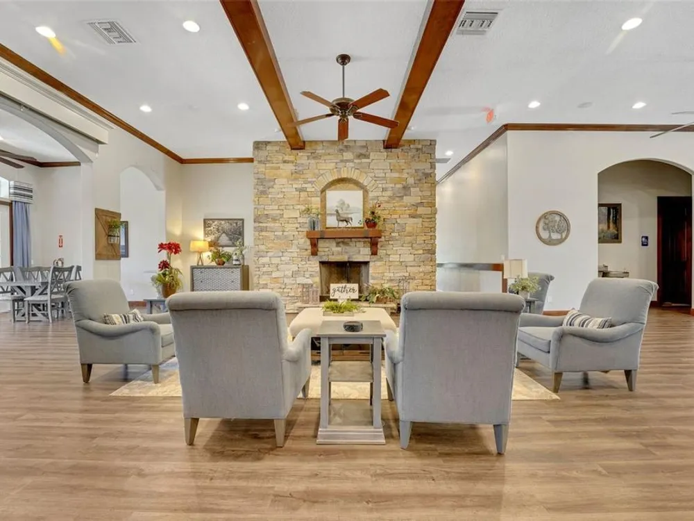- Ceiling Fan(s), Crown Molding, Eat-in Kitchen, High Ceilings, In-Wall Pest Control, Kitchen/Family Room Combo, Living/Dining Room, Open Floorplan, Main Level Primary, Solid-Wood Cabinets, Stone Counters, Tray Ceiling(s), Walk-In Closet(s), Window Treatments