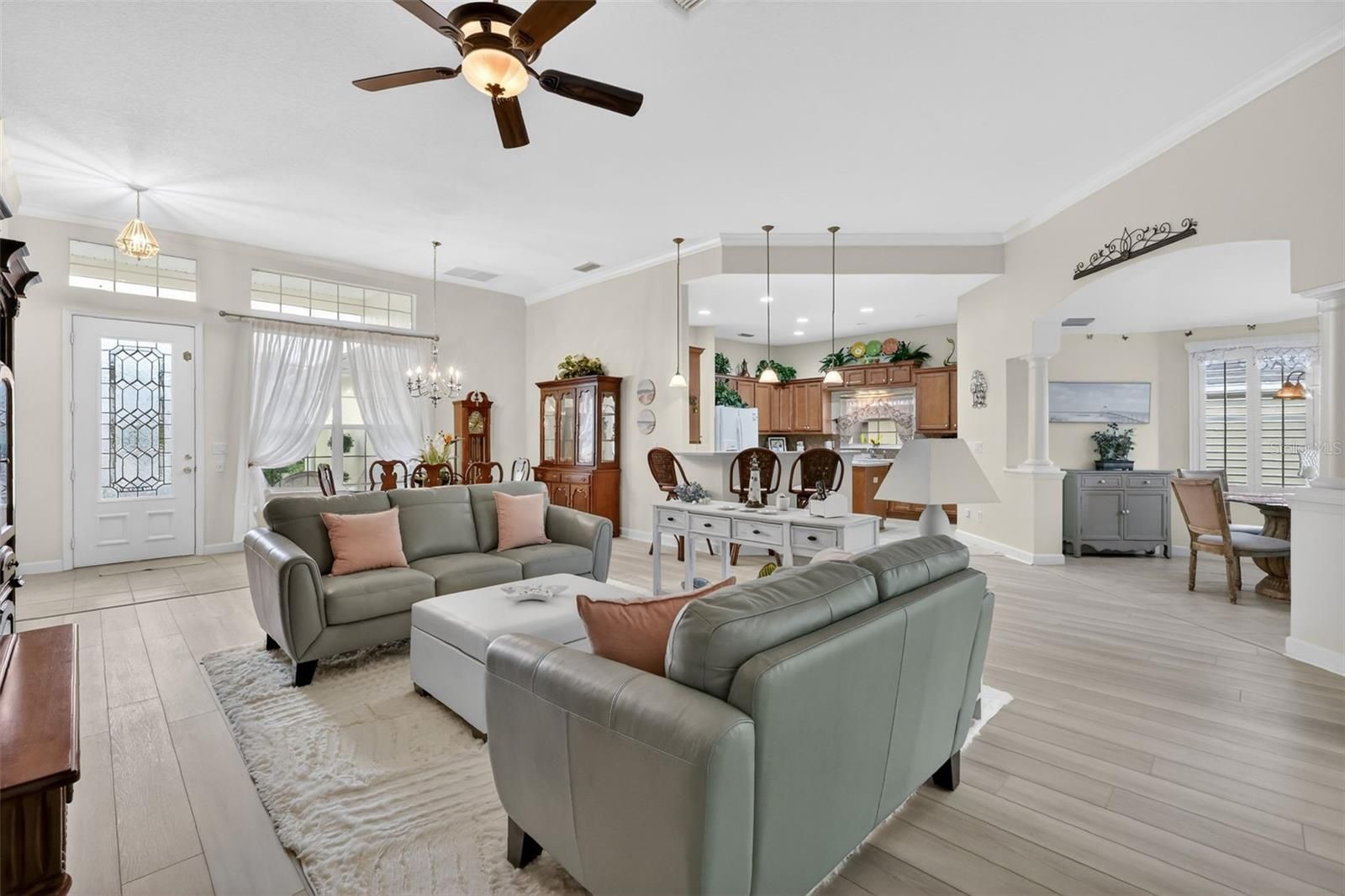 One of the original residents of Lakes of Mount Dora. This Pringle Home is impeccably maintained with many updates. New roof, new primary bedroom carpet, New luxury plank vinyl, fresh paint and landscapping. Home has a central vacuum cleaner. Nestled in the fist phase of the community provides easy access and convenience. Enclosed Florida room adds additional square footage and a bright, beautiful setting to entertain and enjoy the views. The lot is large and lushly landscaped. The kitchen has a walk-in pantry breakfast bar as well as a breakfast nook, center cooktop and opens to the huge great room. Ideal open floor plan for all your friends and family to gather. This 55+ sought after community offers Social Hall, Olympic size community pool, fitness center, pickle ball, tennis, croquet and Bocci Ball courts. Also there is a baseball field and walking paths. There are more places to enjoy such as the billard and card rooms and library. Mount Dora is just minutes away offering fine dining, arts, music, and shopping. Easy access to boating on the chain of lakes is a dream! Make your move today!