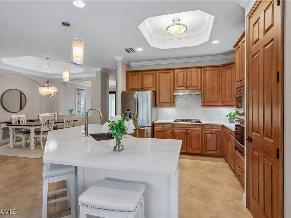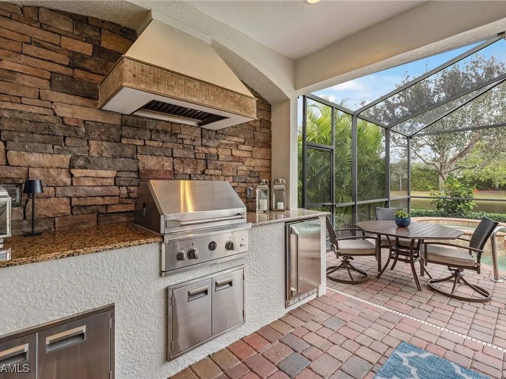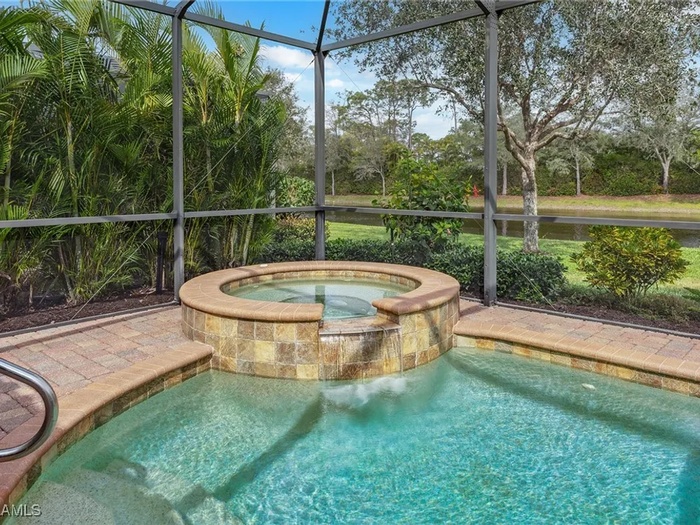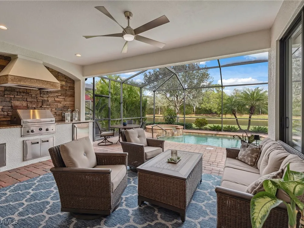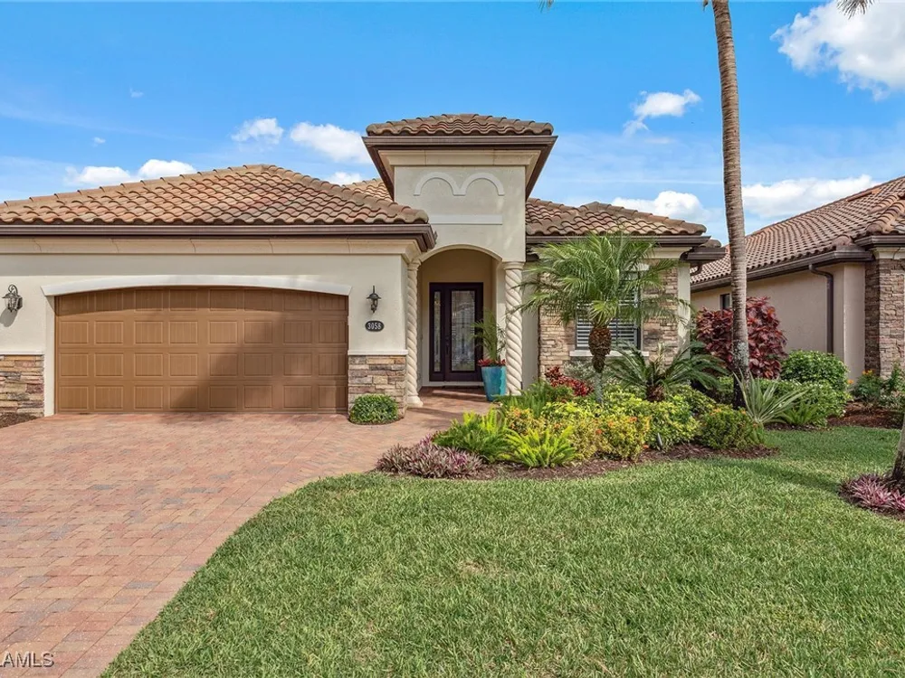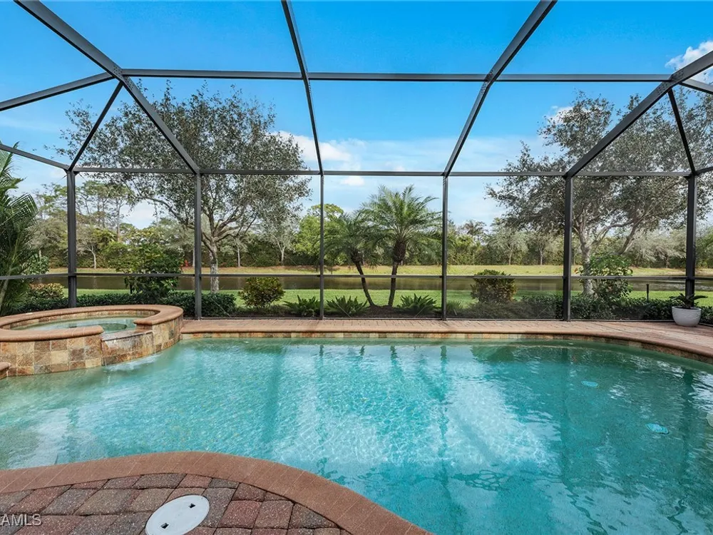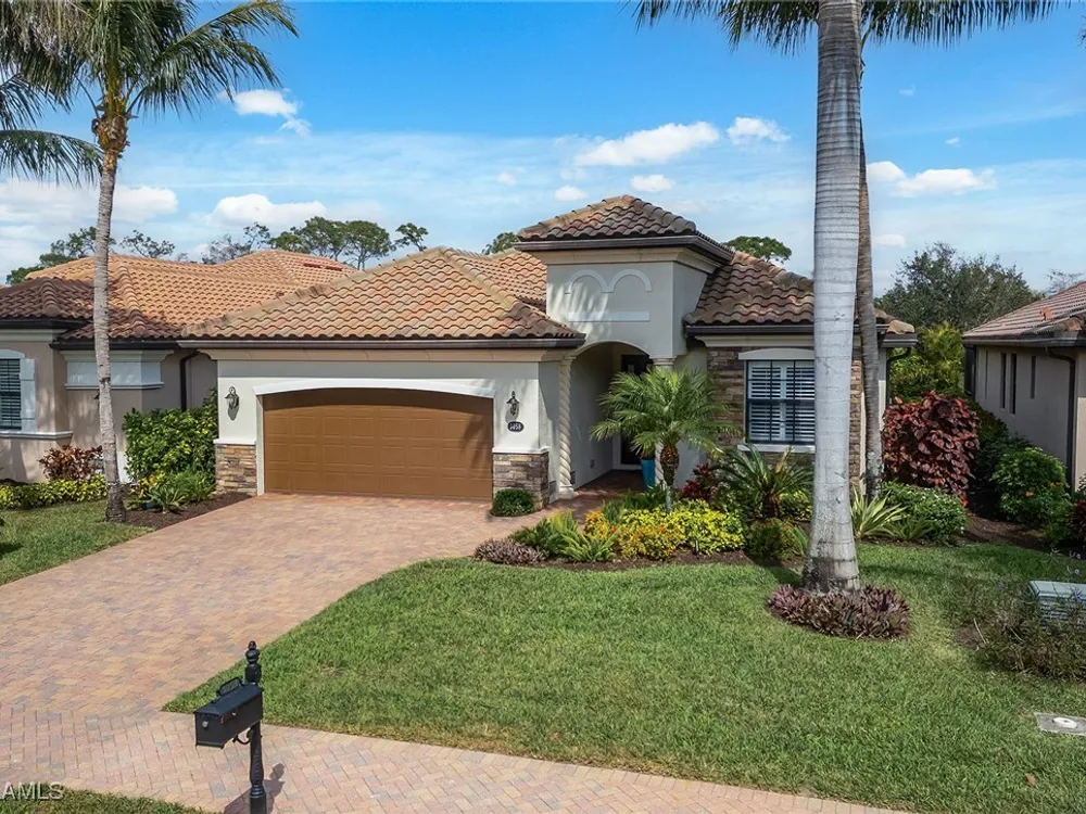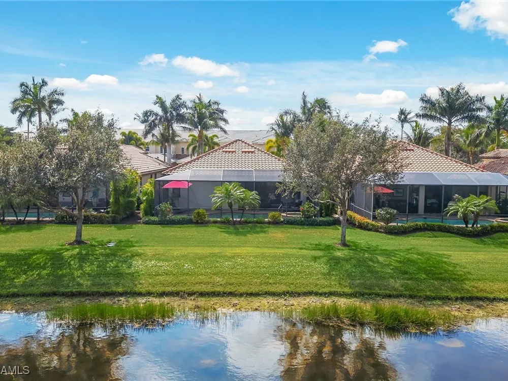 The buyer has the option to have the kitchen cabinets painted white, offering an opportunity to personalize the space to their taste. Dreaming of a stunning single-story Naples home with breathtaking lake views? Set within the prestigious resort-lifestyle gated community of Fiddler’s Creek, this exquisite three-bedroom, two-full-bath residence in the Millbrook neighborhood offers an unparalleled blend of sophistication and comfort. Beautiful exterior stonework, a paver driveway, and vibrant landscaping enhance the impressive curb appeal, while the tile roof adds timeless durability. Includes a new generator in 2023 and impact glass windows and sliders throughout. Pass through the artisanal glass door entry into an expansive foyer, where detailed crown moldings, tray ceilings, and designer lighting create a refined atmosphere that continues throughout the abode. Its split-floor layout seamlessly connects the generous living area to the dining alcove, illuminated by an elegant chandelier, ideal for intimate dinners or festive gatherings. The entertainer’s kitchen is a masterpiece, displaying gleaming quartz countertops, stainless steel appliances, a natural gas cooktop, wall oven and an updated sink. A generous kitchen island with seating and a walk-in pantry makes this space stylish and functional. The wood-floored bedrooms offer a tranquil retreat, with the primary suite featuring twin closets, direct patio access and a spa-like en suite complete with dual sinks, a frameless glass shower, a soaking tub and a private water closet. A set of double glass doors opens to a bonus room, ideal for a remote office, study, personal gym or overnight visitor accommodations. Venture outside to the enclosed saltwater heated pool and spa, where you can unwind while enjoying a serene lake backdrop. An outdoor kitchen makes entertaining effortless, ensuring every get-together is one to remember. Notable highlights include an attached two-car garage, plantation shutters and a laundry room with new washer and new dryer along with a sink and cabinets for convenience. Fiddler’s Creek offers an exclusive resort lifestyle, featuring a top-of-the-line fitness center with trainers, fitness classes, active tennis and pickleball programs, and scenic sidewalks for walking, running and biking. Optional golf, beach and marina memberships let you add more perks, including use of its new golf clubhouse and renovated championship course. Relax at the pristine pool with its slides, waterfalls, hot tub, sauna and steam room, or savor gourmet meals at the elegant restaurant or poolside bar and grill. A robust activity and event calendar ensures there’s exciting interactions to enjoy. Conveniently a short distance from Marco Island and Old Naples, you’ll have easy access to unsullied beaches, marinas, yacht clubs, upscale boutiques, cafes, parks, executive airport and outdoor adventures such as kayaking and paddleboarding. A must-see for those seeking luxury and comfort!