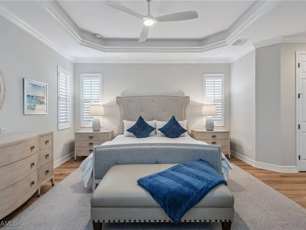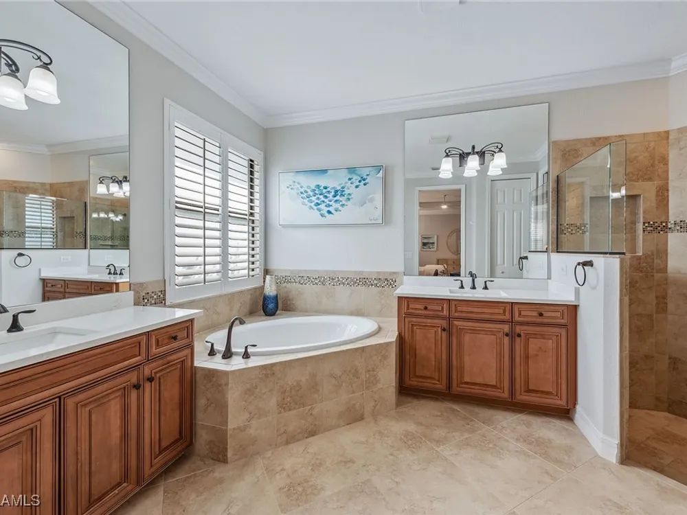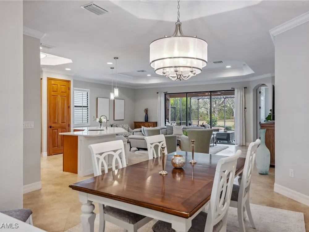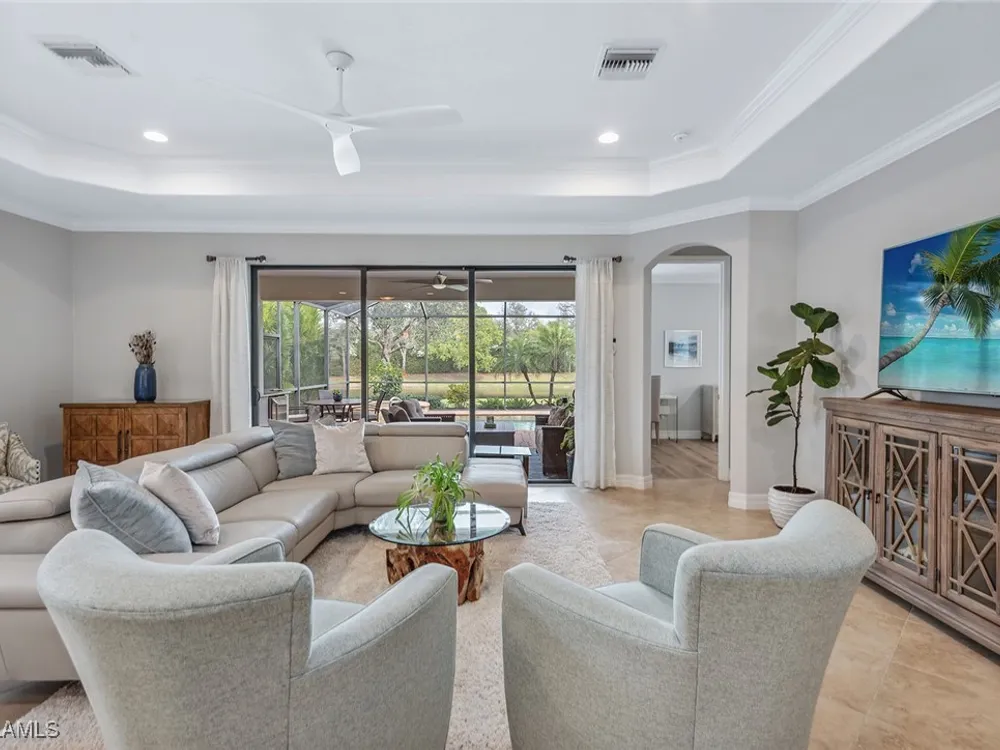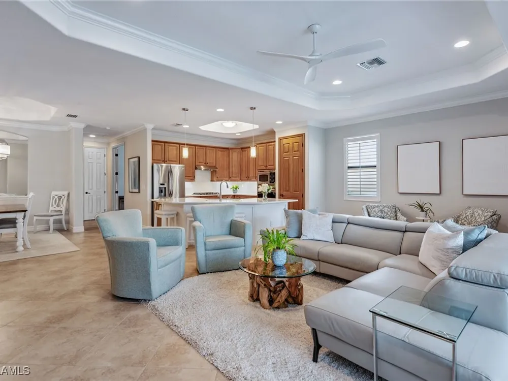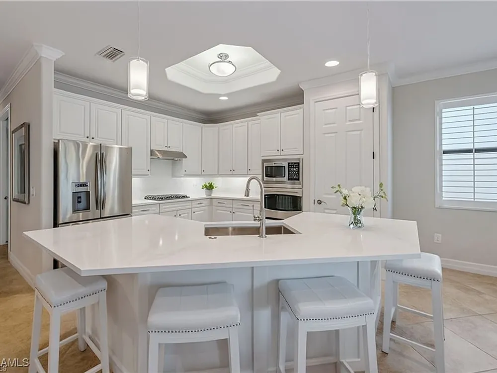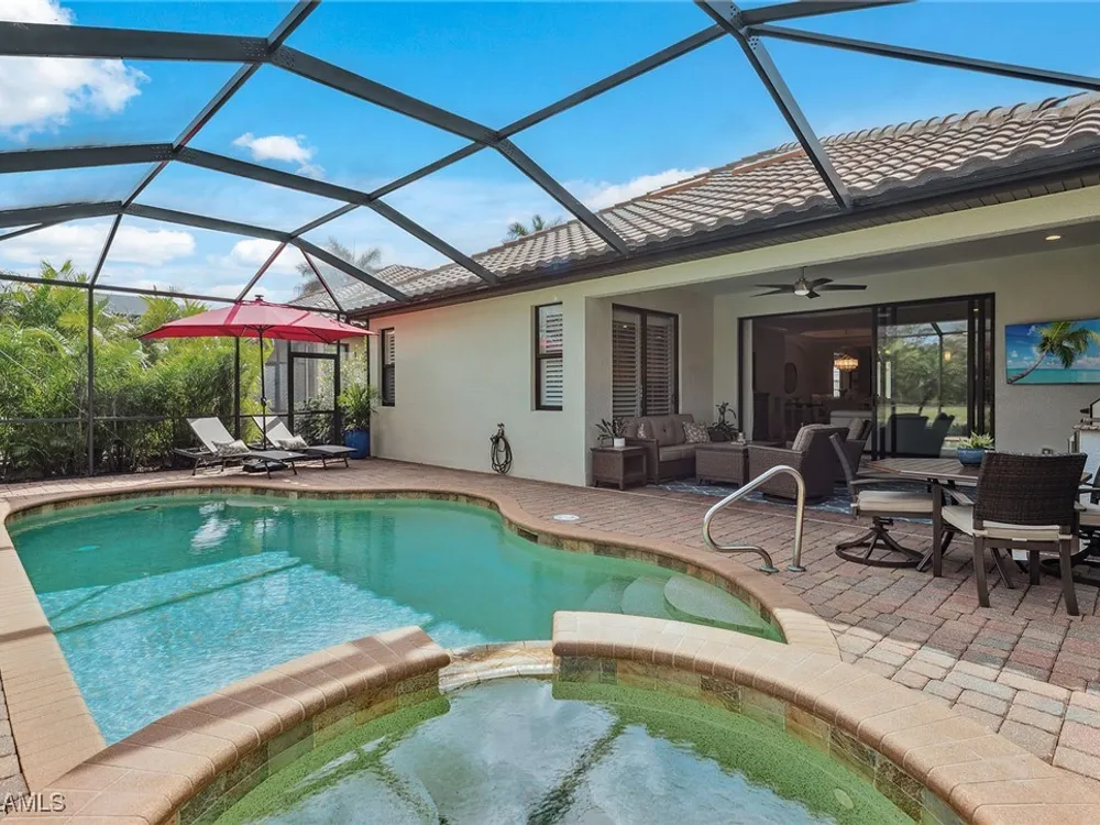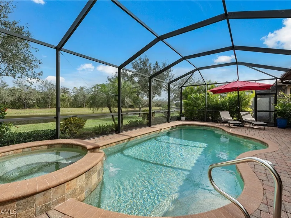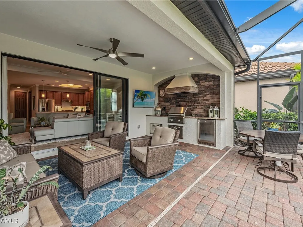 The buyer has the option to have the kitchen cabinets painted white, offering an opportunity to personalize the space to their taste. Dreaming of a stunning single-story Naples home with breathtaking lake views? Set within the prestigious resort-lifestyle gated community of Fiddler’s Creek, this exquisite three-bedroom, two-full-bath residence in the Millbrook neighborhood offers an unparalleled blend of sophistication and comfort. Beautiful exterior stonework, a paver driveway, and vibrant landscaping enhance the impressive curb appeal, while the tile roof adds timeless durability. Includes a new generator in 2023 and impact glass windows and sliders throughout. Pass through the artisanal glass door entry into an expansive foyer, where detailed crown moldings, tray ceilings, and designer lighting create a refined atmosphere that continues throughout the abode. Its split-floor layout seamlessly connects the generous living area to the dining alcove, illuminated by an elegant chandelier, ideal for intimate dinners or festive gatherings. The entertainer’s kitchen is a masterpiece, displaying gleaming quartz countertops, stainless steel appliances, a natural gas cooktop, wall oven and an updated sink. A generous kitchen island with seating and a walk-in pantry makes this space stylish and functional. The wood-floored bedrooms offer a tranquil retreat, with the primary suite featuring twin closets, direct patio access and a spa-like en suite complete with dual sinks, a frameless glass shower, a soaking tub and a private water closet. A set of double glass doors opens to a bonus room, ideal for a remote office, study, personal gym or overnight visitor accommodations. Venture outside to the enclosed saltwater heated pool and spa, where you can unwind while enjoying a serene lake backdrop. An outdoor kitchen makes entertaining effortless, ensuring every get-together is one to remember. Notable highlights include an attached two-car garage, plantation shutters and a laundry room with new washer and new dryer along with a sink and cabinets for convenience. Fiddler’s Creek offers an exclusive resort lifestyle, featuring a top-of-the-line fitness center with trainers, fitness classes, active tennis and pickleball programs, and scenic sidewalks for walking, running and biking. Optional golf, beach and marina memberships let you add more perks, including use of its new golf clubhouse and renovated championship course. Relax at the pristine pool with its slides, waterfalls, hot tub, sauna and steam room, or savor gourmet meals at the elegant restaurant or poolside bar and grill. A robust activity and event calendar ensures there’s exciting interactions to enjoy. Conveniently a short distance from Marco Island and Old Naples, you’ll have easy access to unsullied beaches, marinas, yacht clubs, upscale boutiques, cafes, parks, executive airport and outdoor adventures such as kayaking and paddleboarding. A must-see for those seeking luxury and comfort!