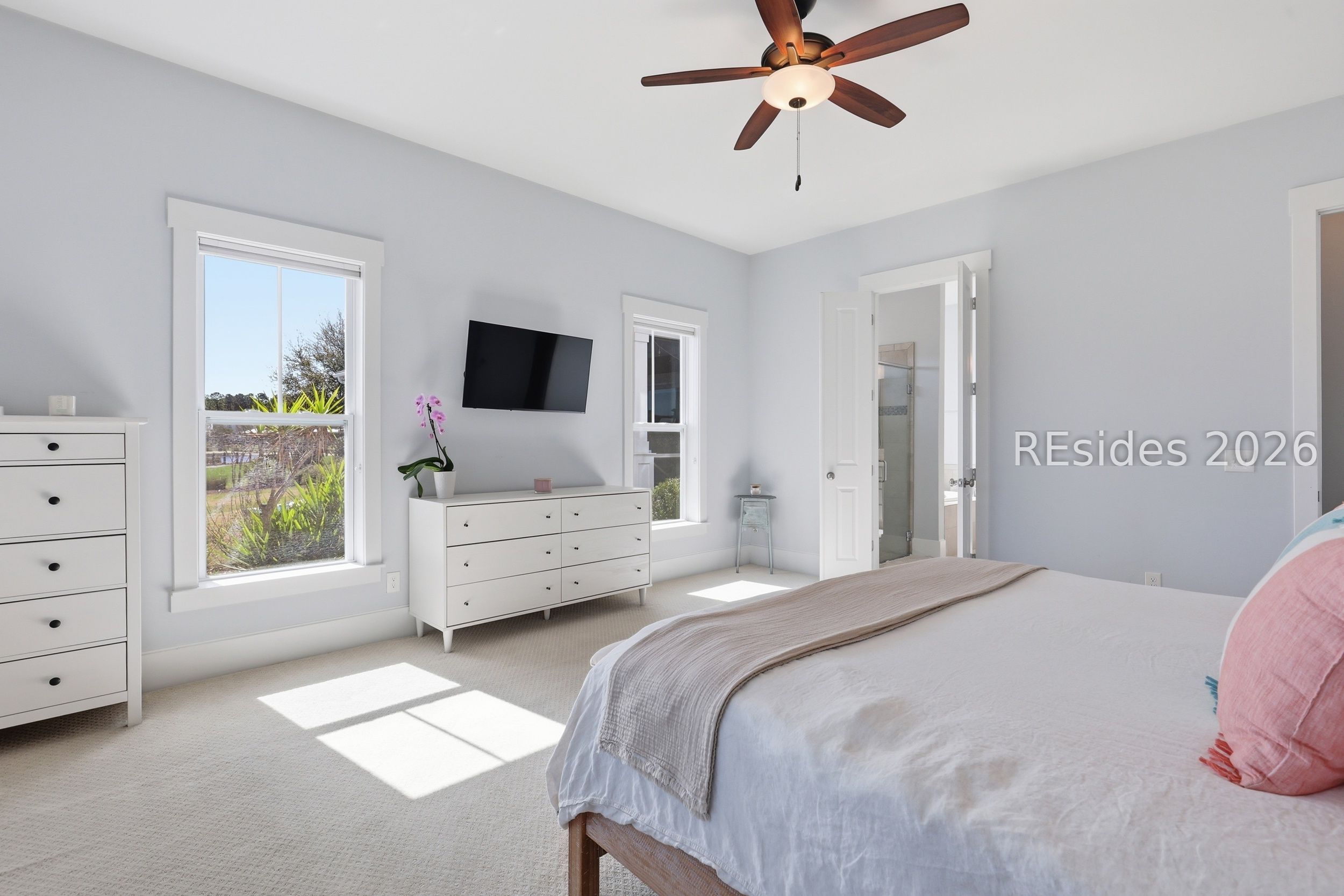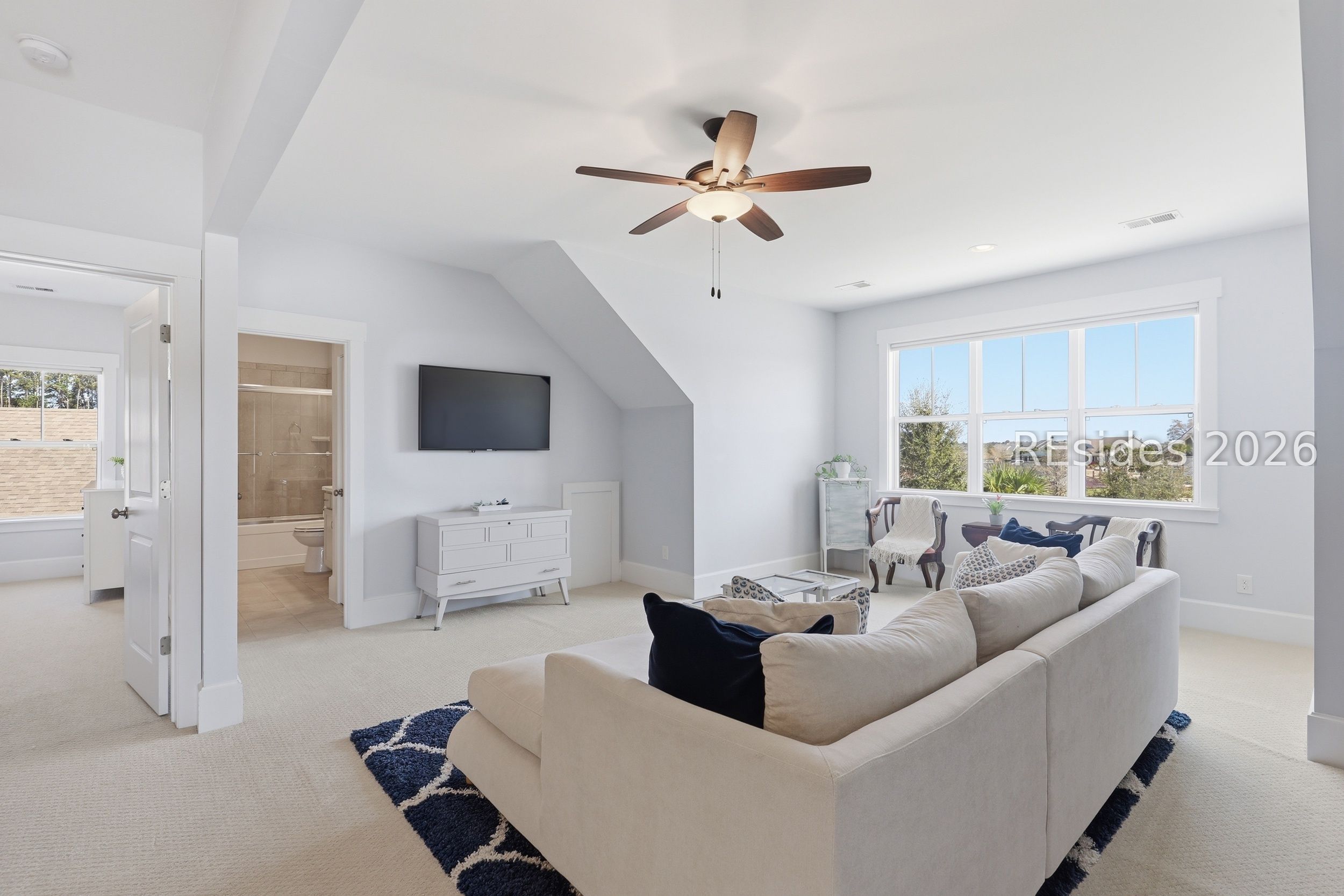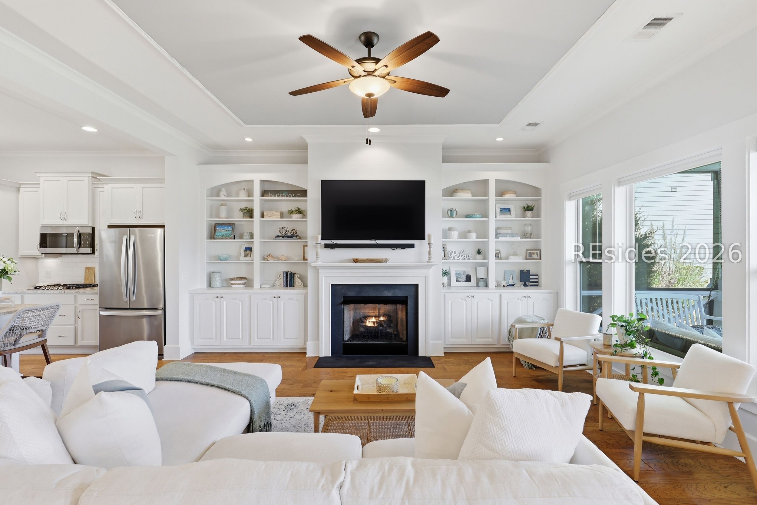 - Bookcases, Built-in Features, Ceiling Fan(s), Carbon Monoxide Detector, Fireplace, Main Level Primary, Multiple Primary Bathrooms, Pull Down Attic Stairs, Smooth Ceilings, Separate Shower, Cable TV, Wired for Data, Window Treatments, Entrance Foyer, Loft, New Paint, Pantry