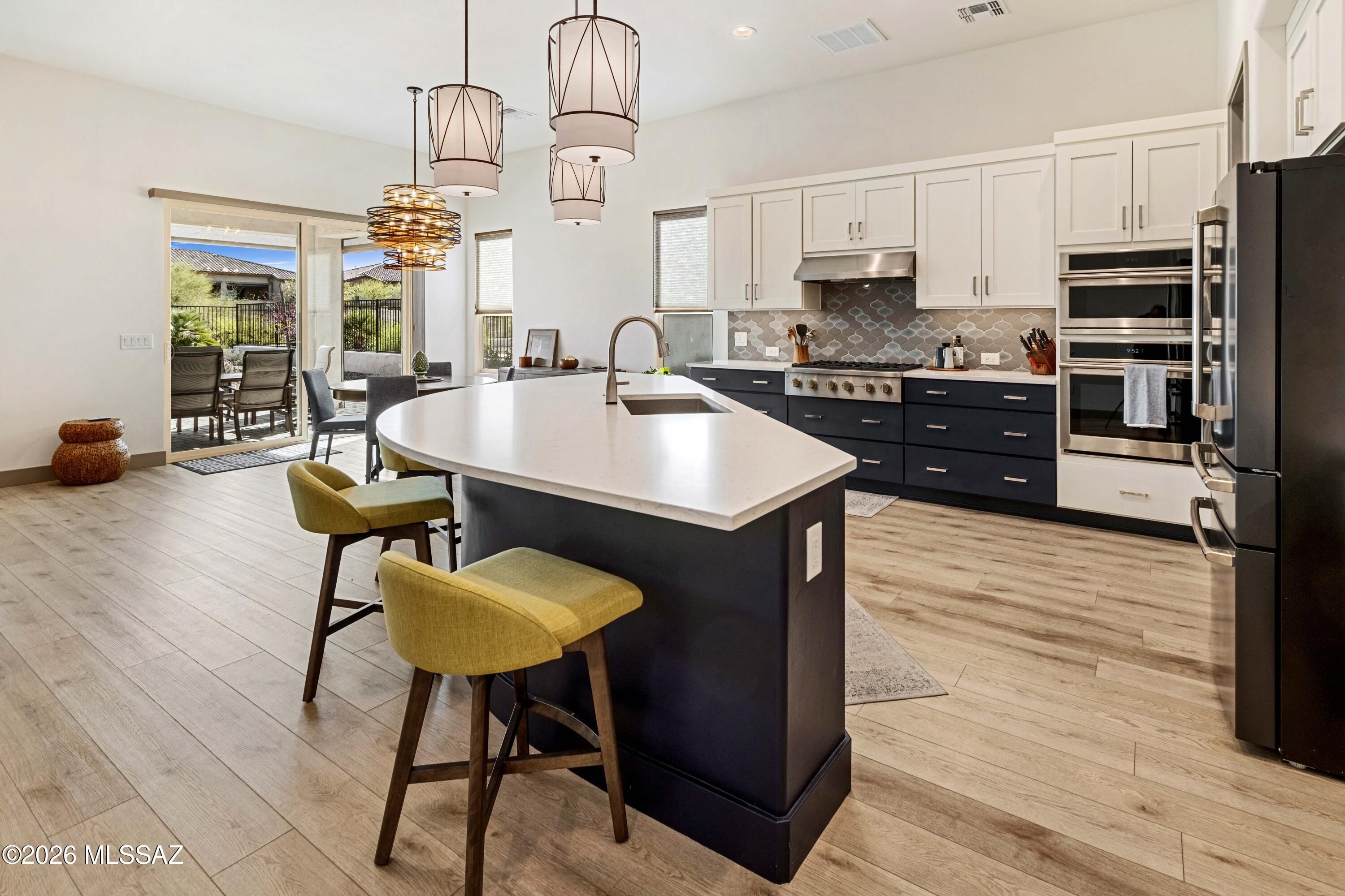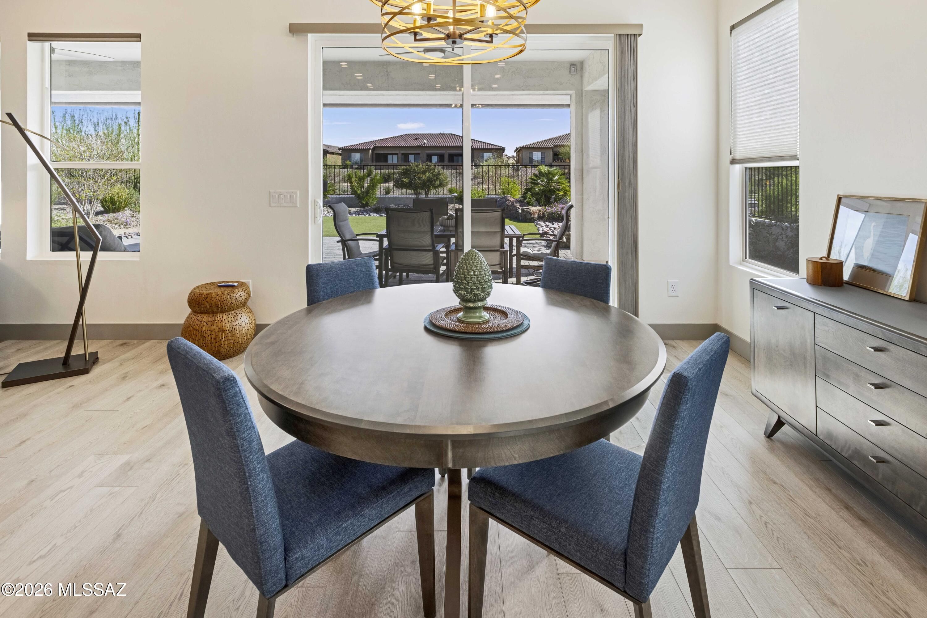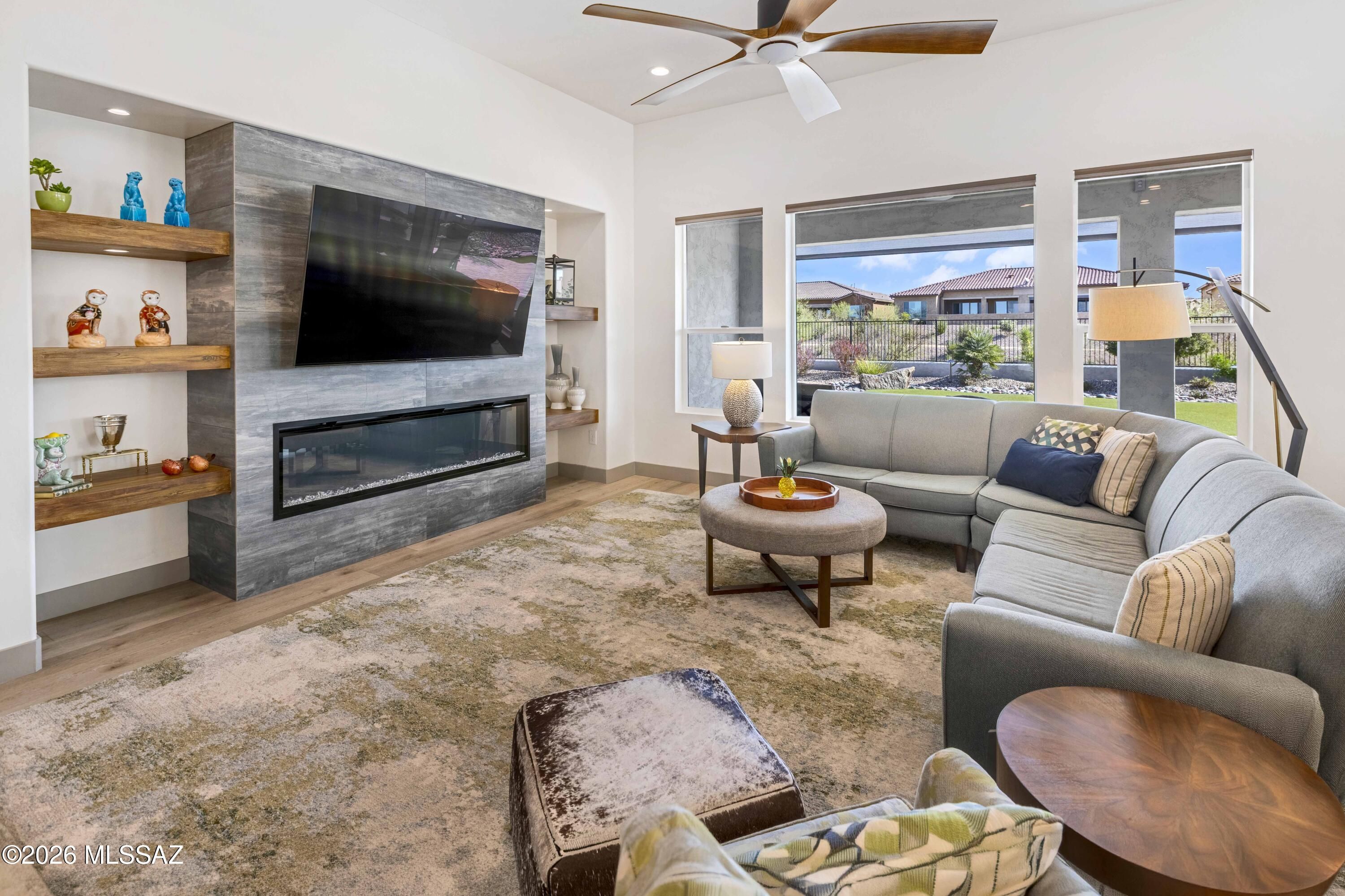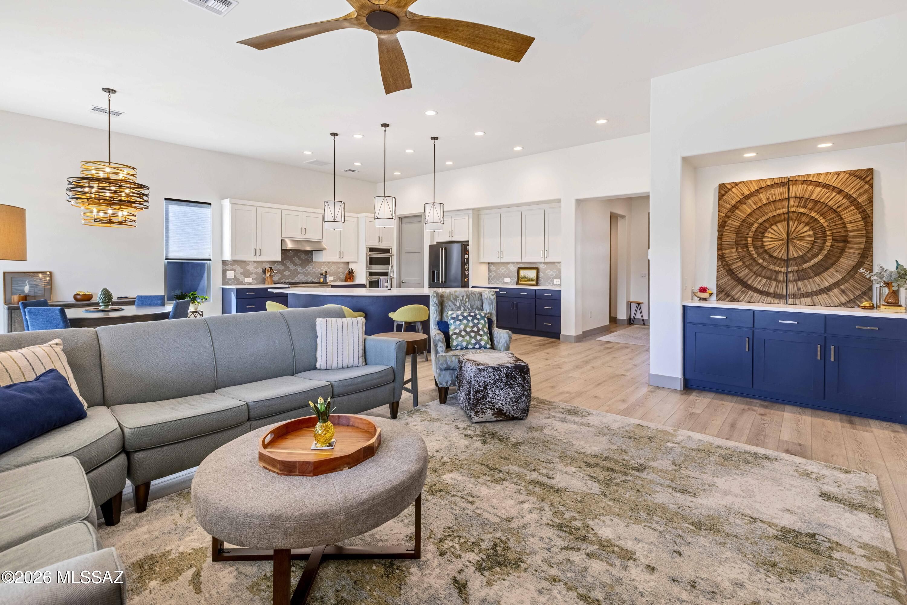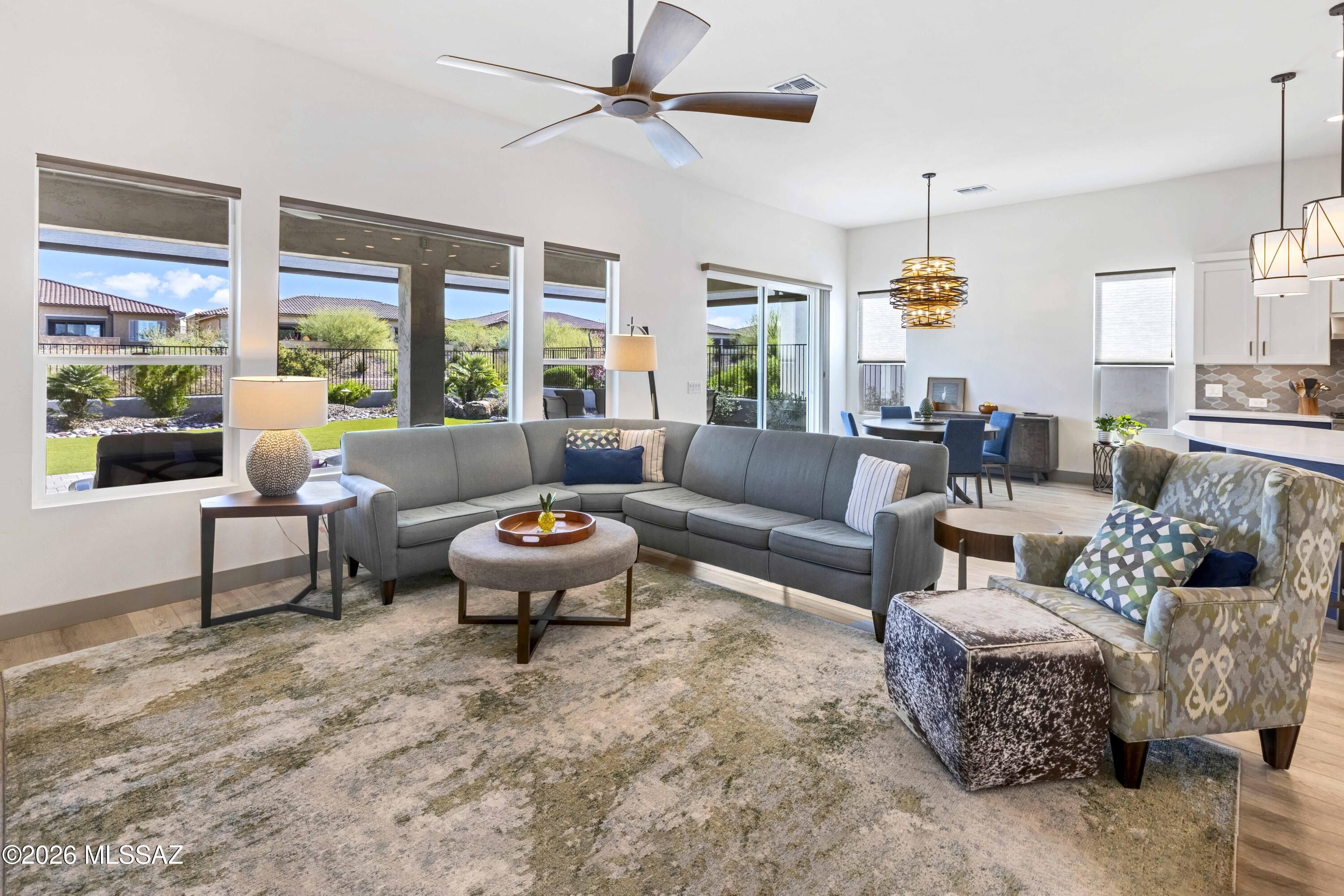 Beautifully upgraded Vienta floor plan offering approximately 2,300 square feet in the highly sought-after SaddleBrooke Ranch active adult community. This thoughtfully designed residence features two bedrooms, a den, two and one-half baths, and an extended full three-car garage, providing a spacious and functional layout ideal for both everyday living and entertaining.The open-concept great room design showcases luxury vinyl plank flooring throughout the main living areas, complemented by contemporary two-tone interior paint and upgraded baseboards that create a clean, modern aesthetic. The kitchen serves as the heart of the home and features Cambria Swanbridge quartz countertops, a full-height tile backsplash, Blanco granite composite sink, upgraded cabinetry with crown molding,