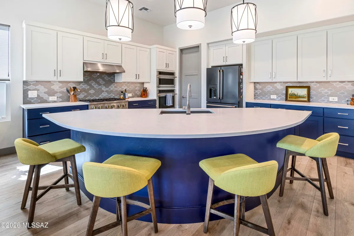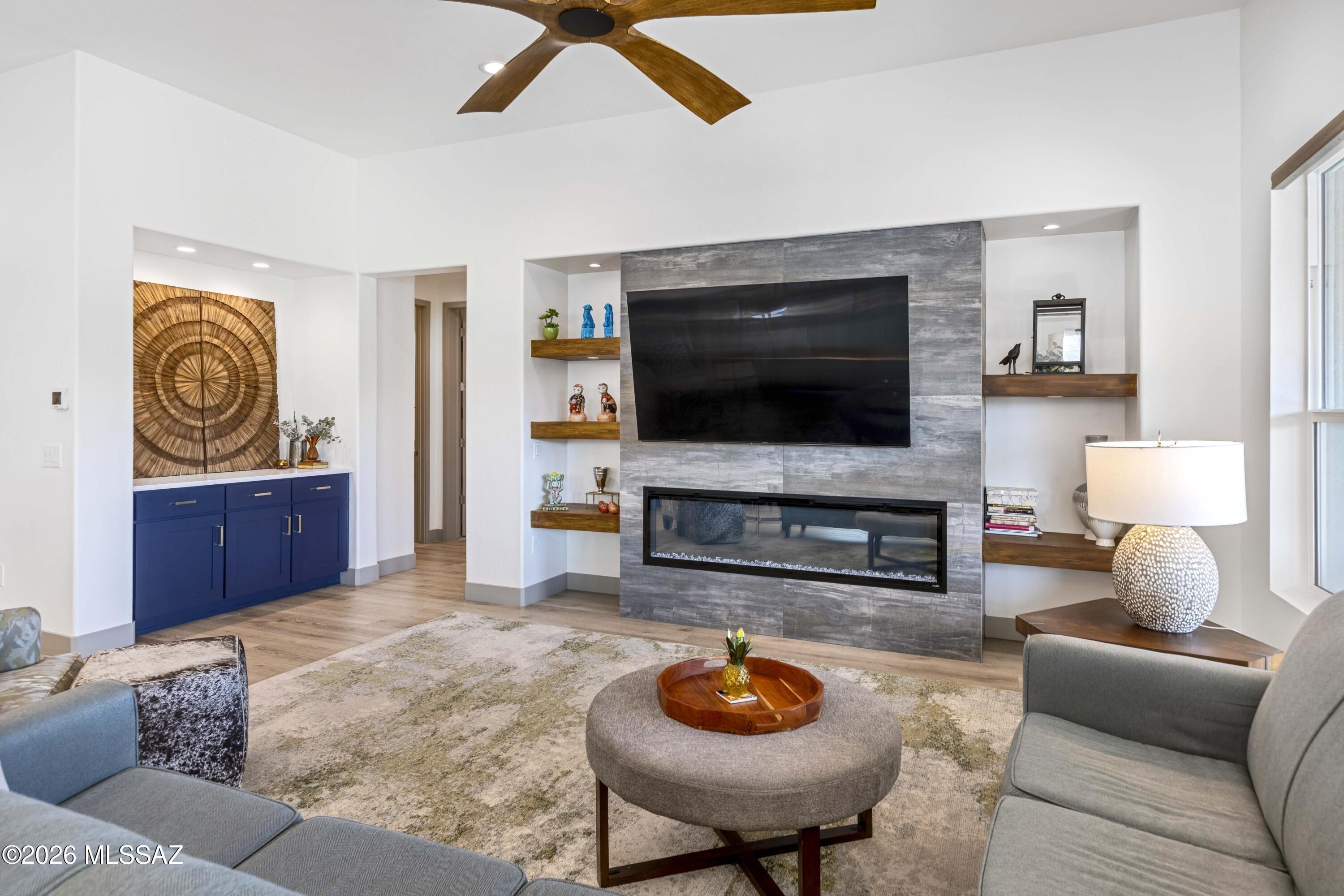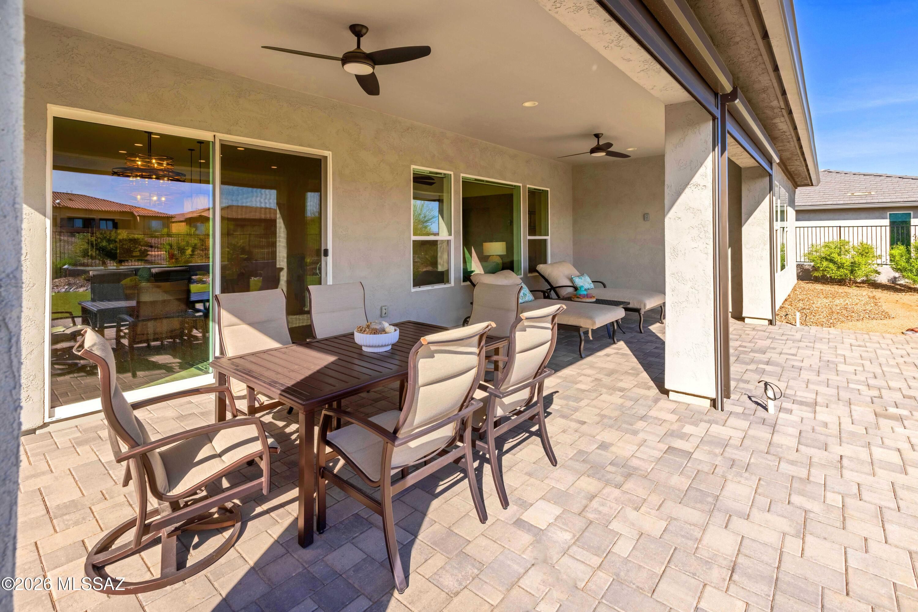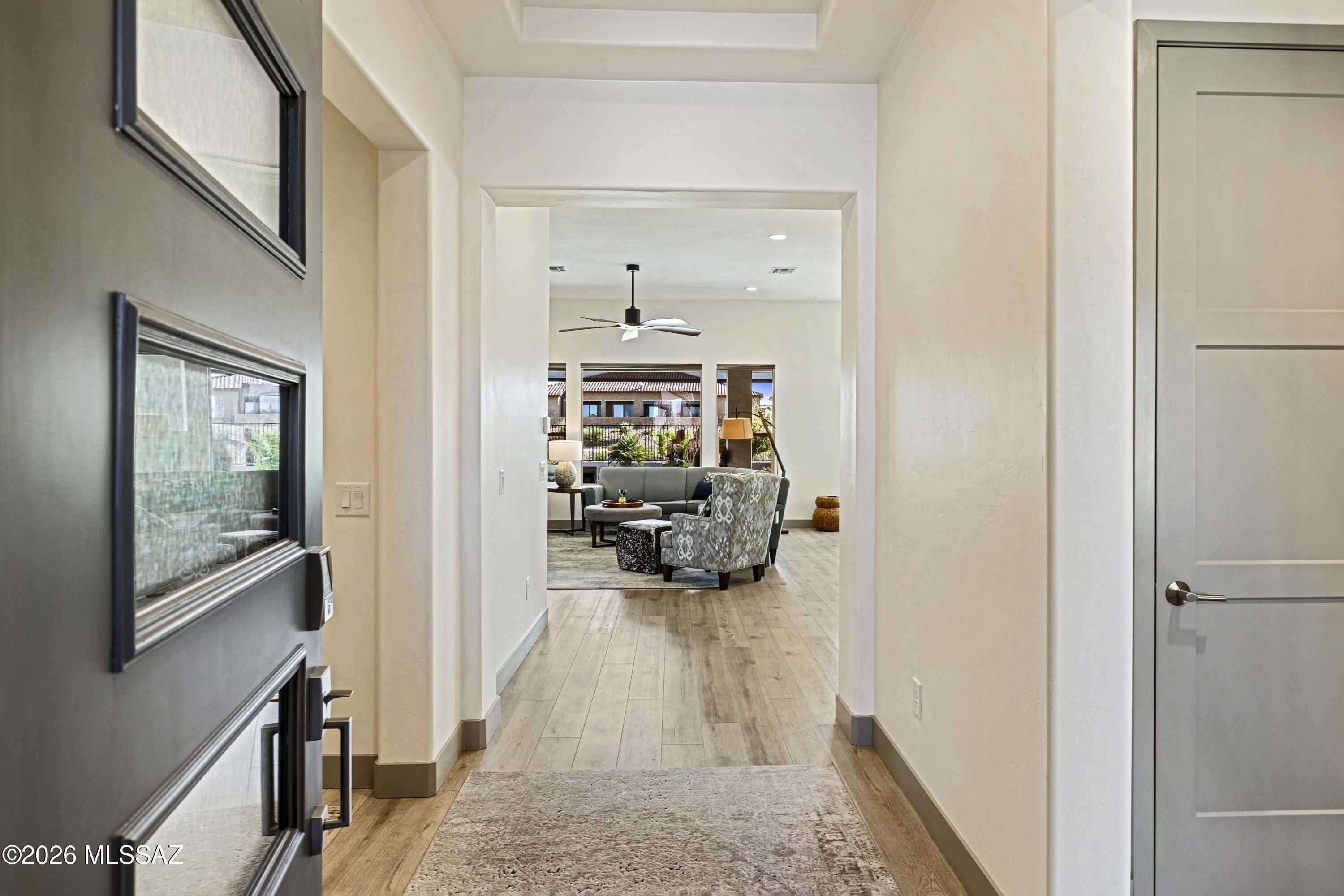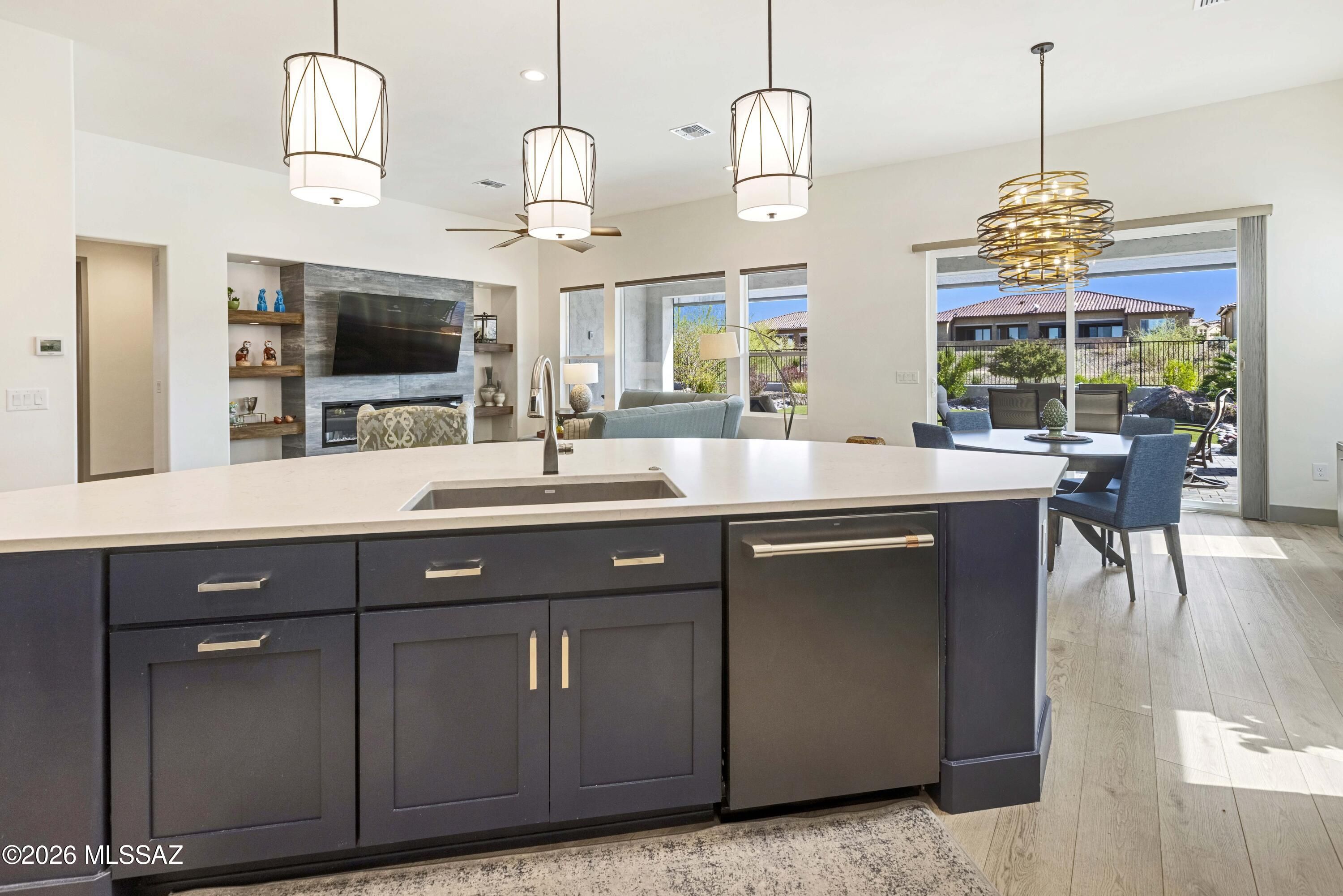 Beautifully upgraded Vienta floor plan offering approximately 2,300 square feet in the highly sought-after SaddleBrooke Ranch active adult community. This thoughtfully designed residence features two bedrooms, a den, two and one-half baths, and an extended full three-car garage, providing a spacious and functional layout ideal for both everyday living and entertaining.The open-concept great room design showcases luxury vinyl plank flooring throughout the main living areas, complemented by contemporary two-tone interior paint and upgraded baseboards that create a clean, modern aesthetic. The kitchen serves as the heart of the home and features Cambria Swanbridge quartz countertops, a full-height tile backsplash, Blanco granite composite sink, upgraded cabinetry with crown molding,