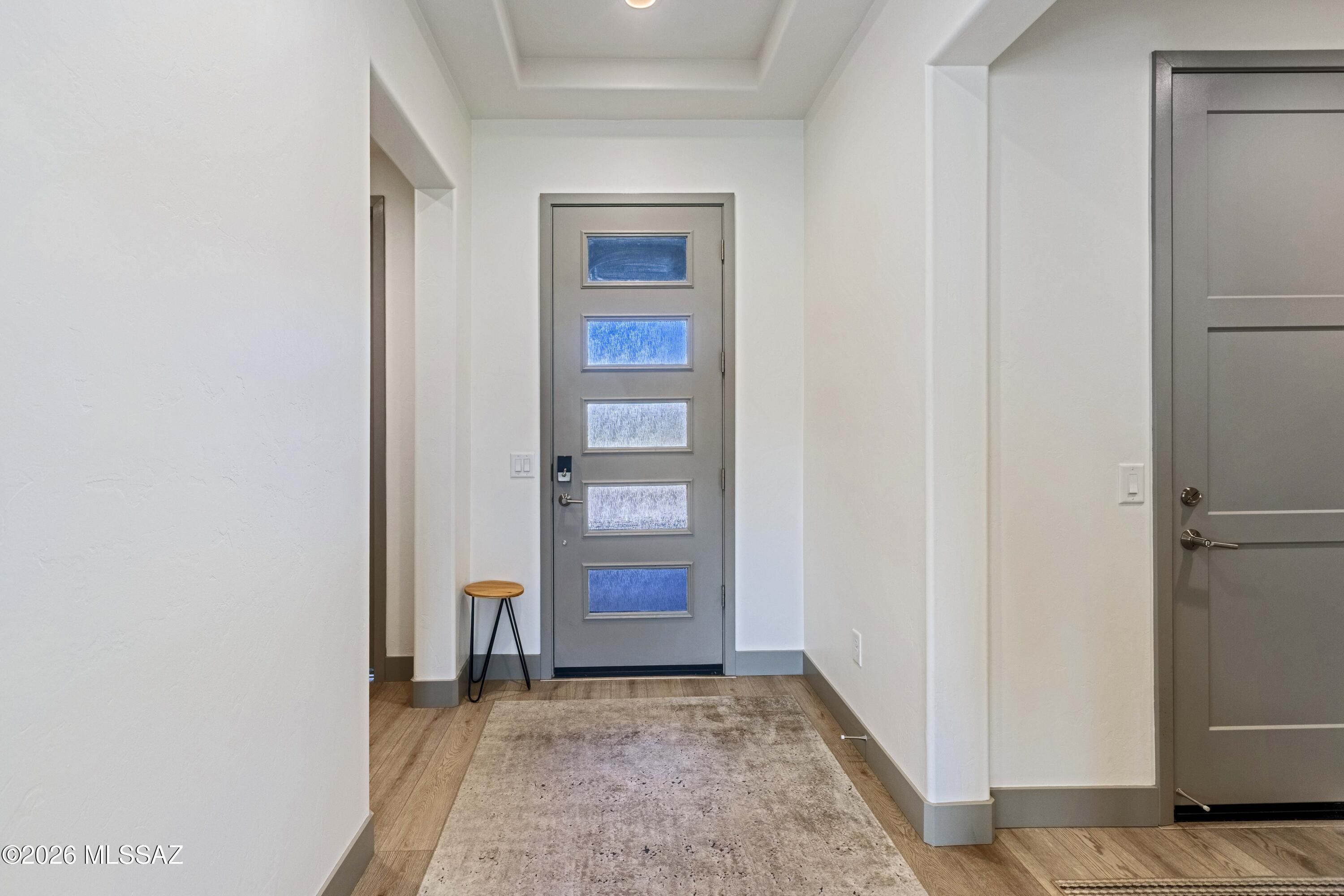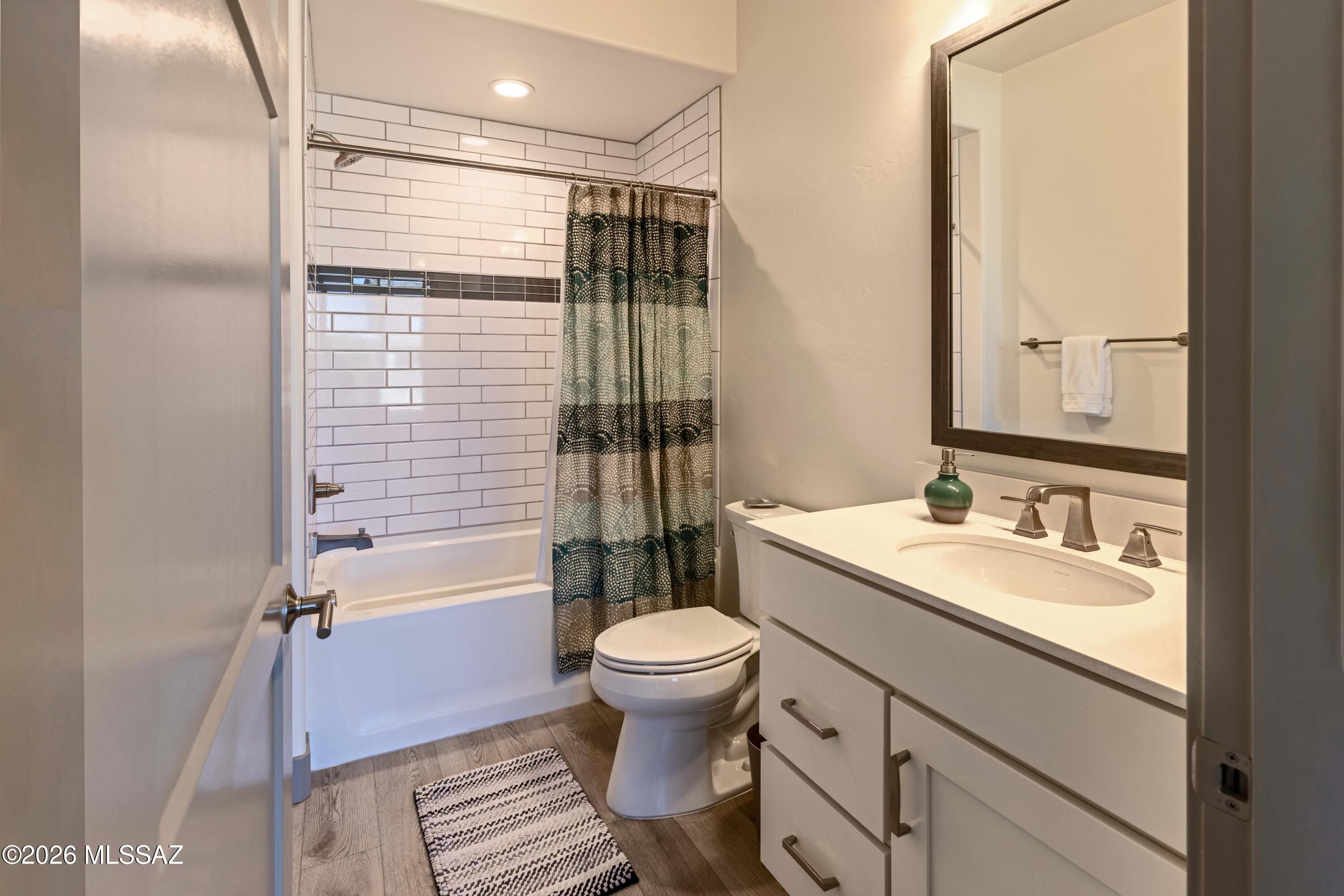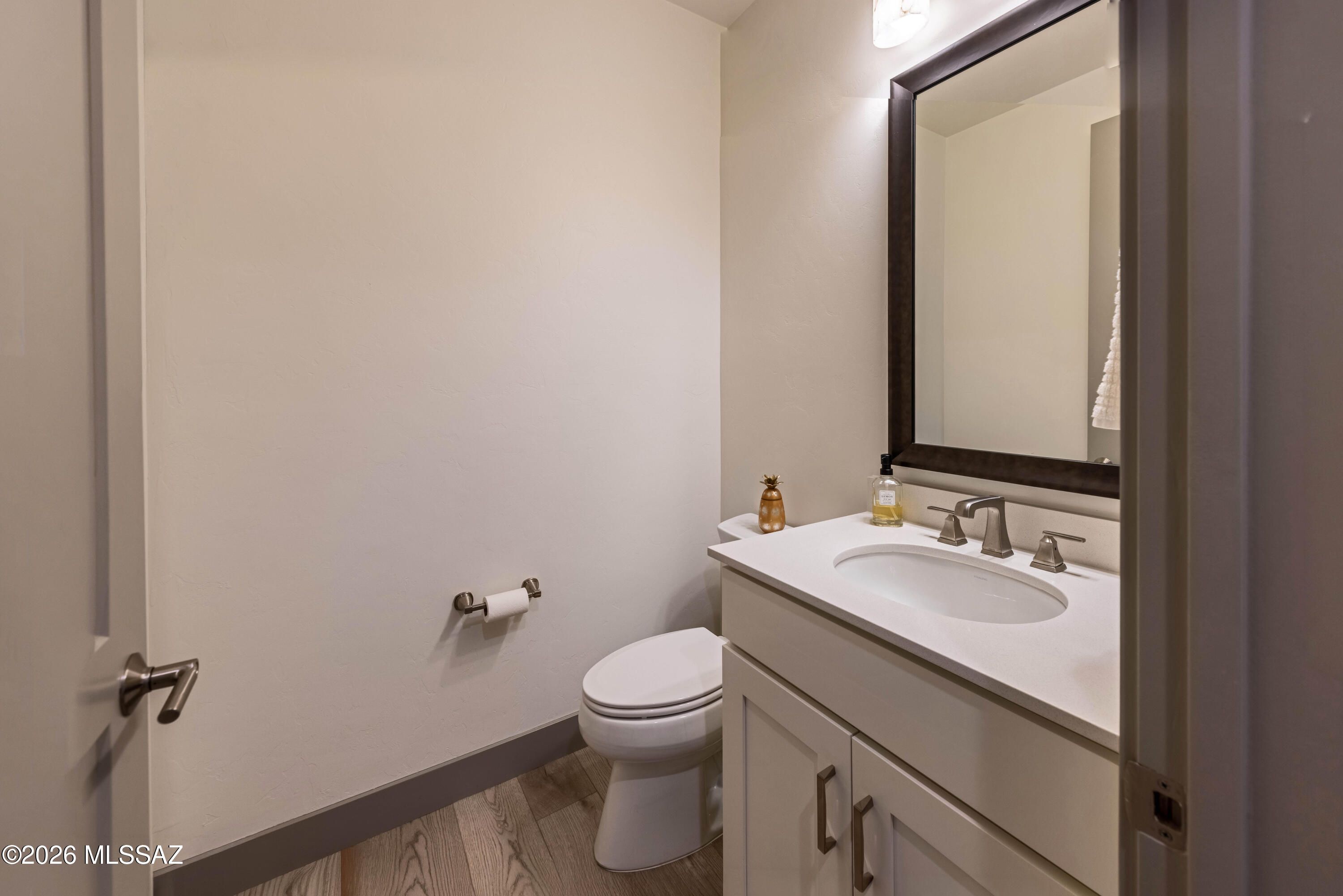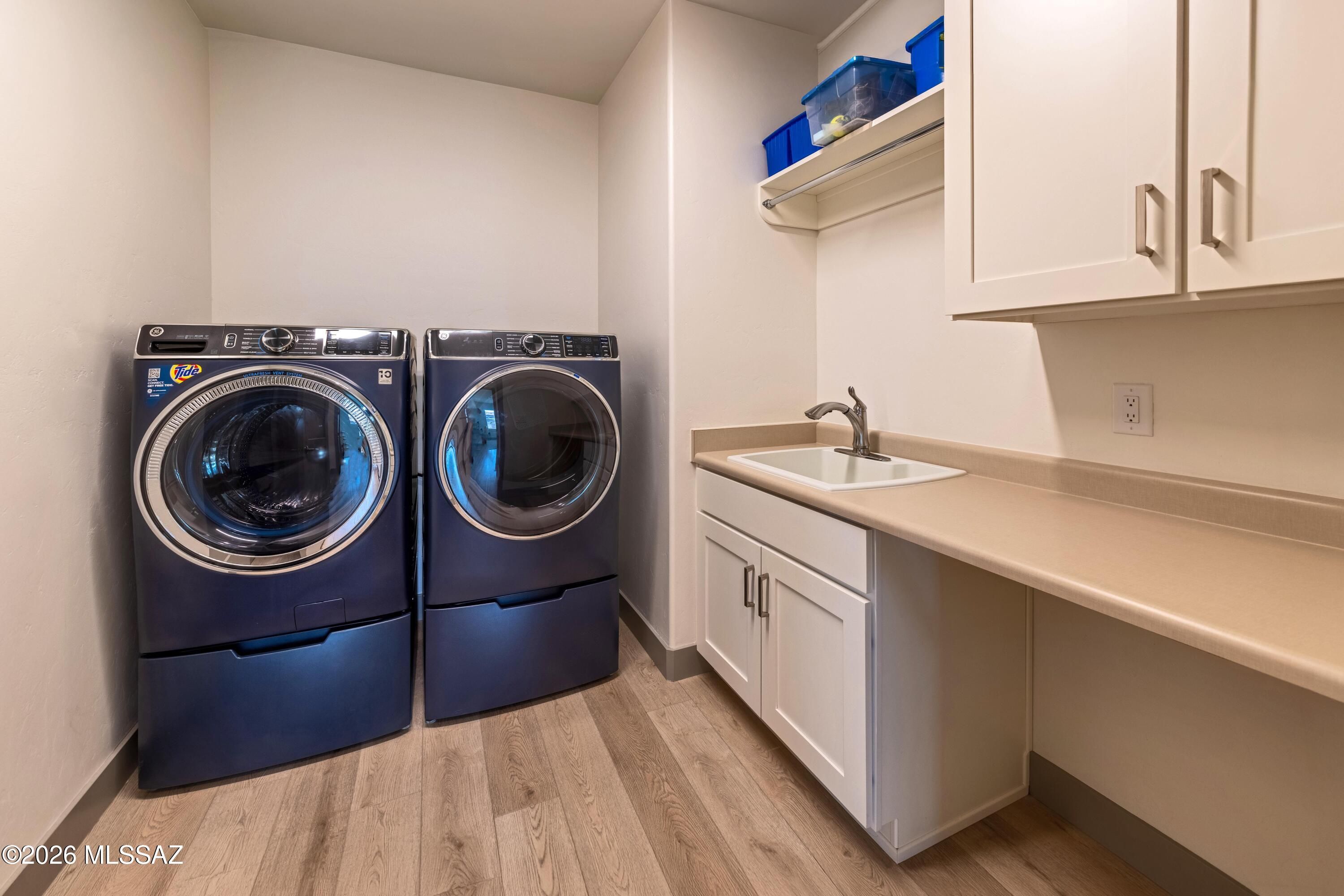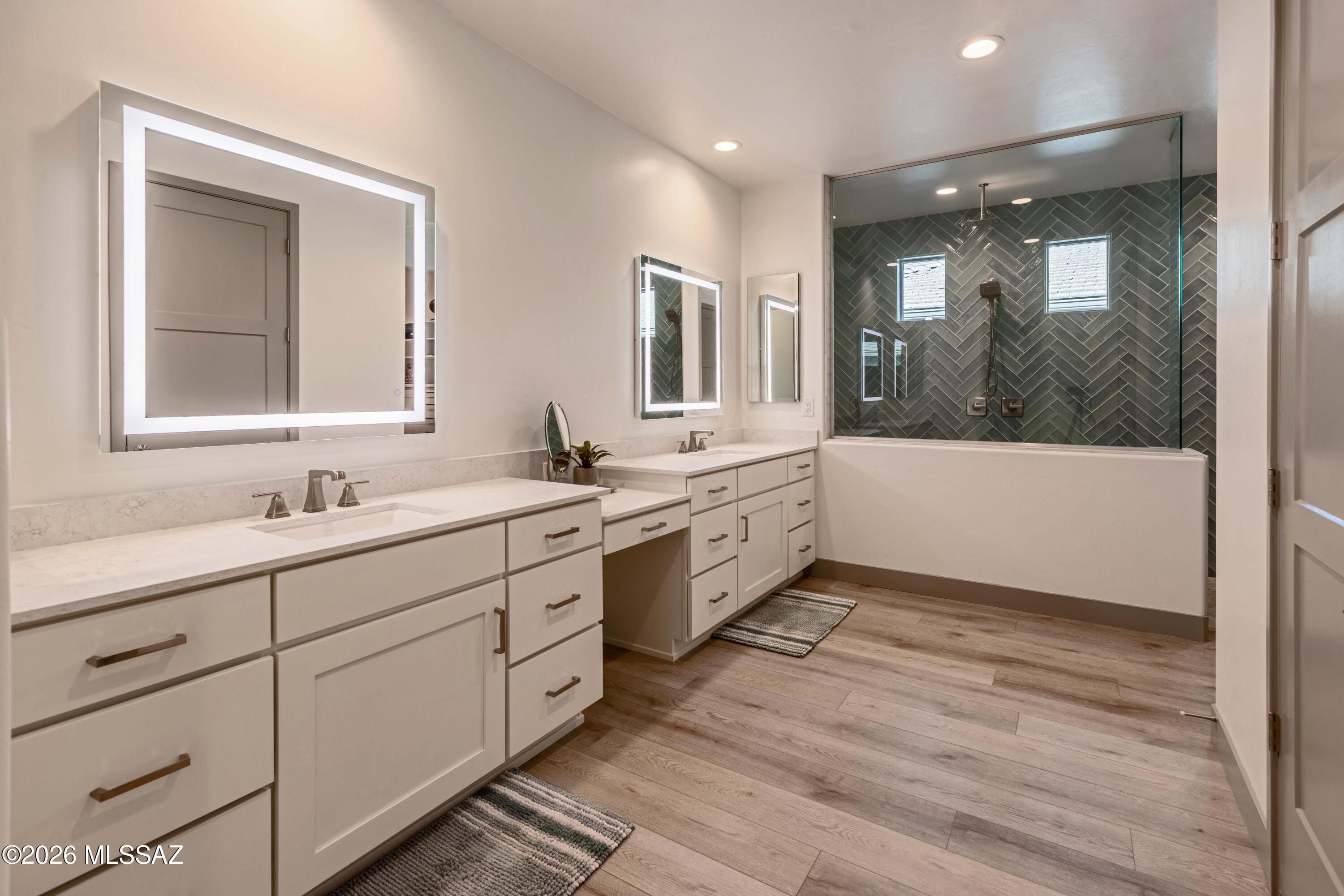 Beautifully upgraded Vienta floor plan offering approximately 2,300 square feet in the highly sought-after SaddleBrooke Ranch active adult community. This thoughtfully designed residence features two bedrooms, a den, two and one-half baths, and an extended full three-car garage, providing a spacious and functional layout ideal for both everyday living and entertaining.The open-concept great room design showcases luxury vinyl plank flooring throughout the main living areas, complemented by contemporary two-tone interior paint and upgraded baseboards that create a clean, modern aesthetic. The kitchen serves as the heart of the home and features Cambria Swanbridge quartz countertops, a full-height tile backsplash, Blanco granite composite sink, upgraded cabinetry with crown molding,