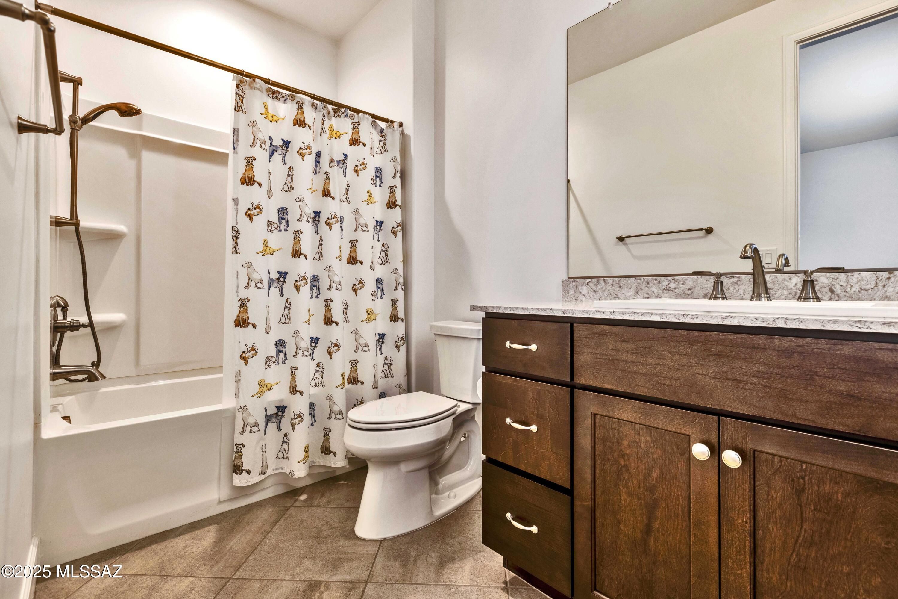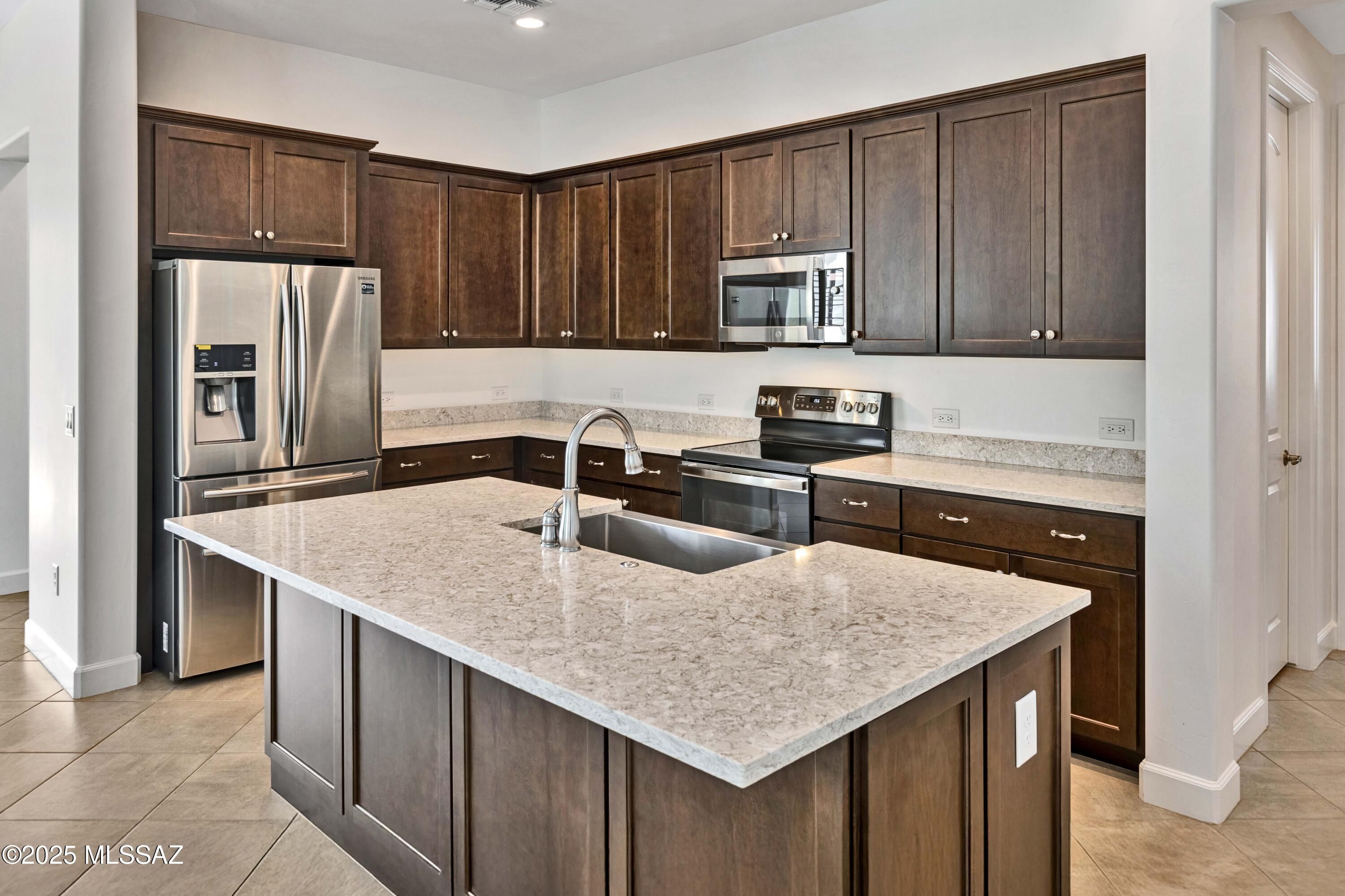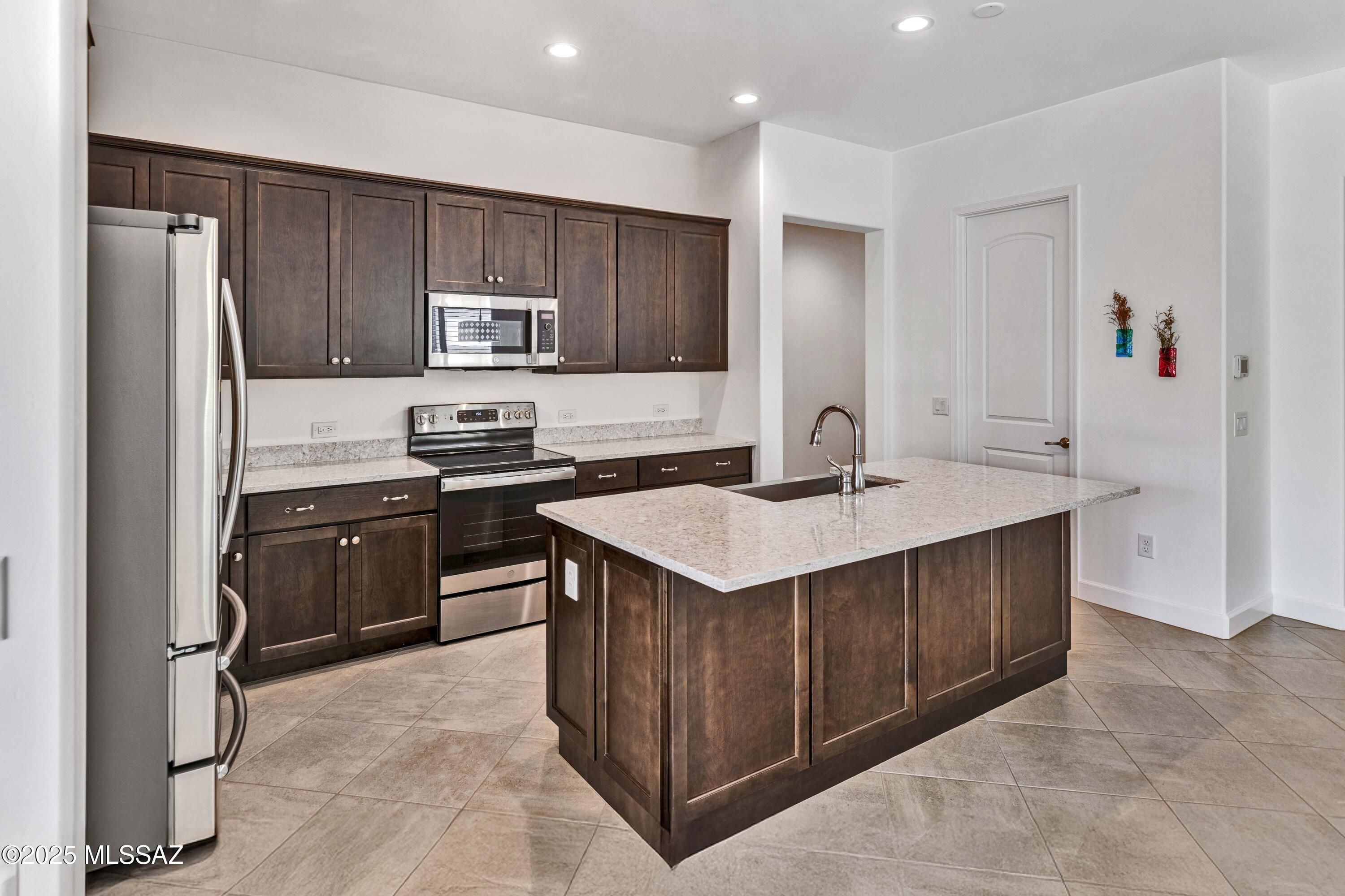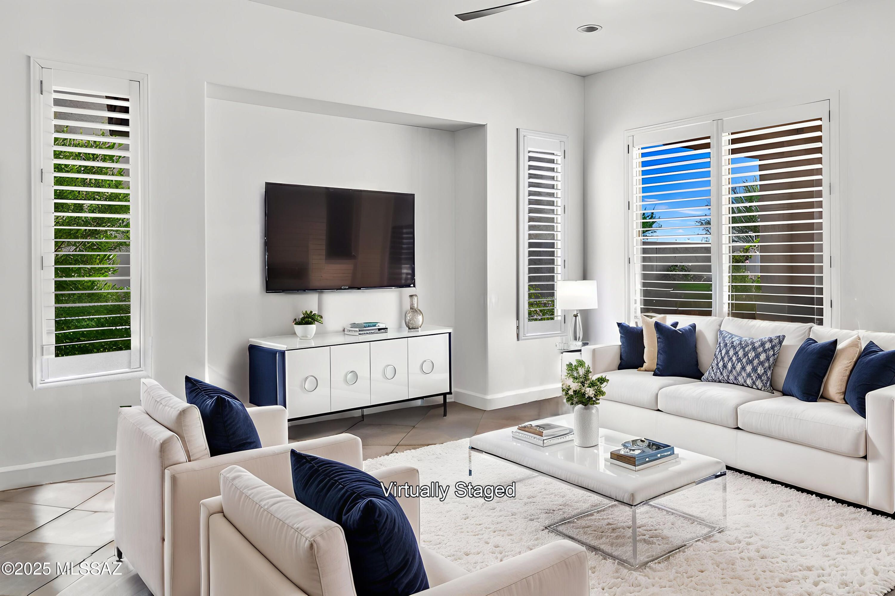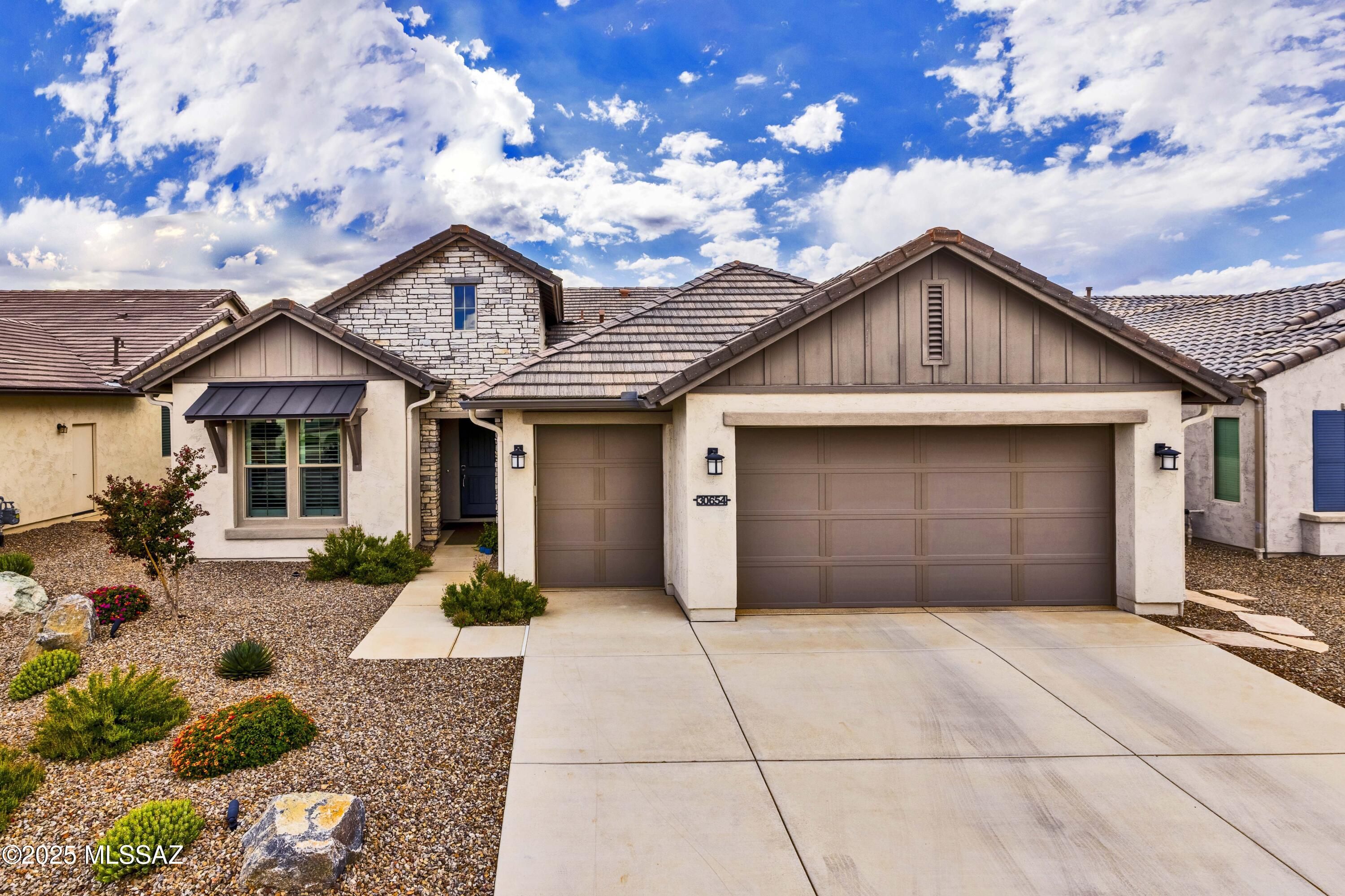 Stunning Bella floor plan with luxurious upgrades in the highly desirable active adult community of SaddleBrooke Ranch! This newer 2 BD / 2.5 BA + Den home offers open-concept living with ceramic tile throughout, quartz countertops, wood shutters, and a convenient powder room. Impeccably maintained! The gourmet kitchen features stainless steel appliances, a pantry, a large island, and upgraded cabinetry. The spacious dining room includes additional cabinetry with quartz counters for extra storage and serving space. The primary suite is a private retreat with a large walk-in shower and built-in seating, dual sink vanity, separate make-up vanity, and an expansive walk-in closet. Enjoy a 2-car garage plus a golf cart garage with epoxy flooring.
