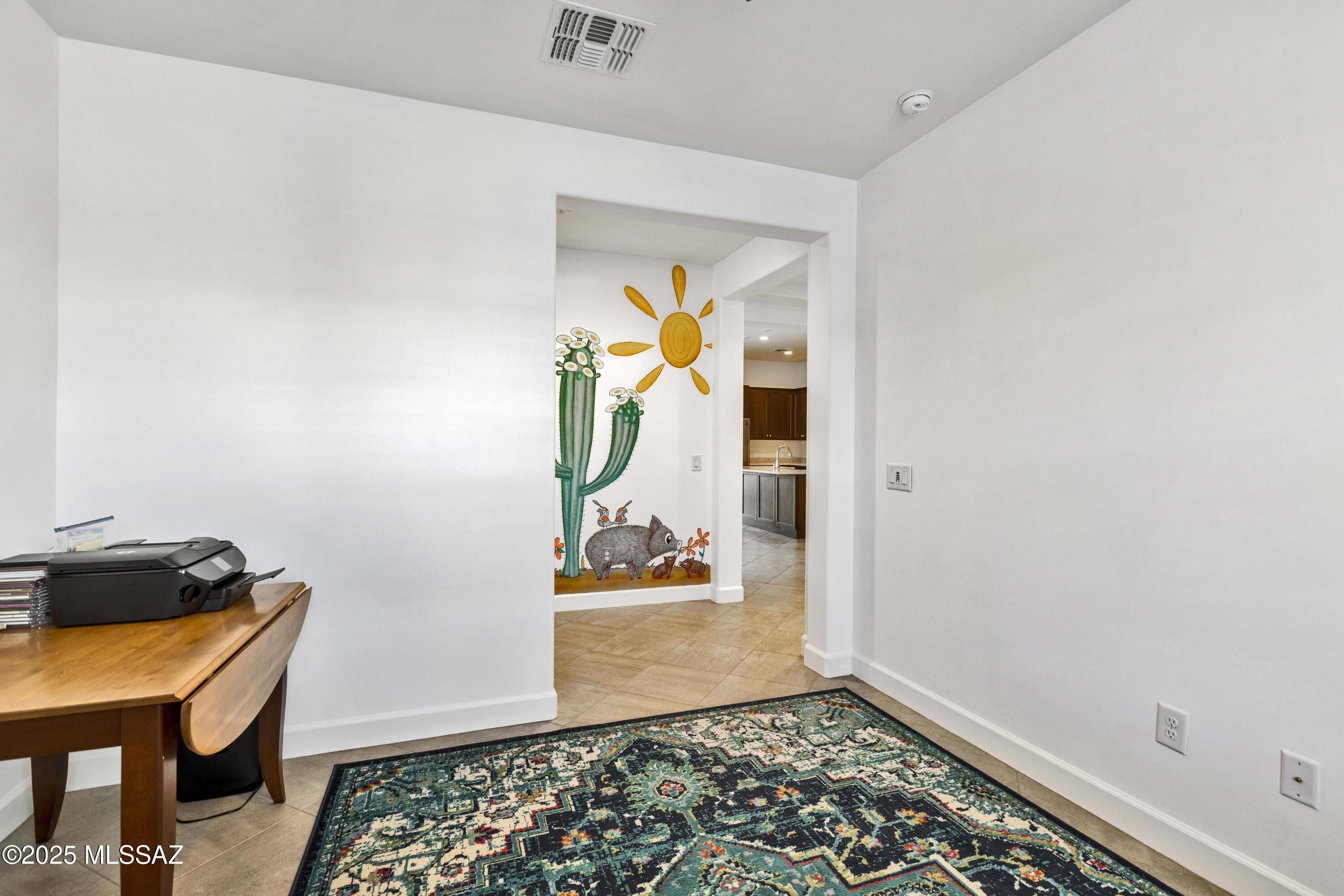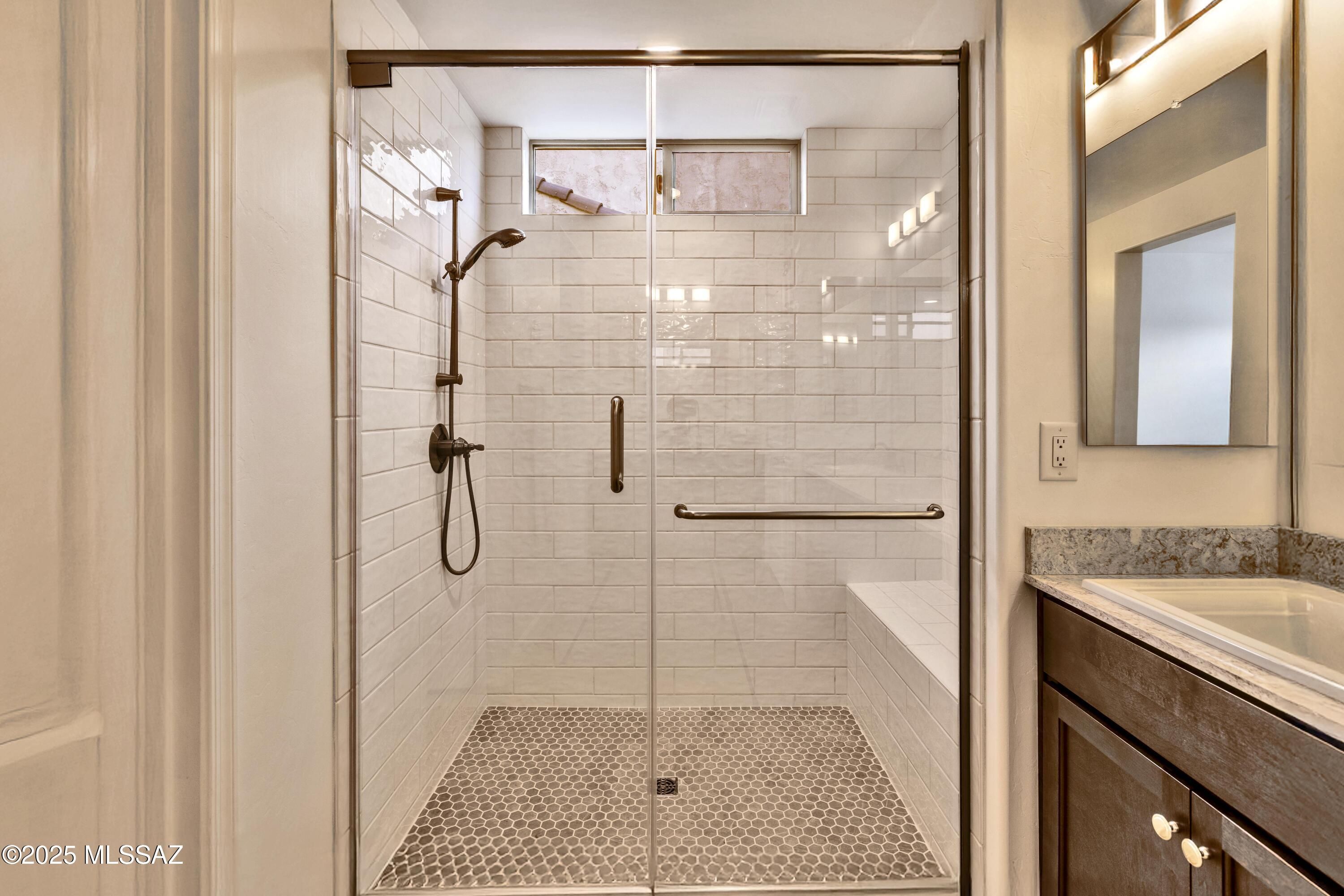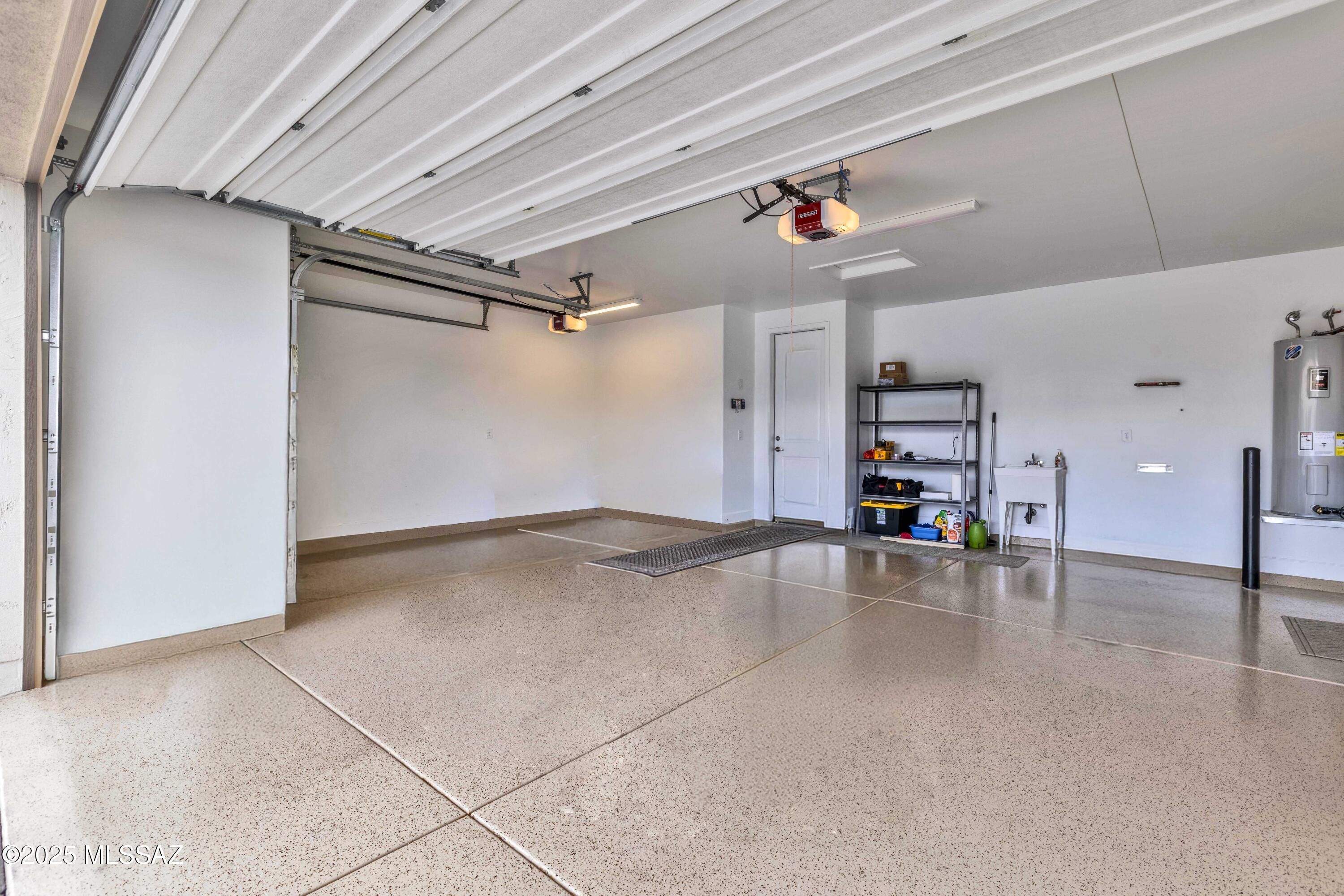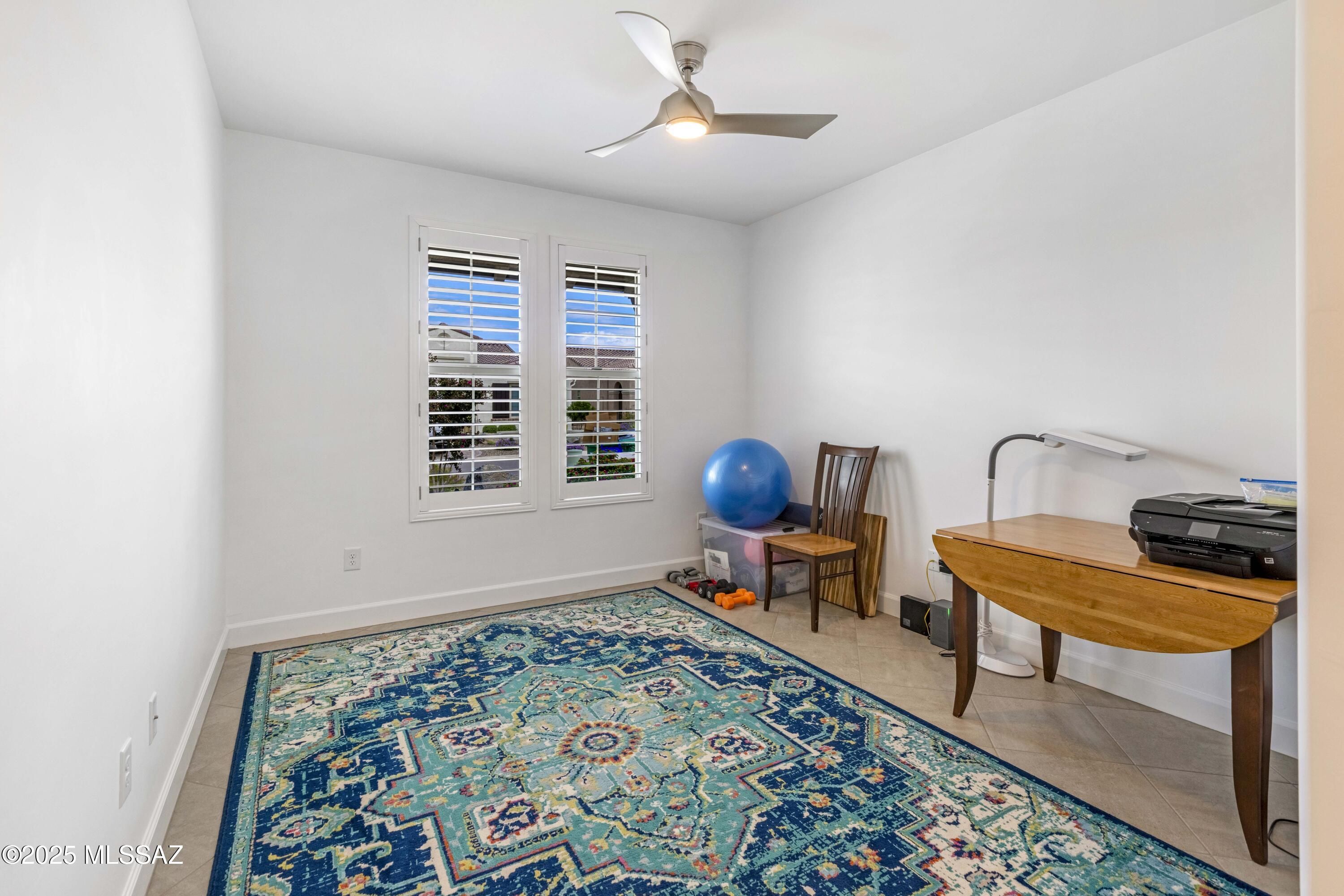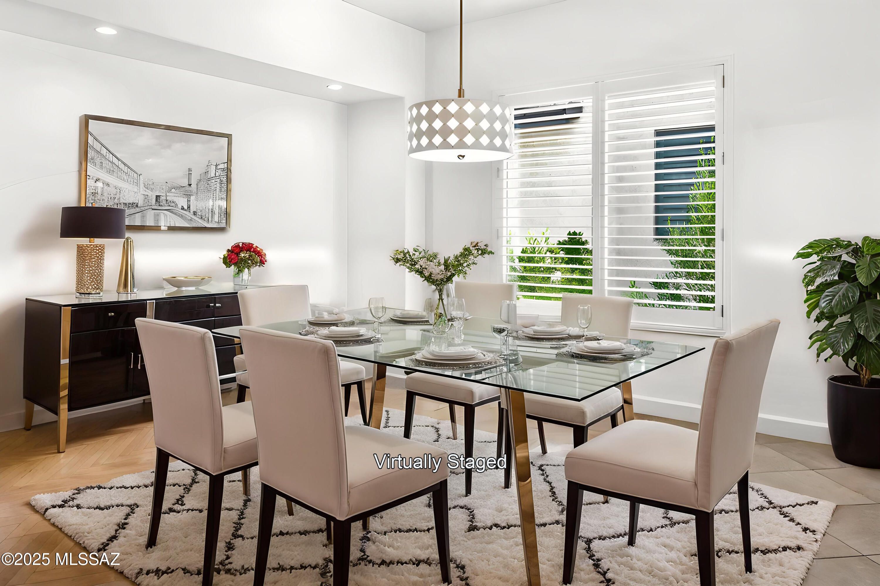 Stunning Bella floor plan with luxurious upgrades in the highly desirable active adult community of SaddleBrooke Ranch! This newer 2 BD / 2.5 BA + Den home offers open-concept living with ceramic tile throughout, quartz countertops, wood shutters, and a convenient powder room. Impeccably maintained! The gourmet kitchen features stainless steel appliances, a pantry, a large island, and upgraded cabinetry. The spacious dining room includes additional cabinetry with quartz counters for extra storage and serving space. The primary suite is a private retreat with a large walk-in shower and built-in seating, dual sink vanity, separate make-up vanity, and an expansive walk-in closet. Enjoy a 2-car garage plus a golf cart garage with epoxy flooring.